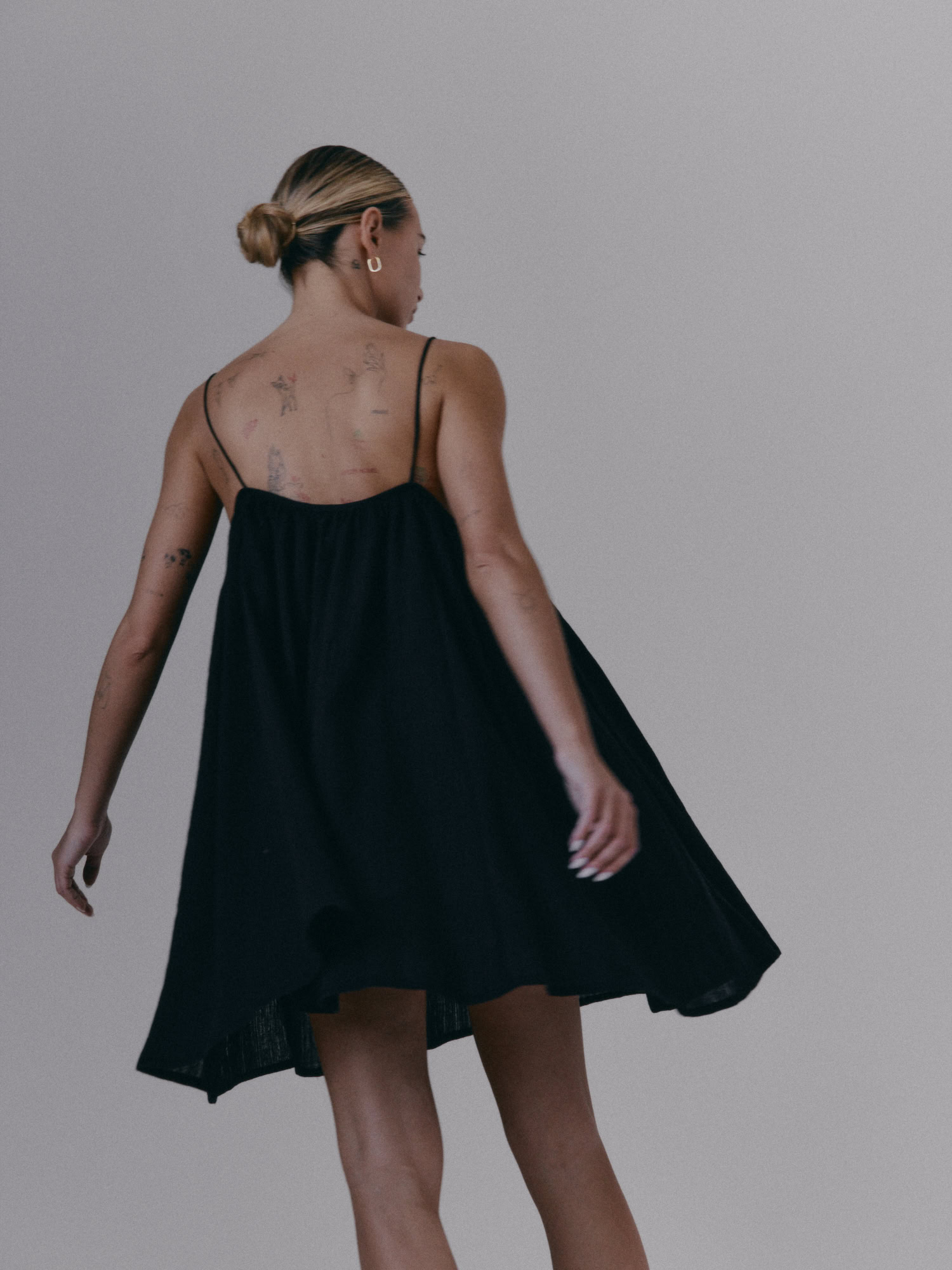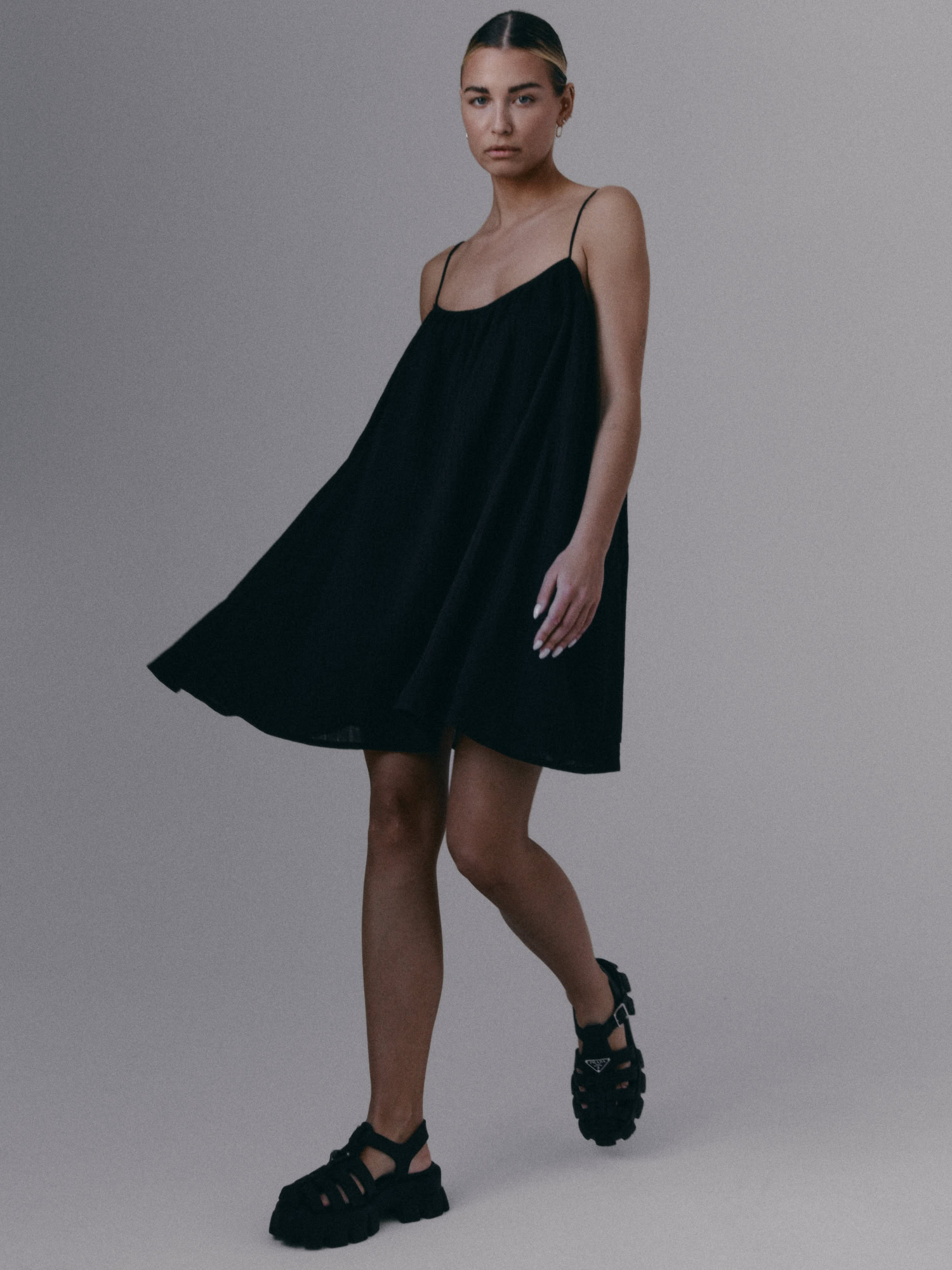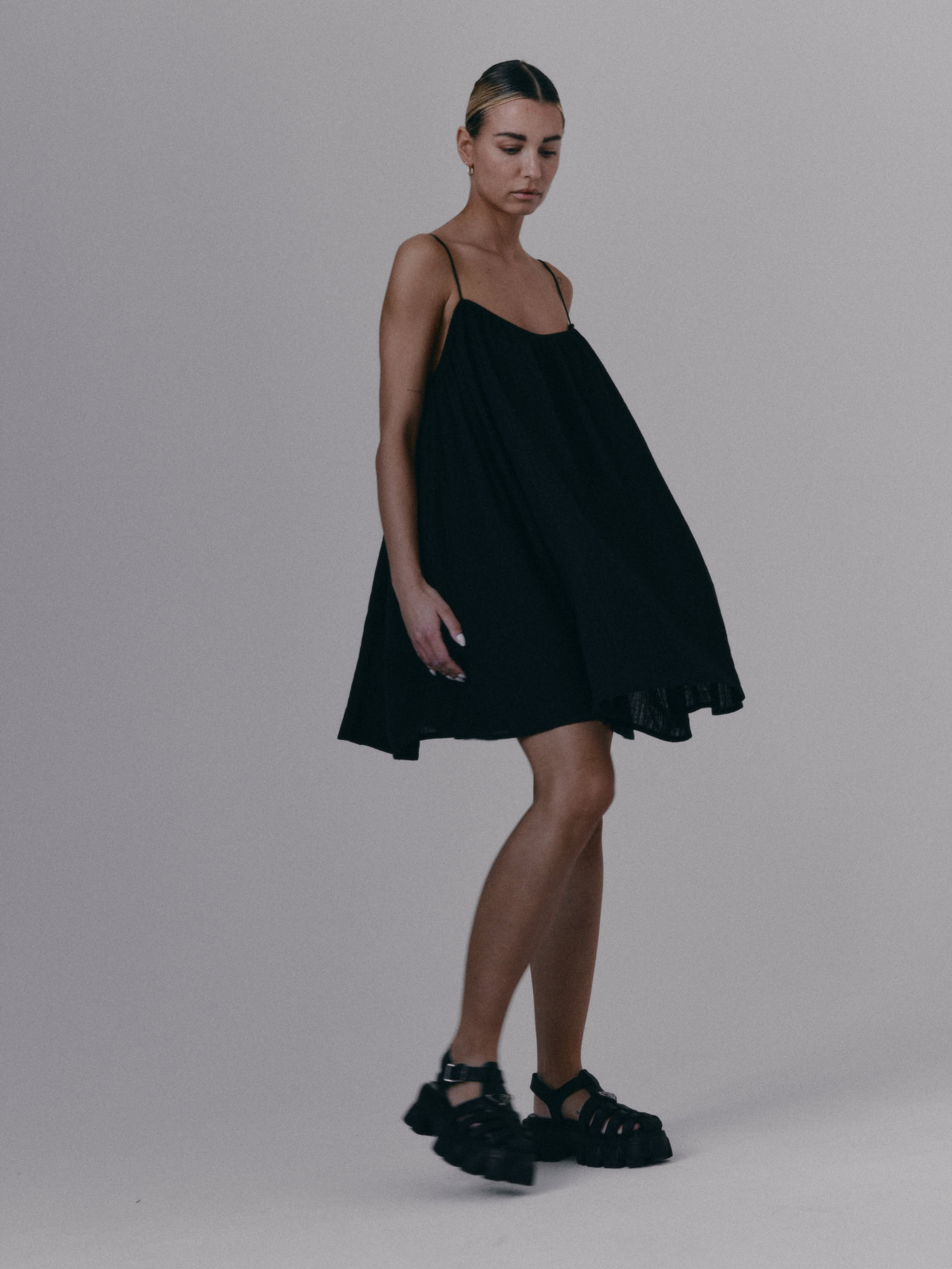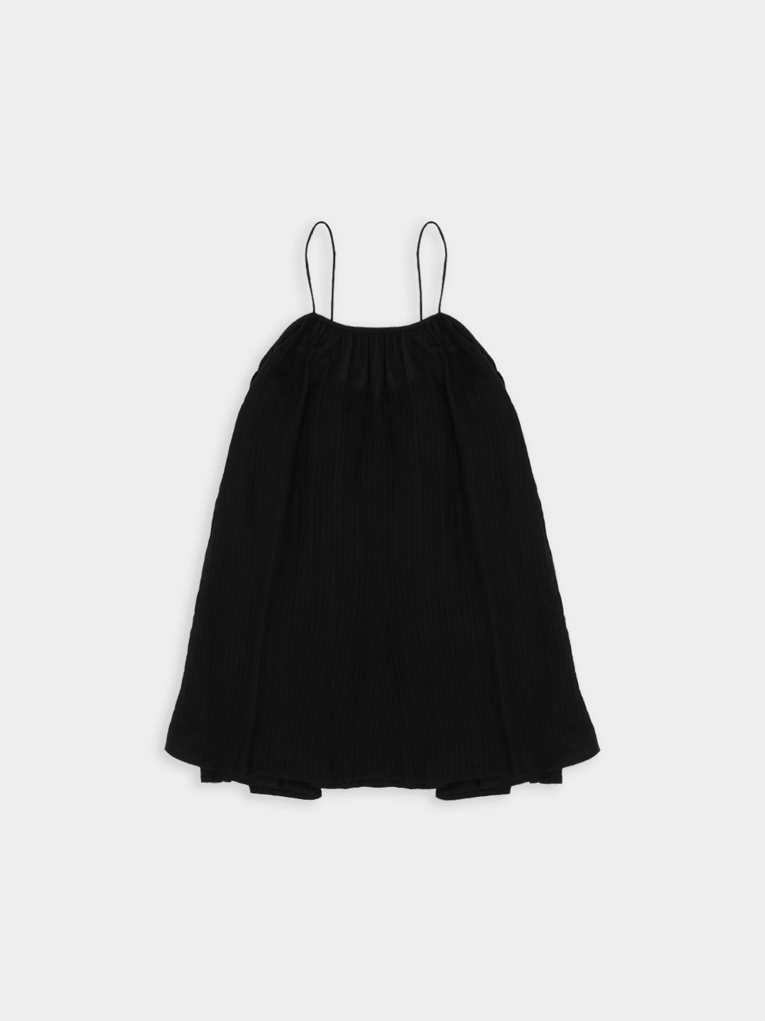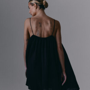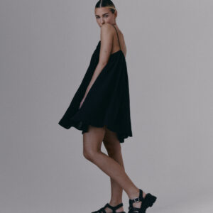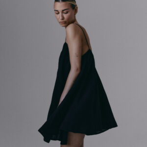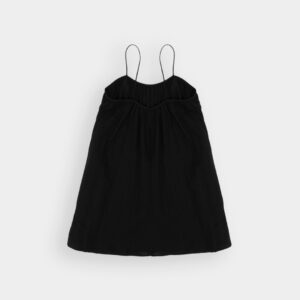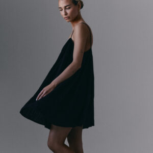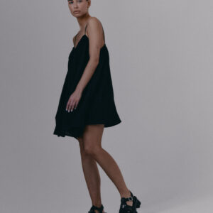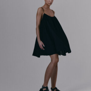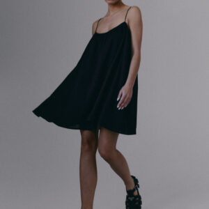 Krótka, zwiewna sukienka na bardzo cienkich ramiączkach. Delikatna guma wszyta przy dekolcie pozwala na swobodne dopasowanie się do sylwetki.
