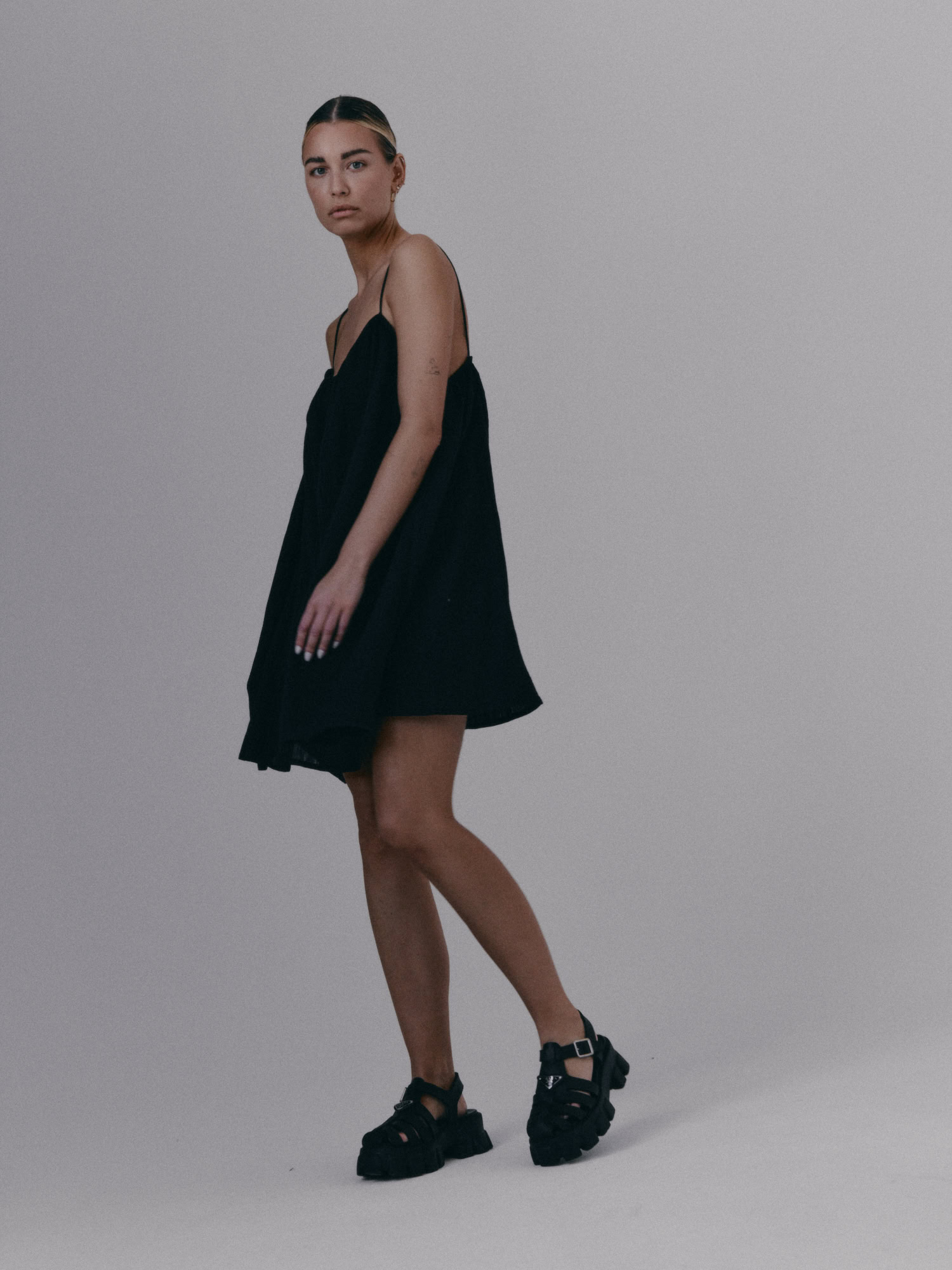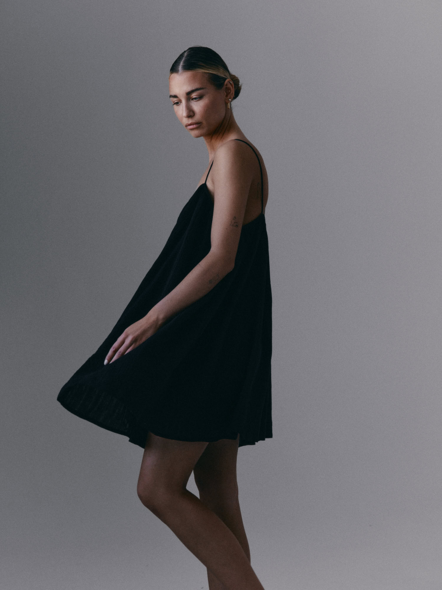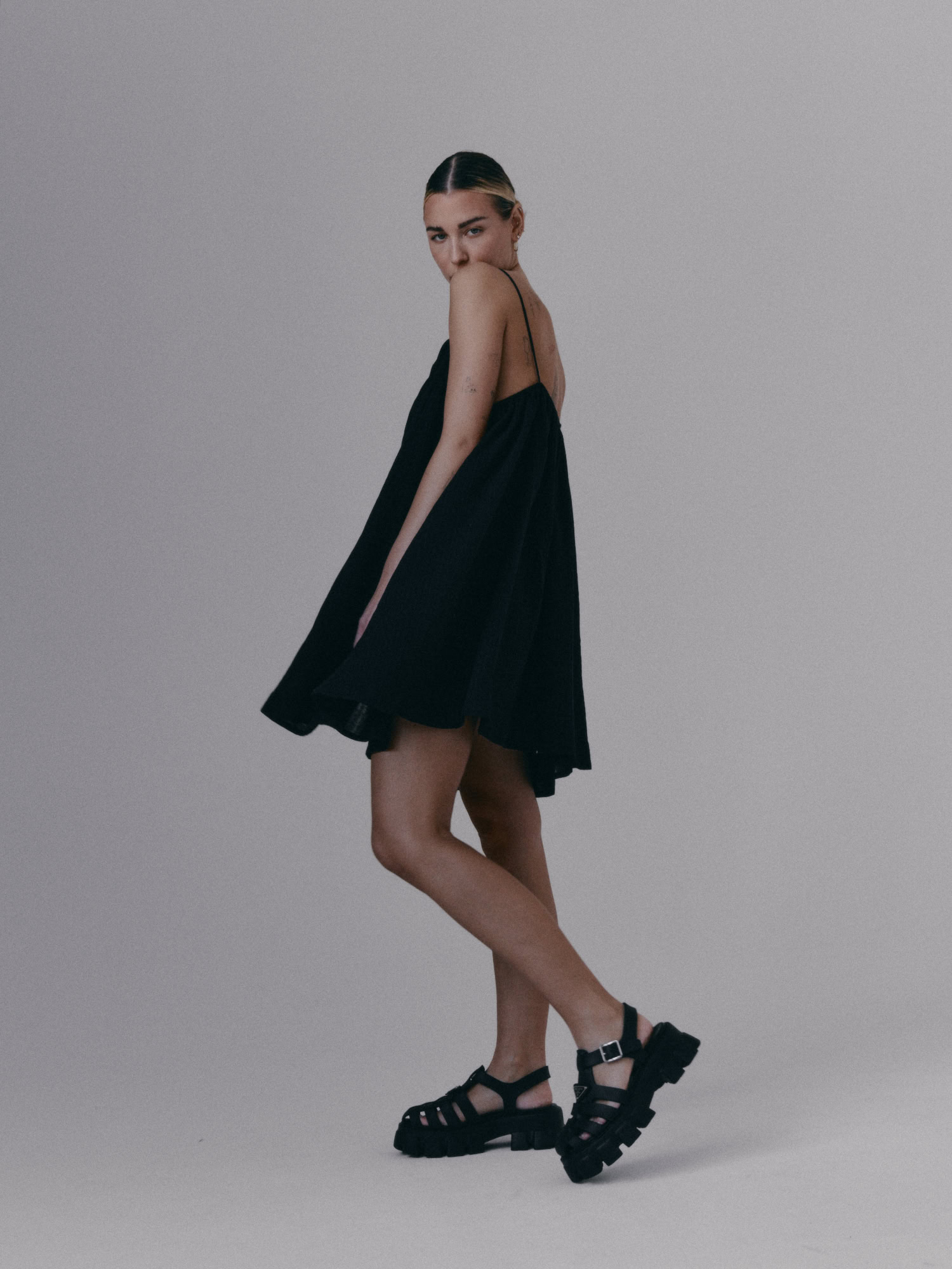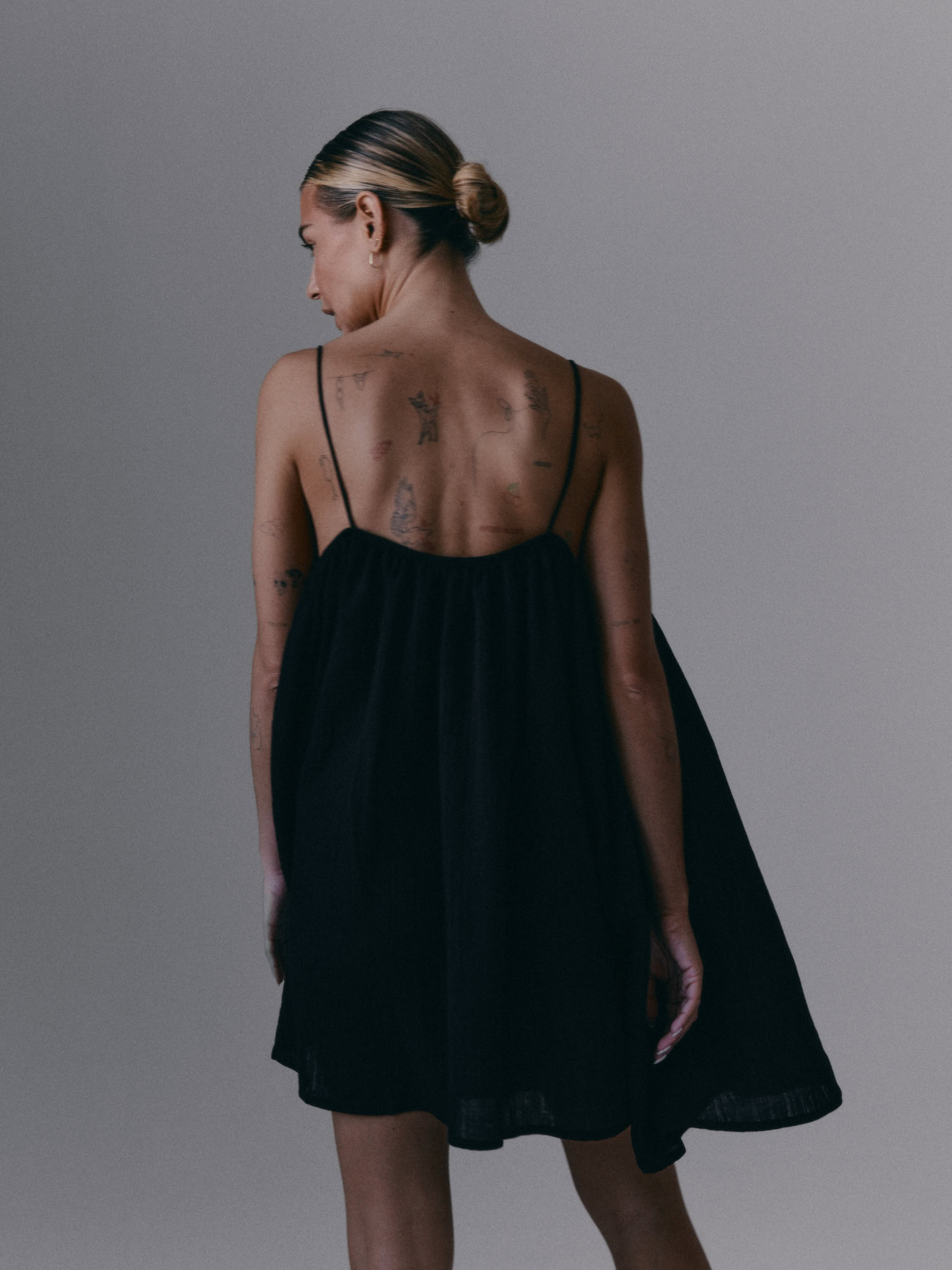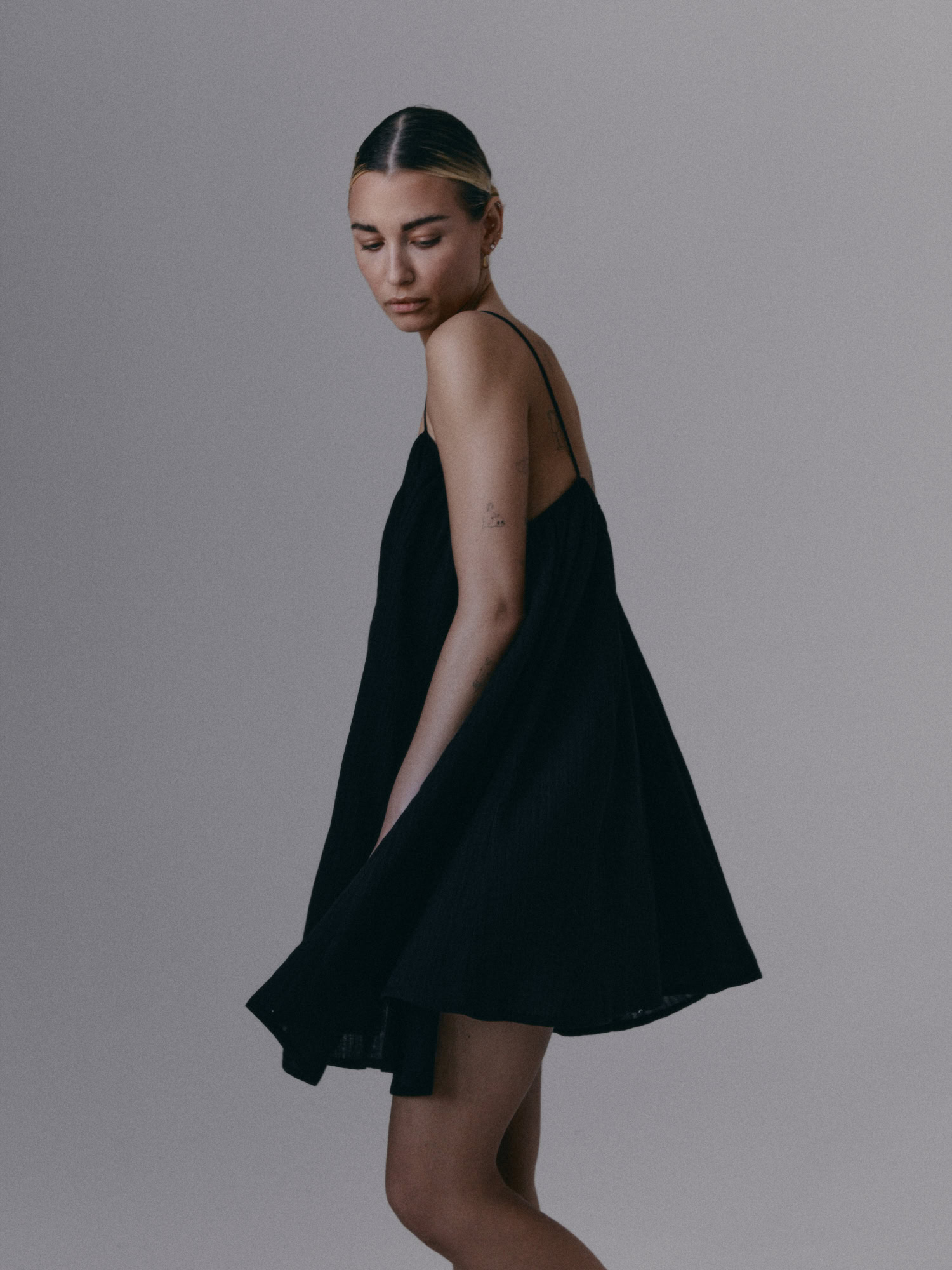 Krótka, zwiewna sukienka na bardzo cienkich ramiączkach. Delikatna guma wszyta przy dekolcie pozwala na swobodne dopasowanie się do sylwetki.