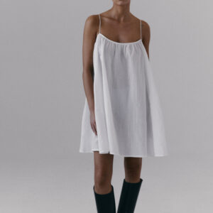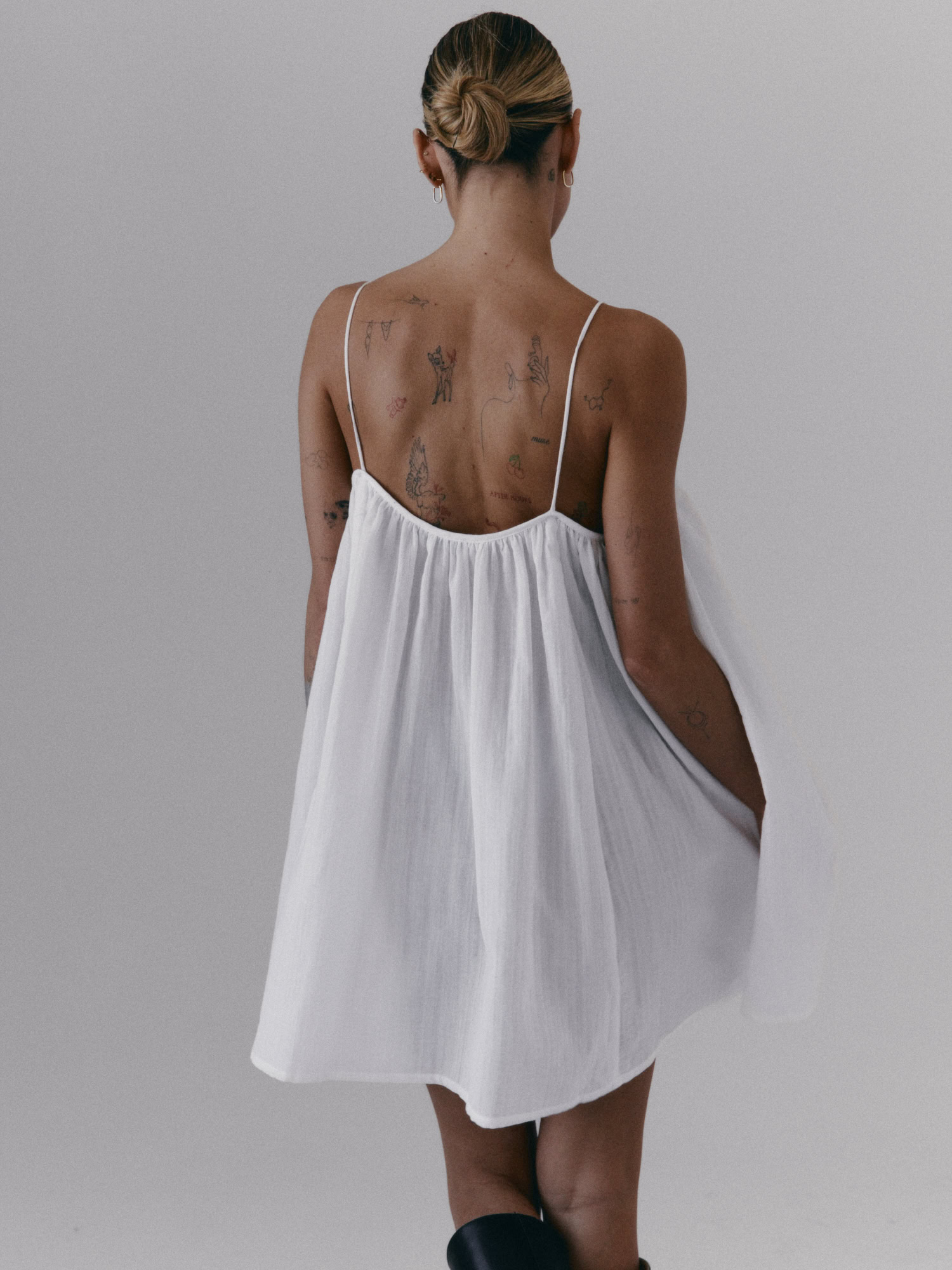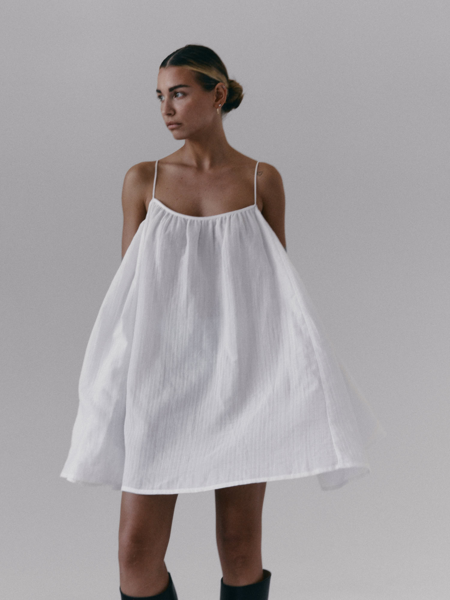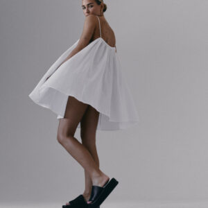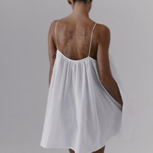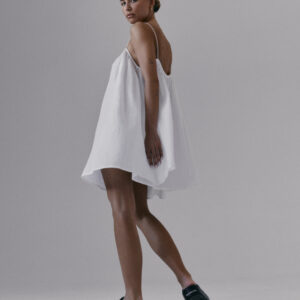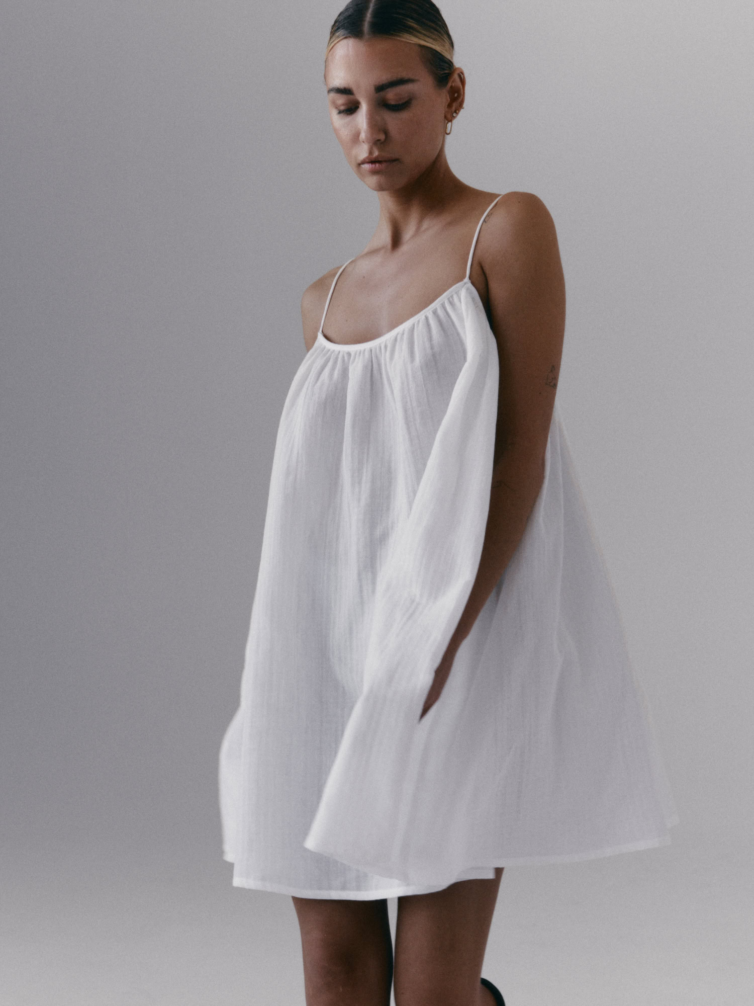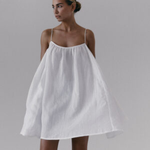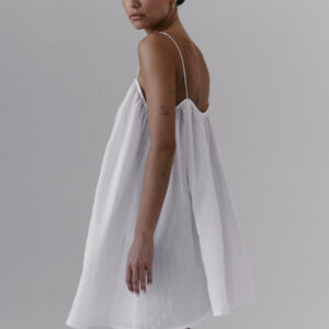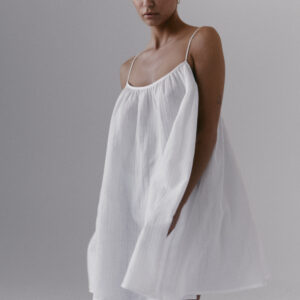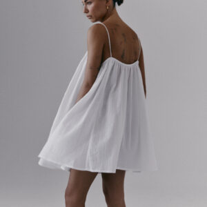 Krótka, zwiewna sukienka na bardzo cienkich ramiączkach. Delikatna guma wszyta przy dekolcie pozwala na swobodne dopasowanie się do sylwetki.