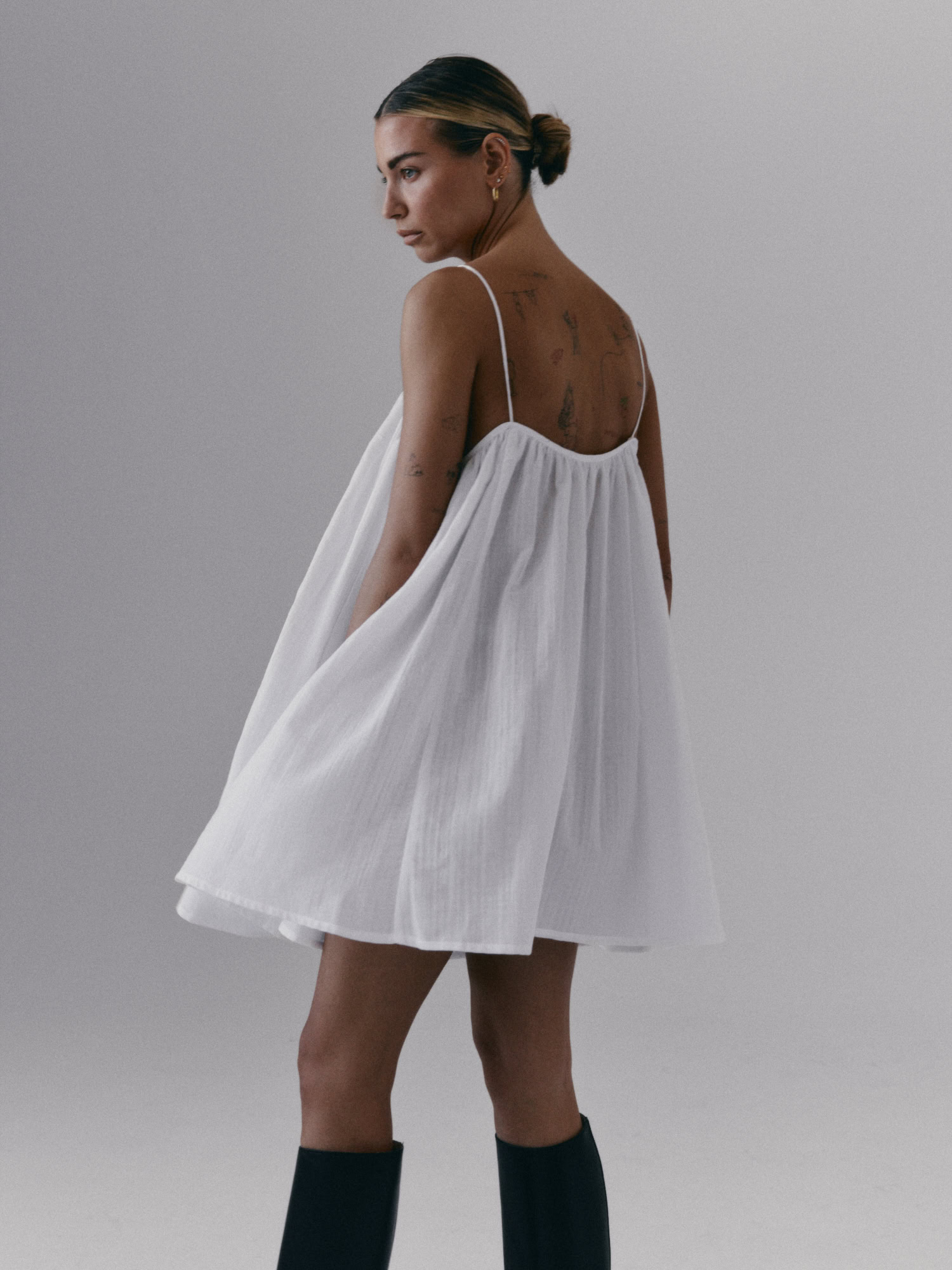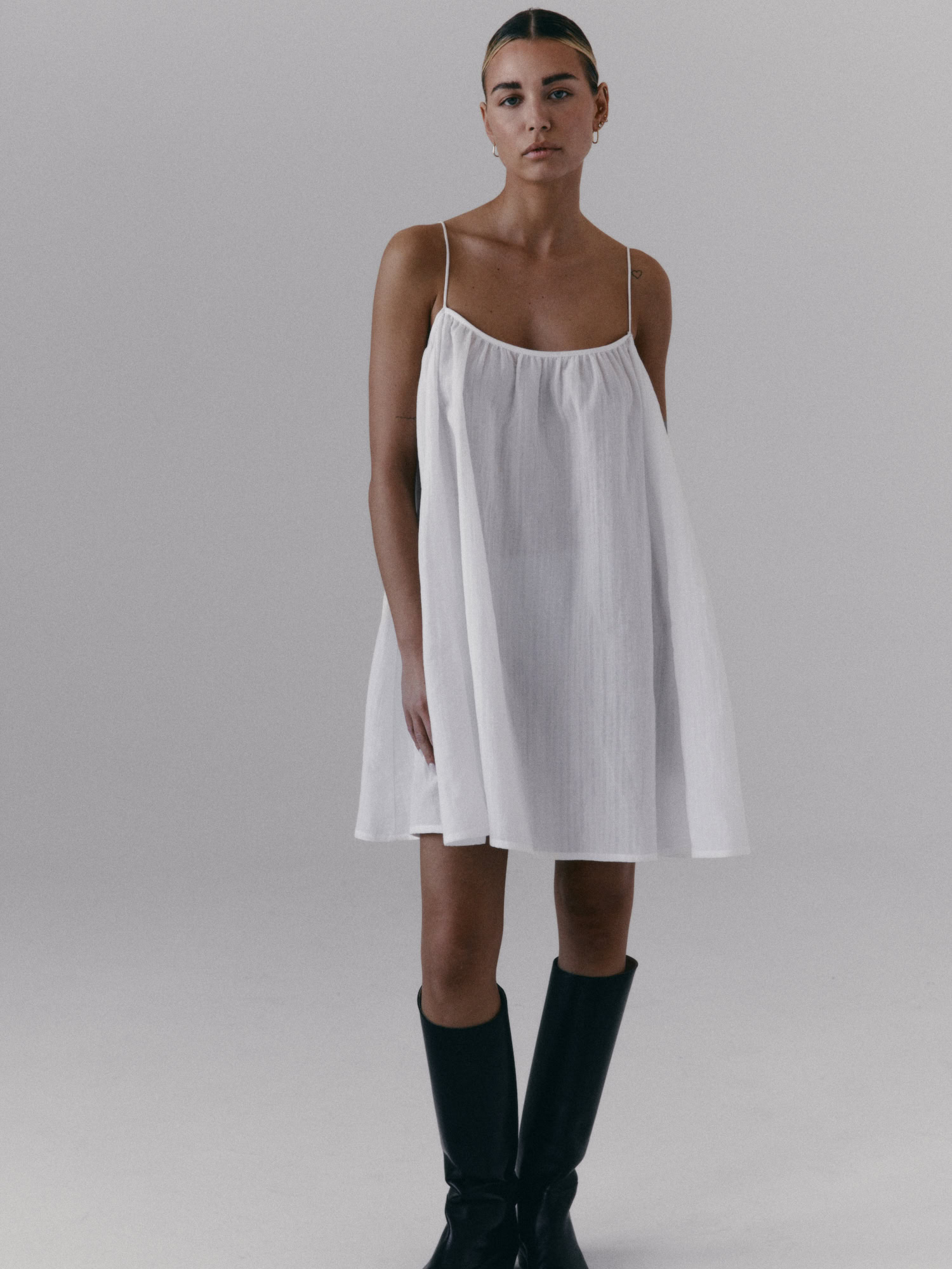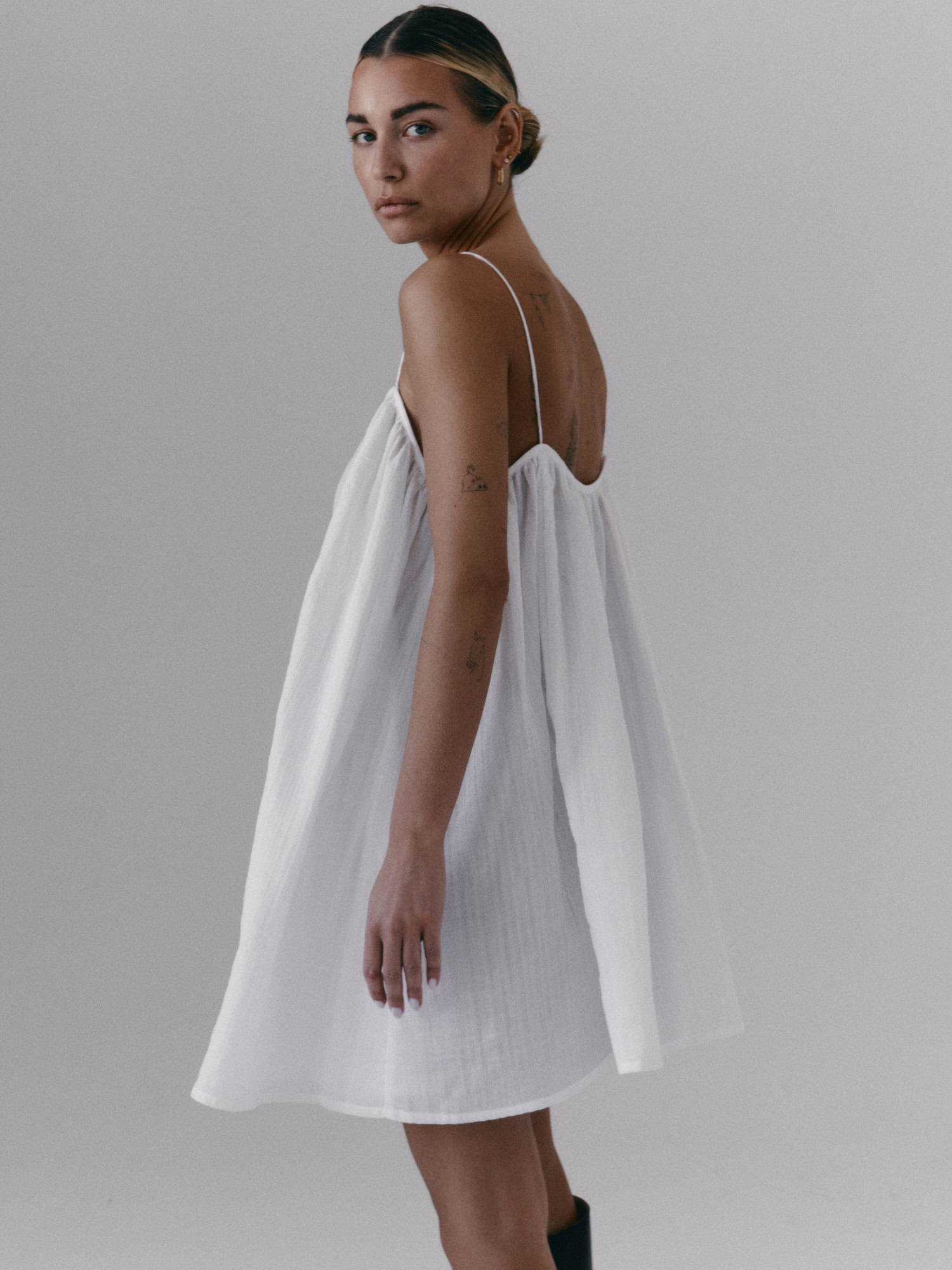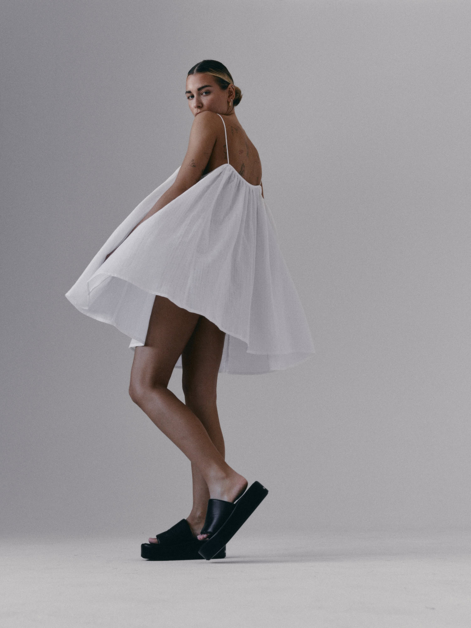 Krótka, zwiewna sukienka na bardzo cienkich ramiączkach. Delikatna guma wszyta przy dekolcie pozwala na swobodne dopasowanie się do sylwetki.