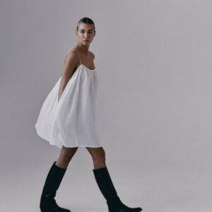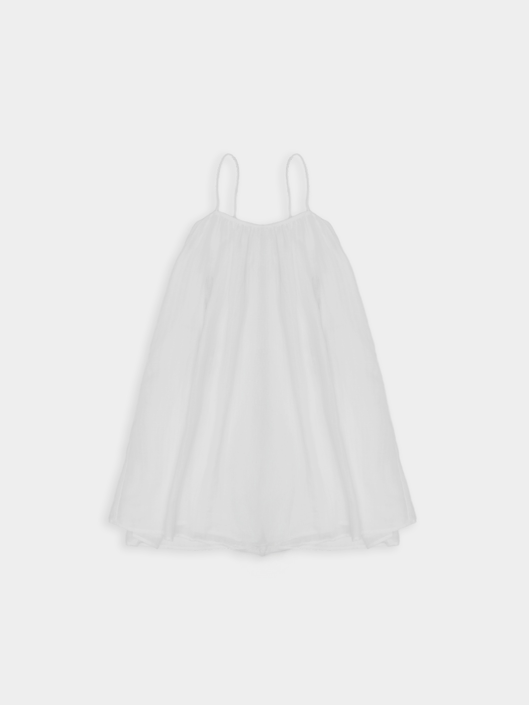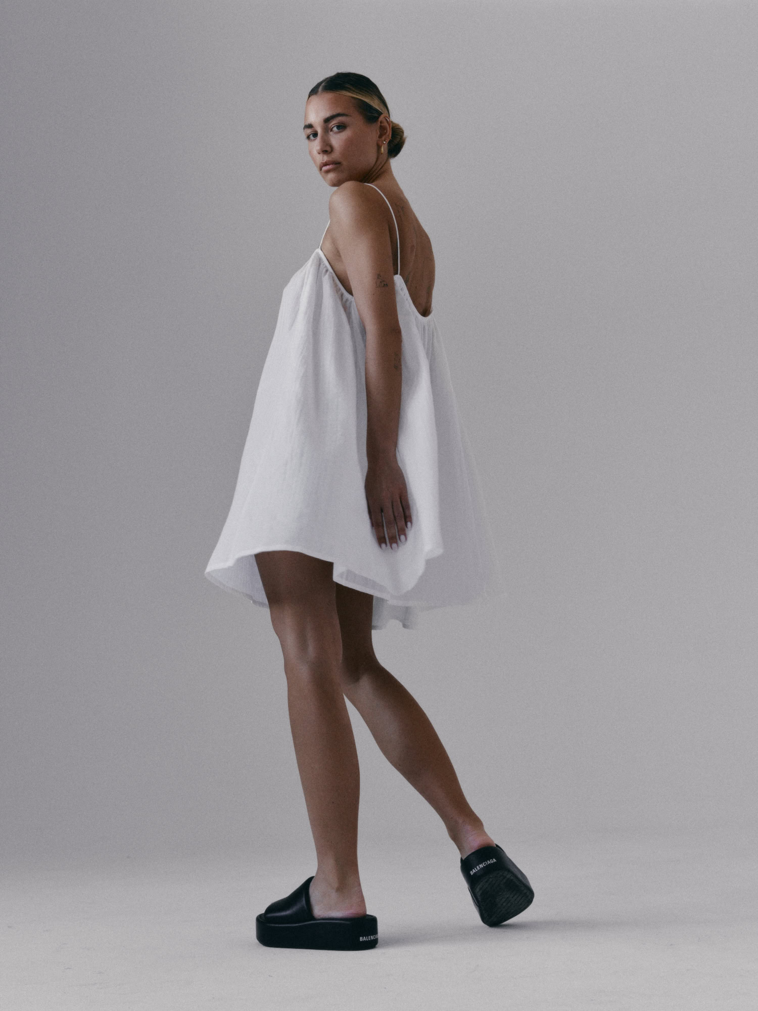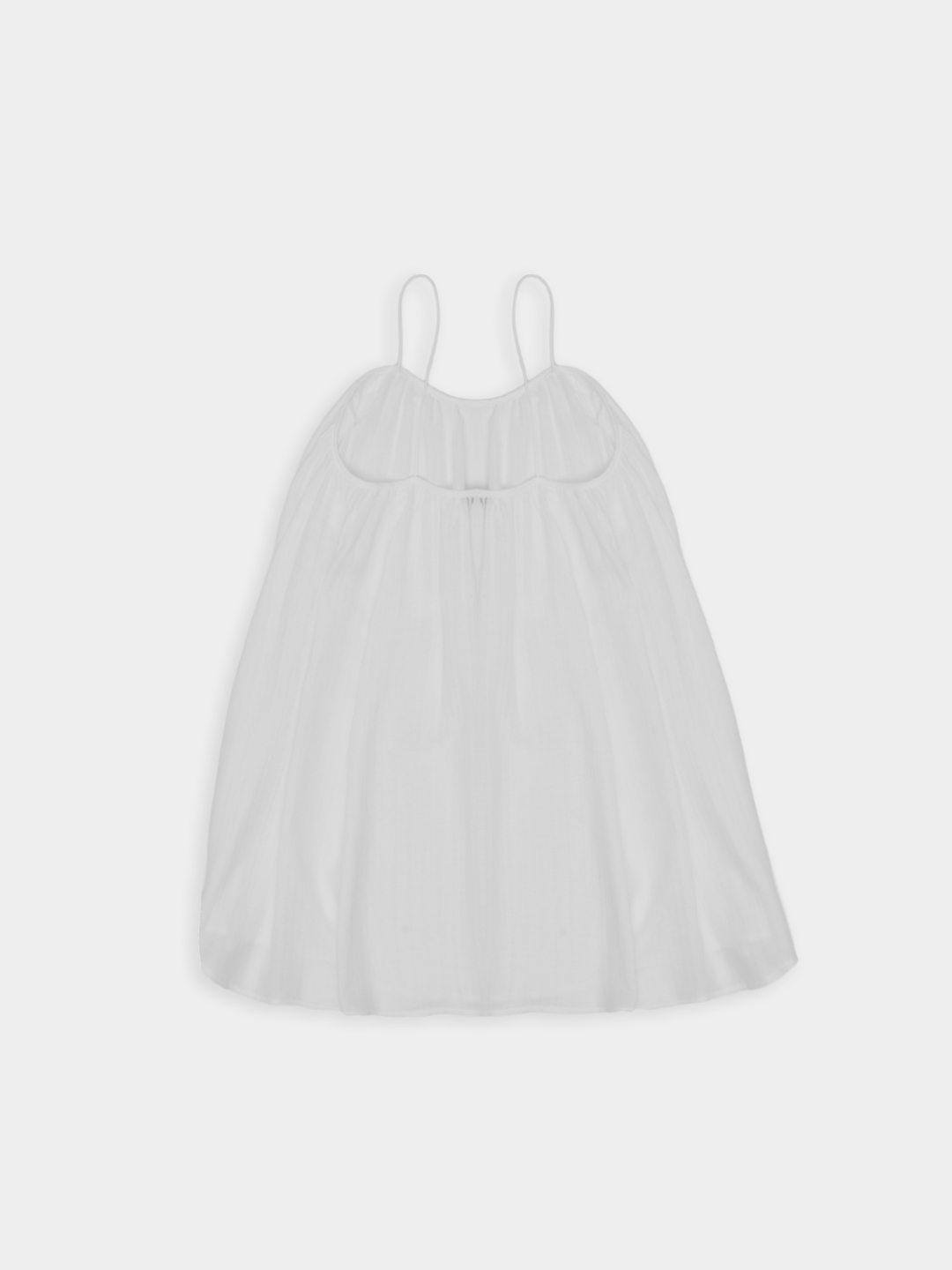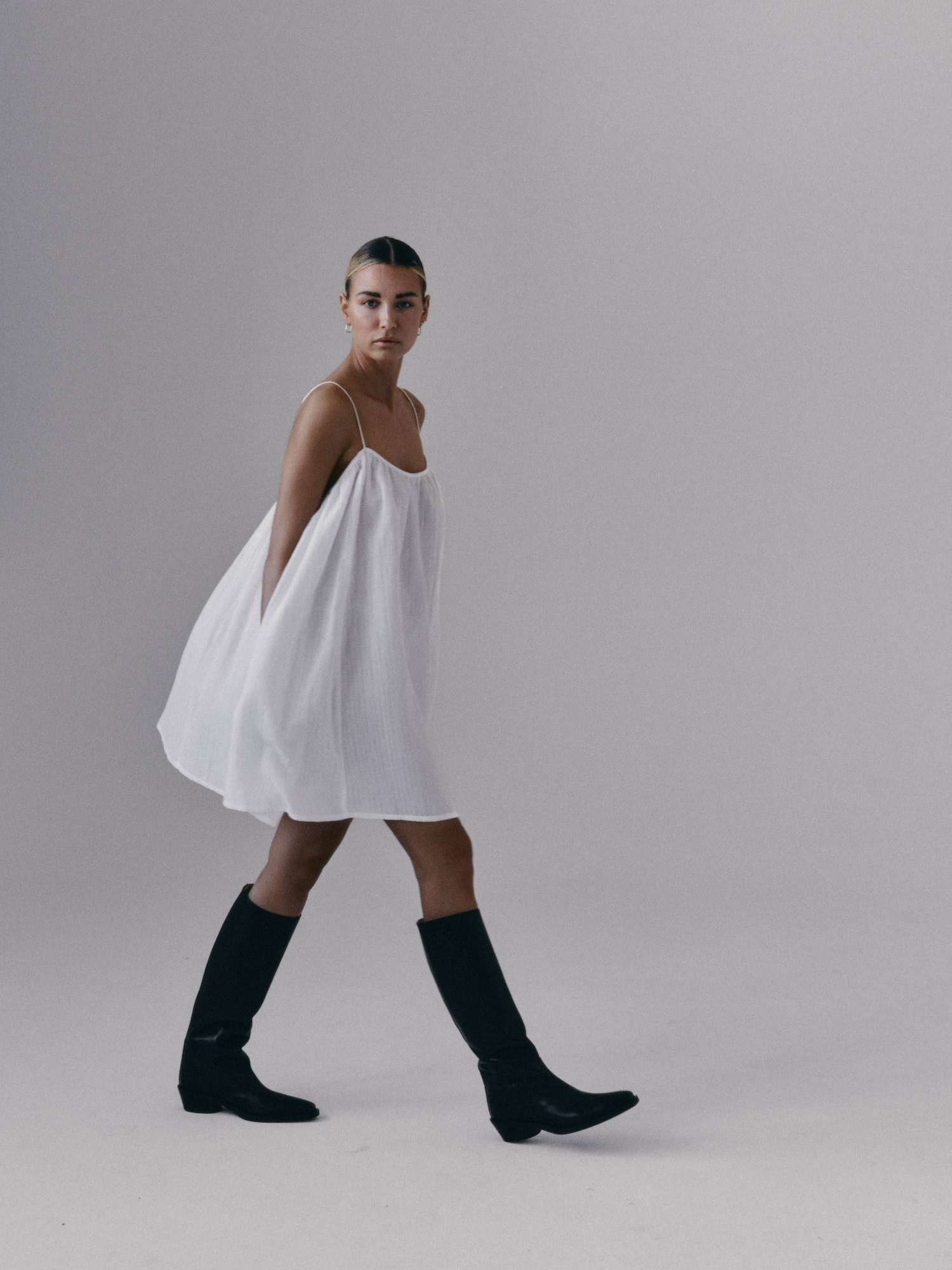 Krótka, zwiewna sukienka na bardzo cienkich ramiączkach. Delikatna guma wszyta przy dekolcie pozwala na swobodne dopasowanie się do sylwetki.
