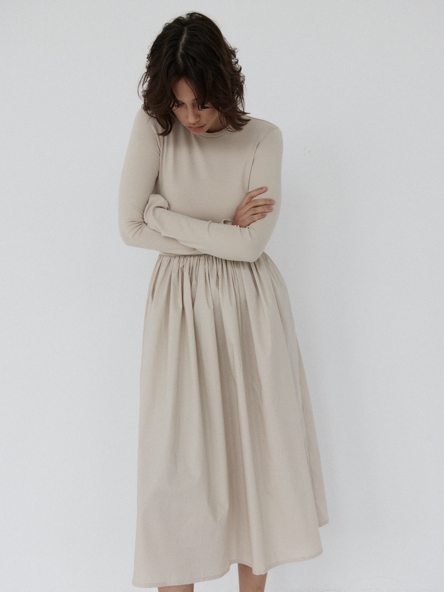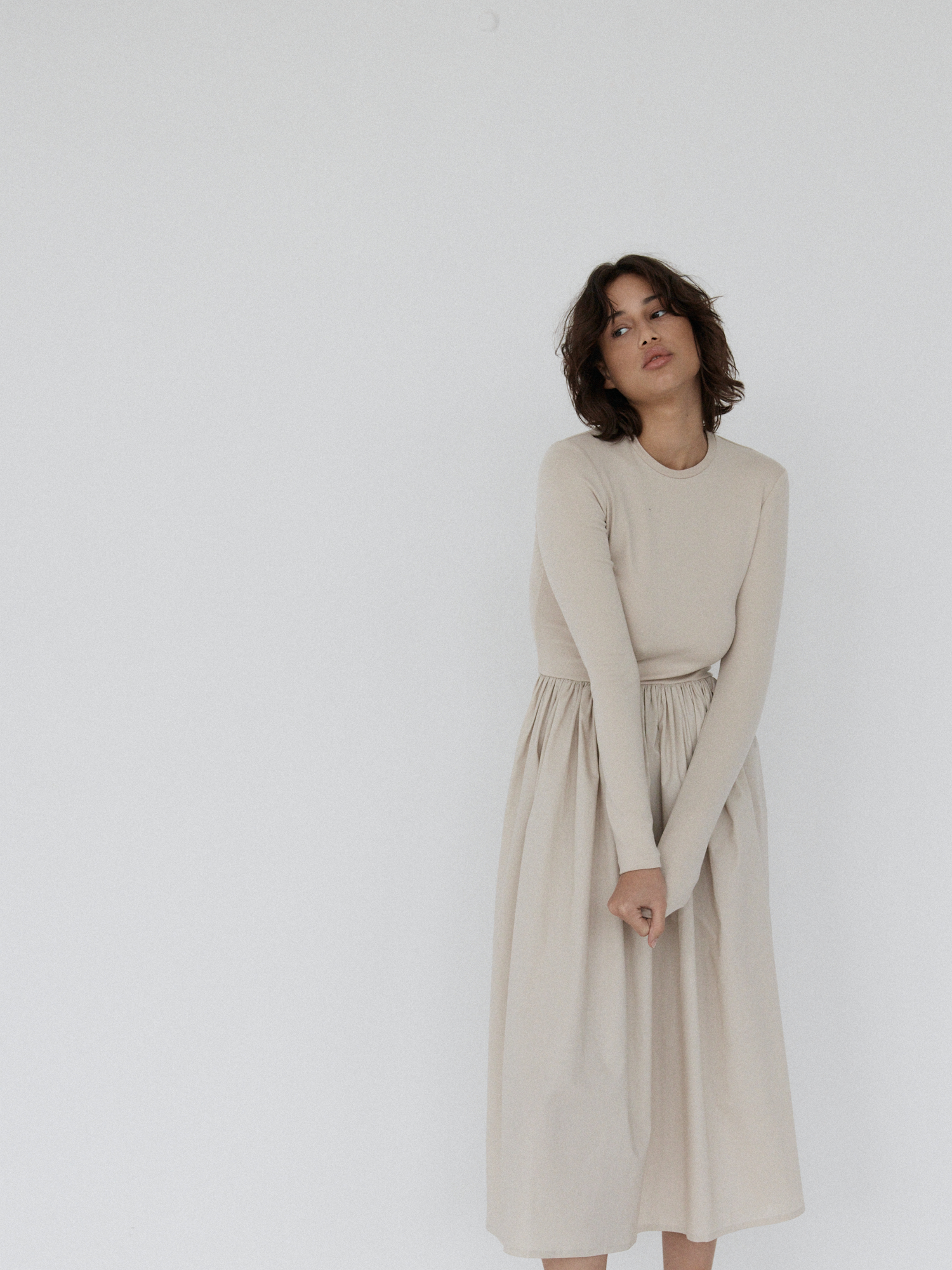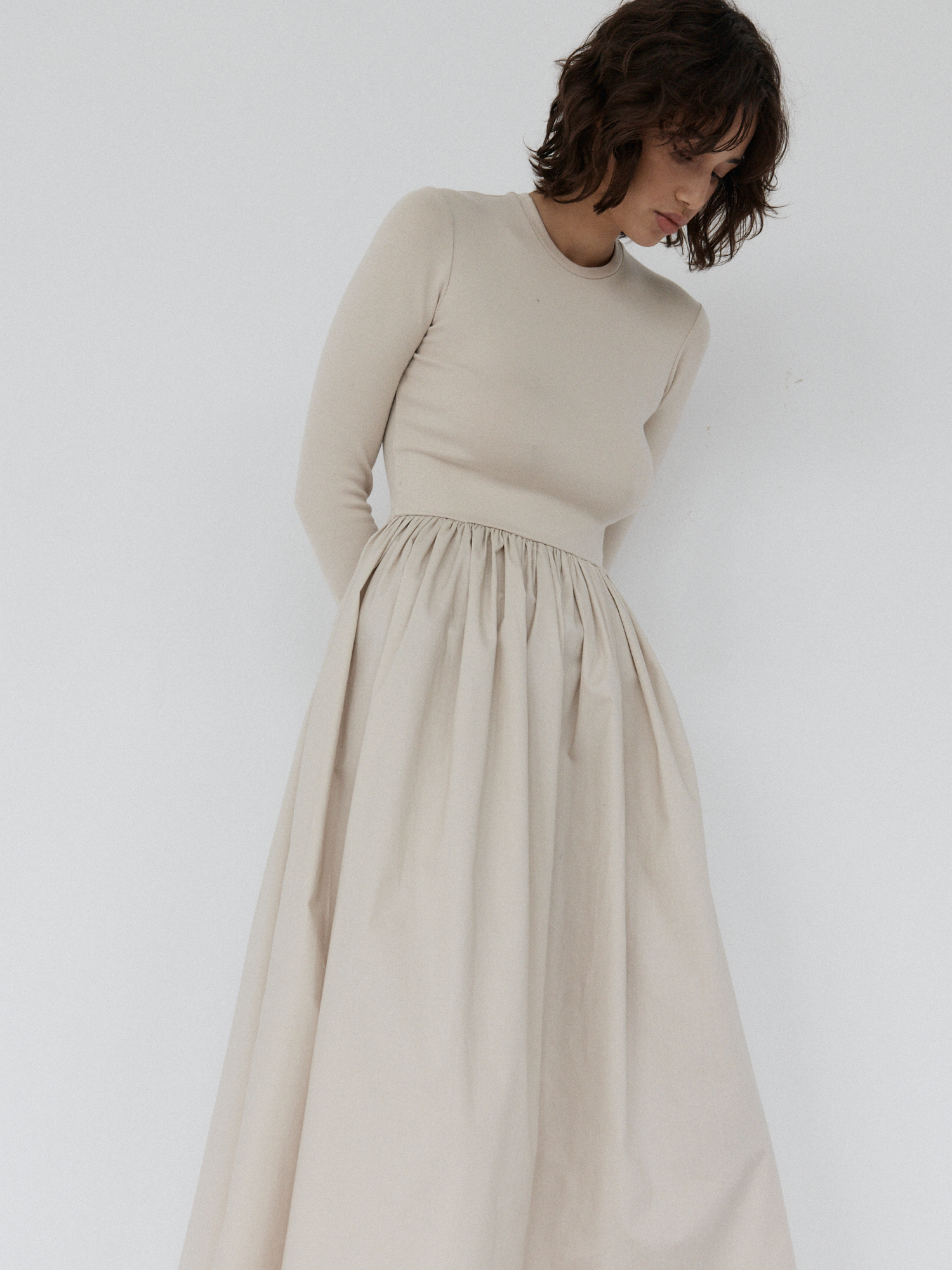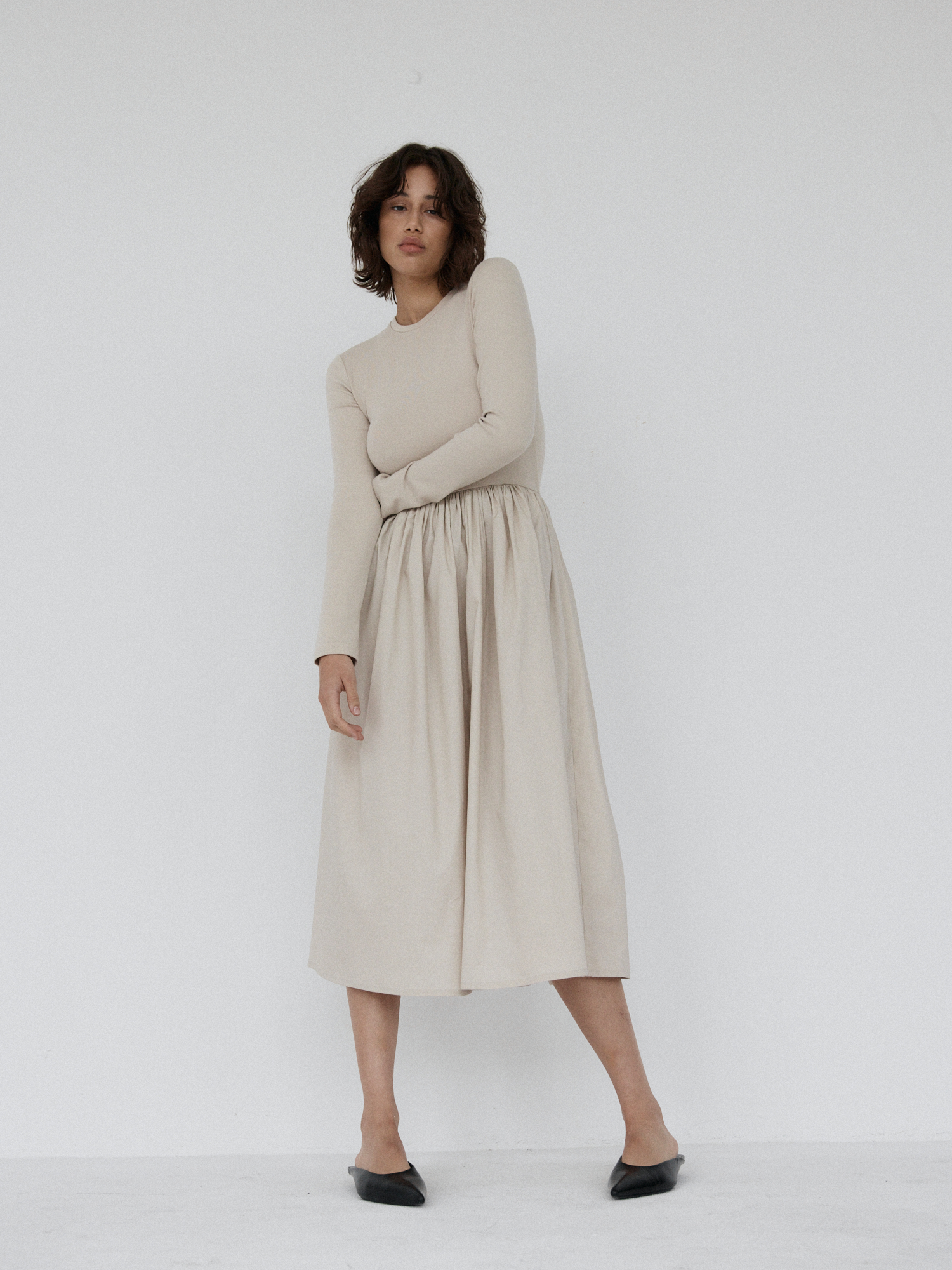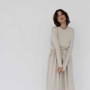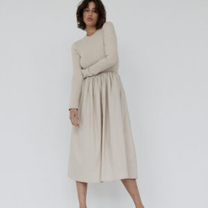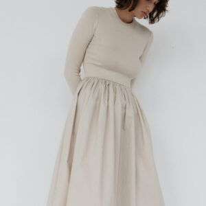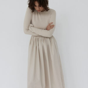 Minimalistyczna sukienka midi. Klasyczna, dopasowana góra z długim rękawem. Lekko rozkloszowany dół. Idealna zarówno na co dzień, jak i eleganckie okazje.