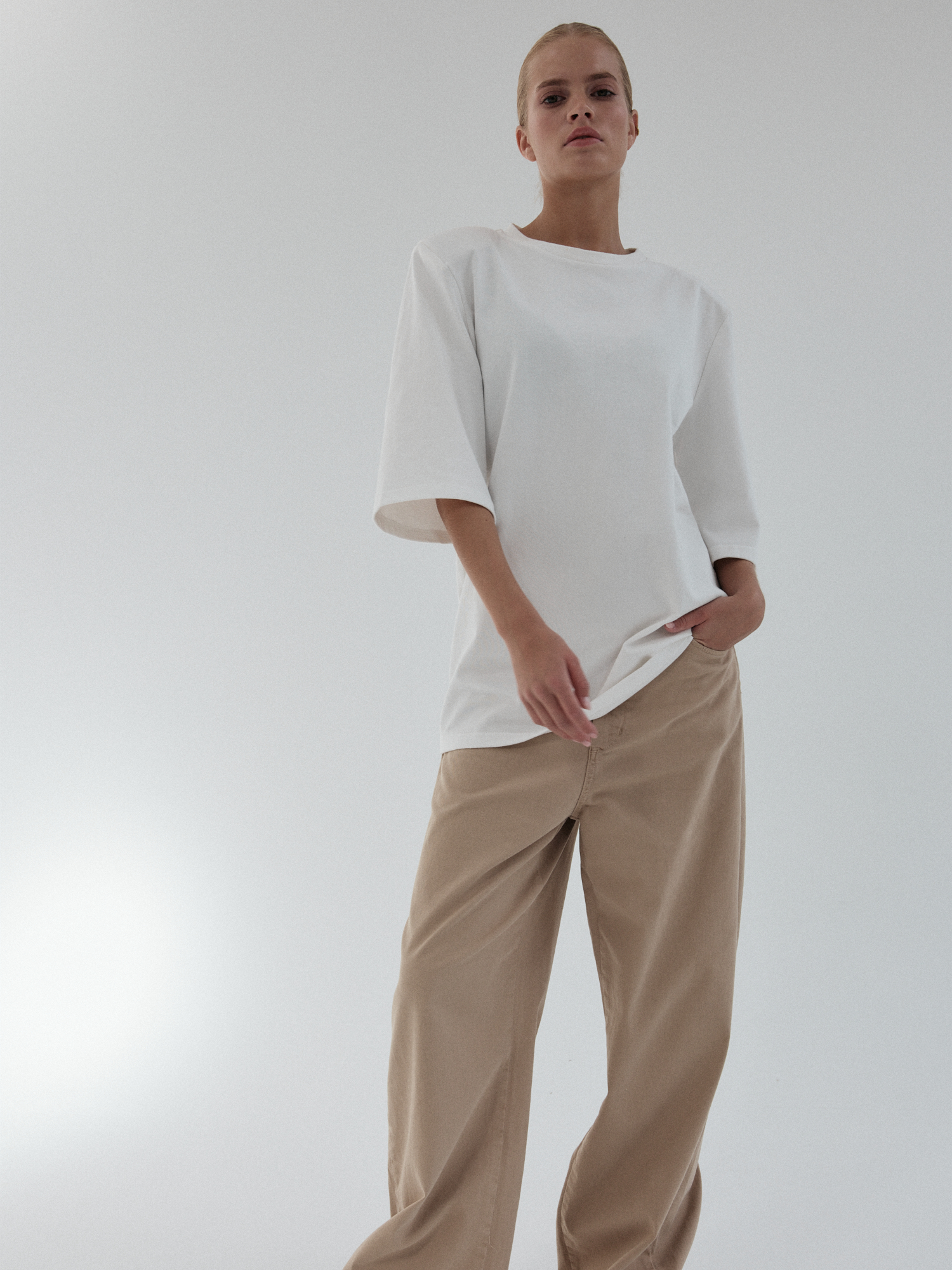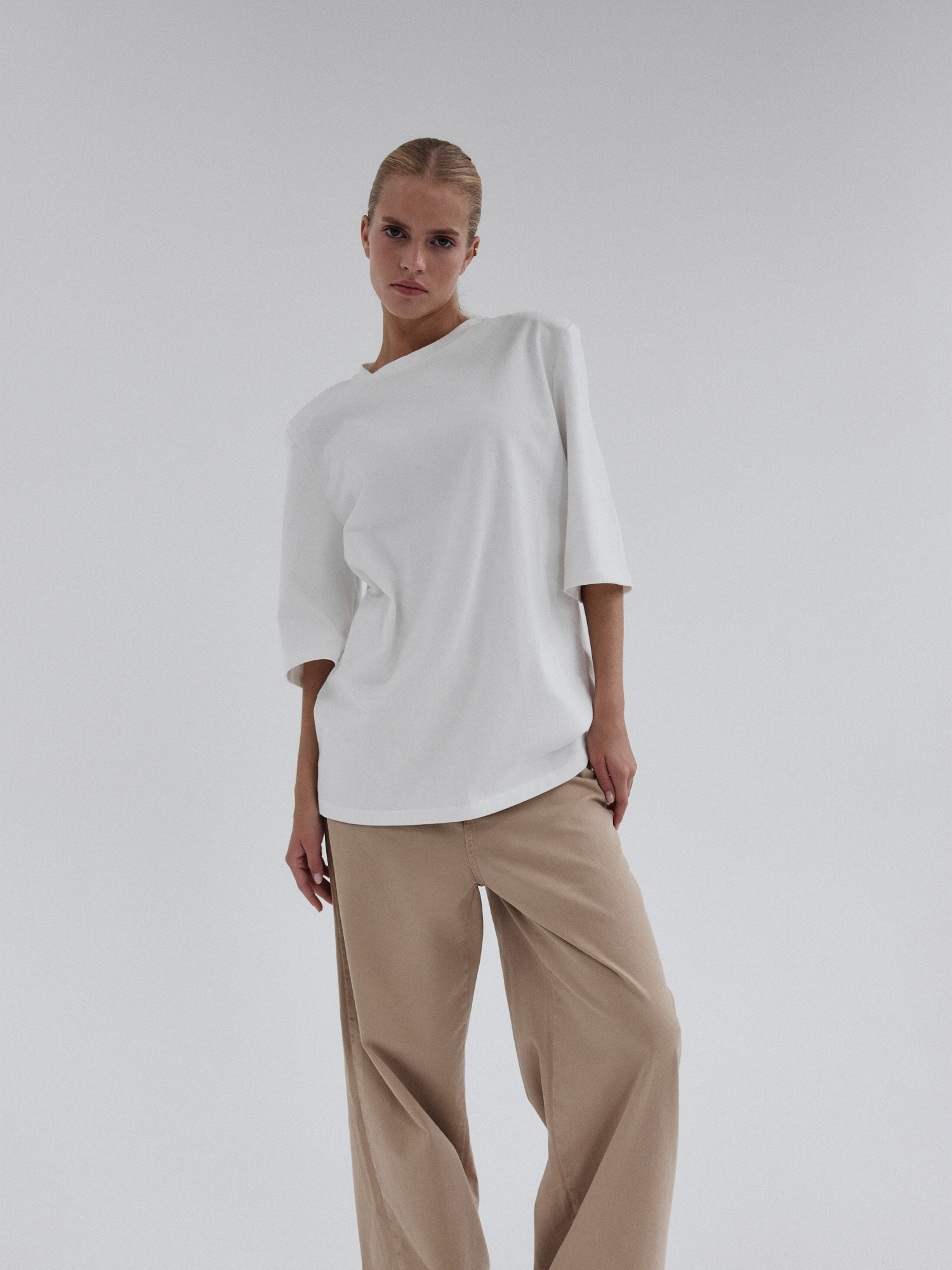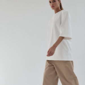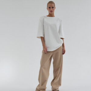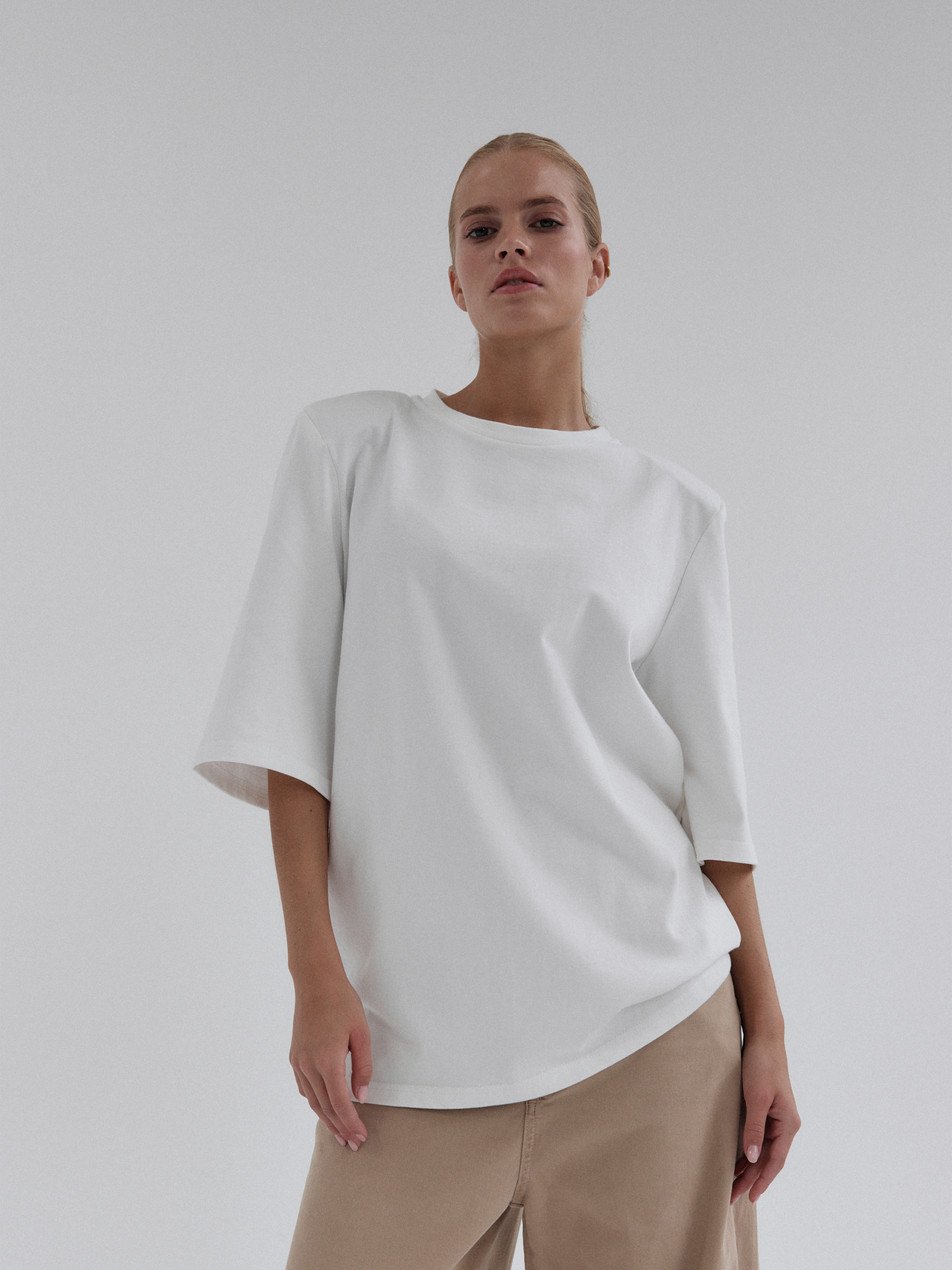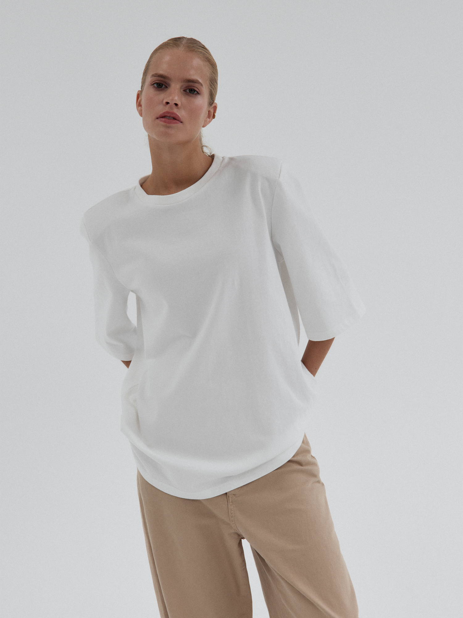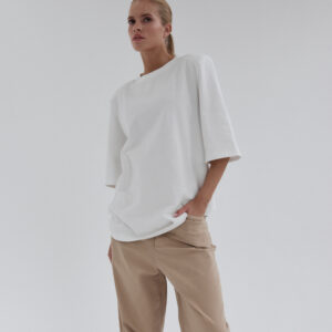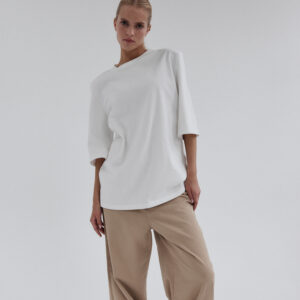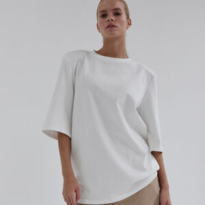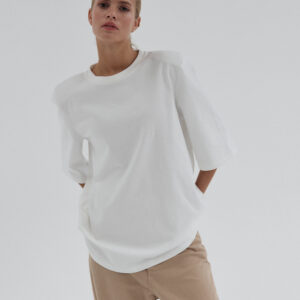 Oversize’owy t-shirt o pudełkowym kroju. Obszerne poduszki widocznie podkreślają linię ramion. T-shirt sprawdzi się zarówno w klasycznym zestawieniu na co dzień z jeansami, jak i w eleganckich stylizacjach z spodniami garniturowymi.