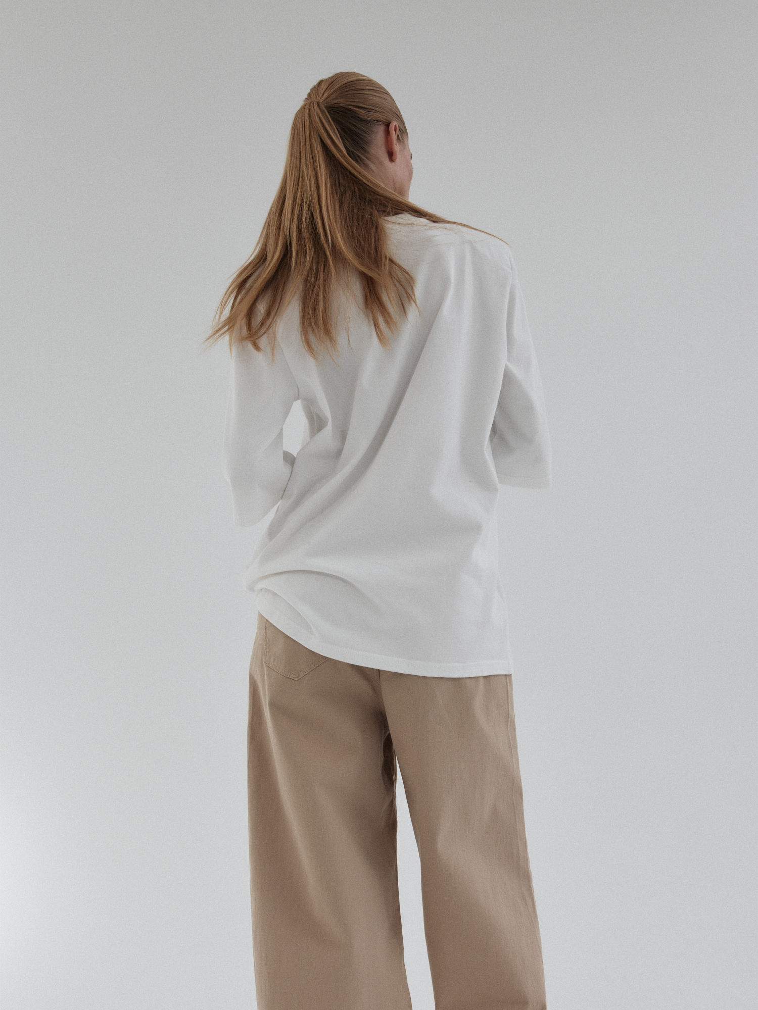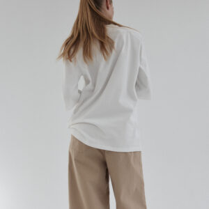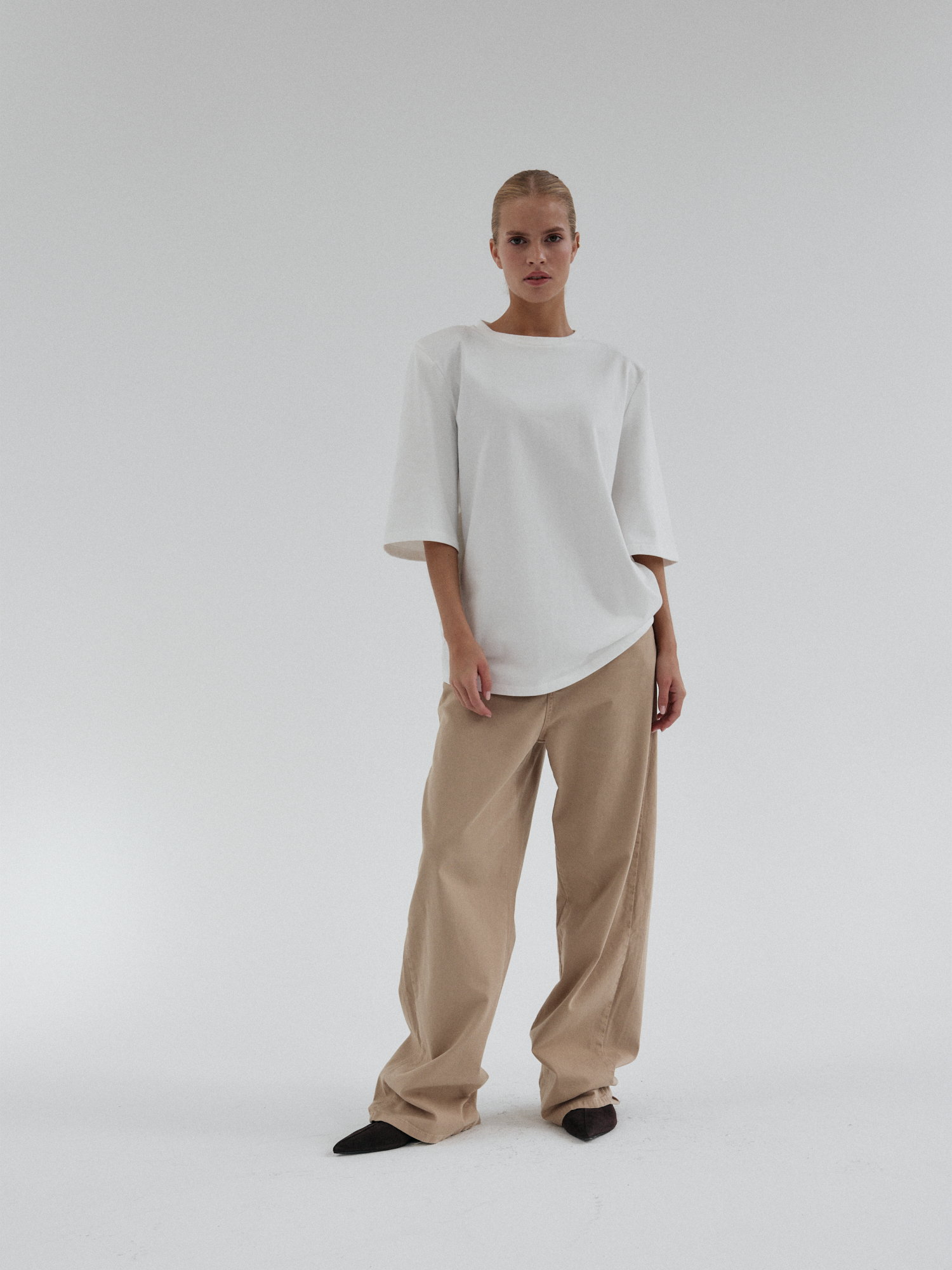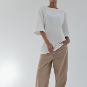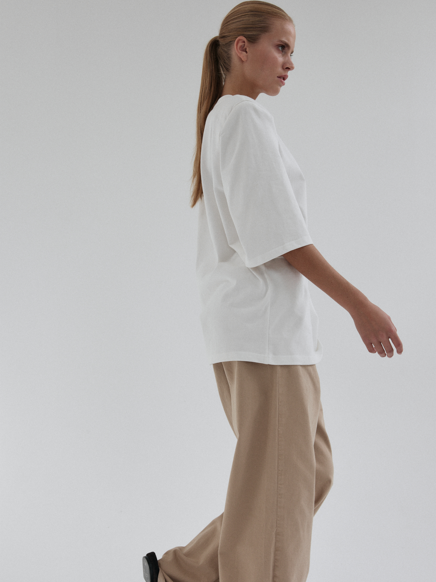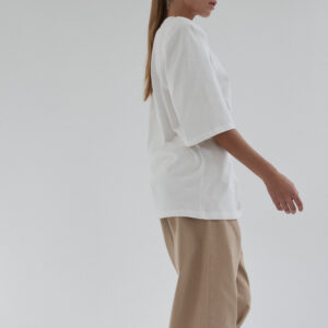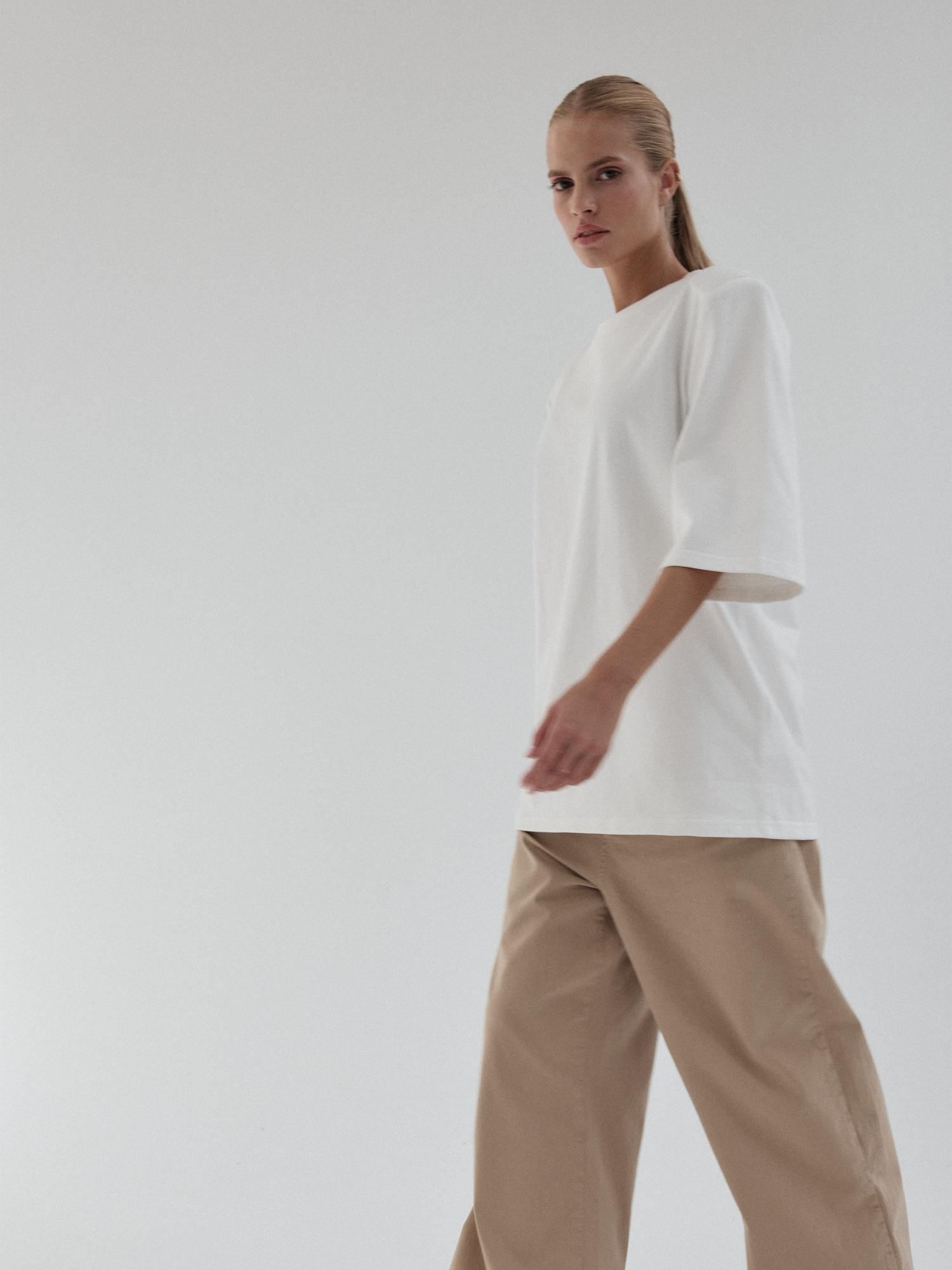 Oversize’owy t-shirt o pudełkowym kroju. Obszerne poduszki widocznie podkreślają linię ramion. T-shirt sprawdzi się zarówno w klasycznym zestawieniu na co dzień z jeansami, jak i w eleganckich stylizacjach z spodniami garniturowymi.