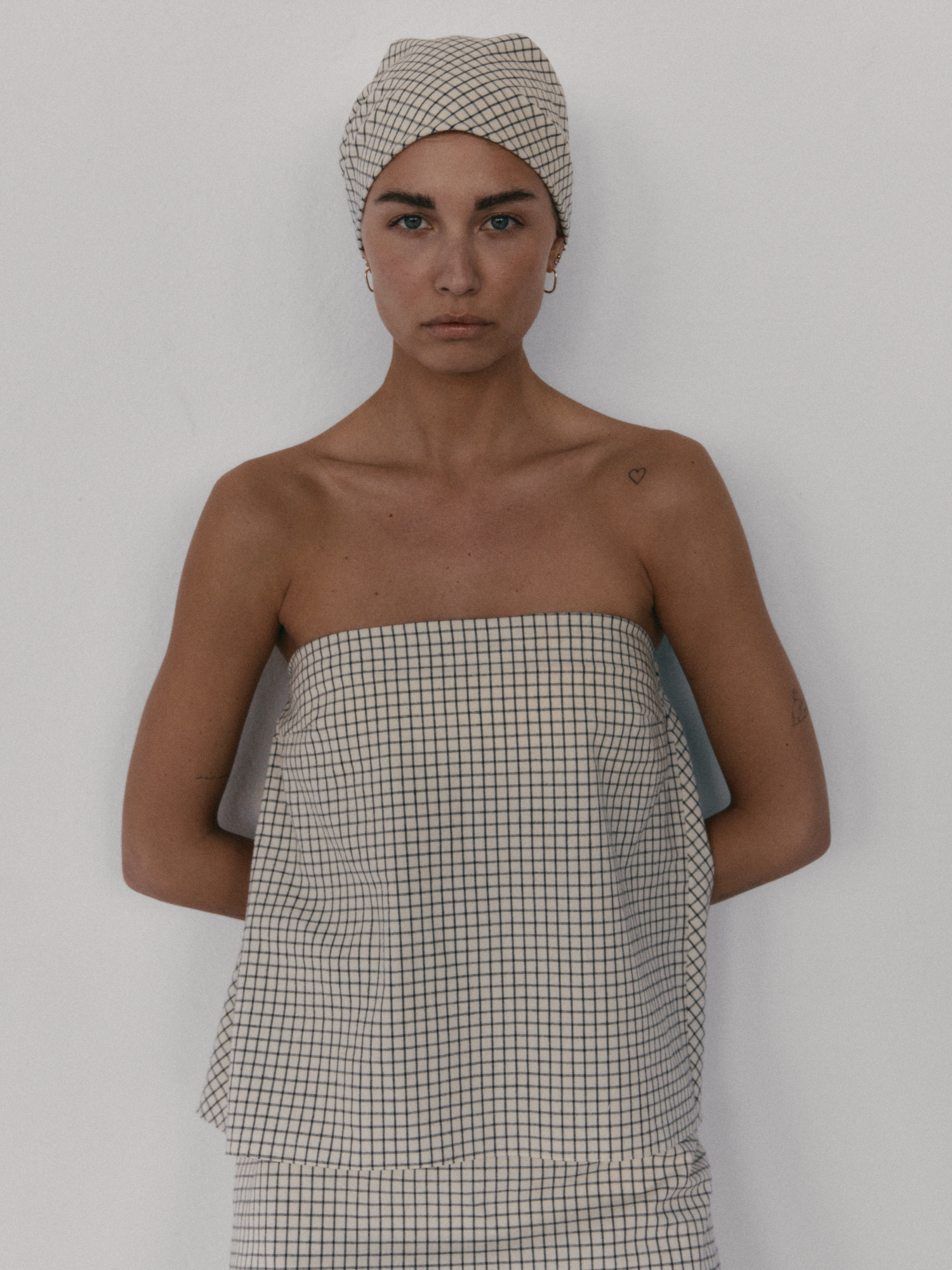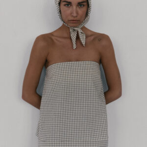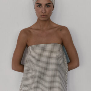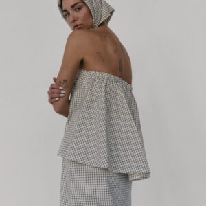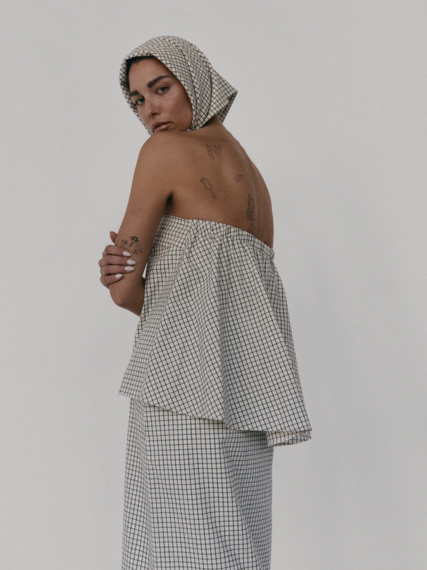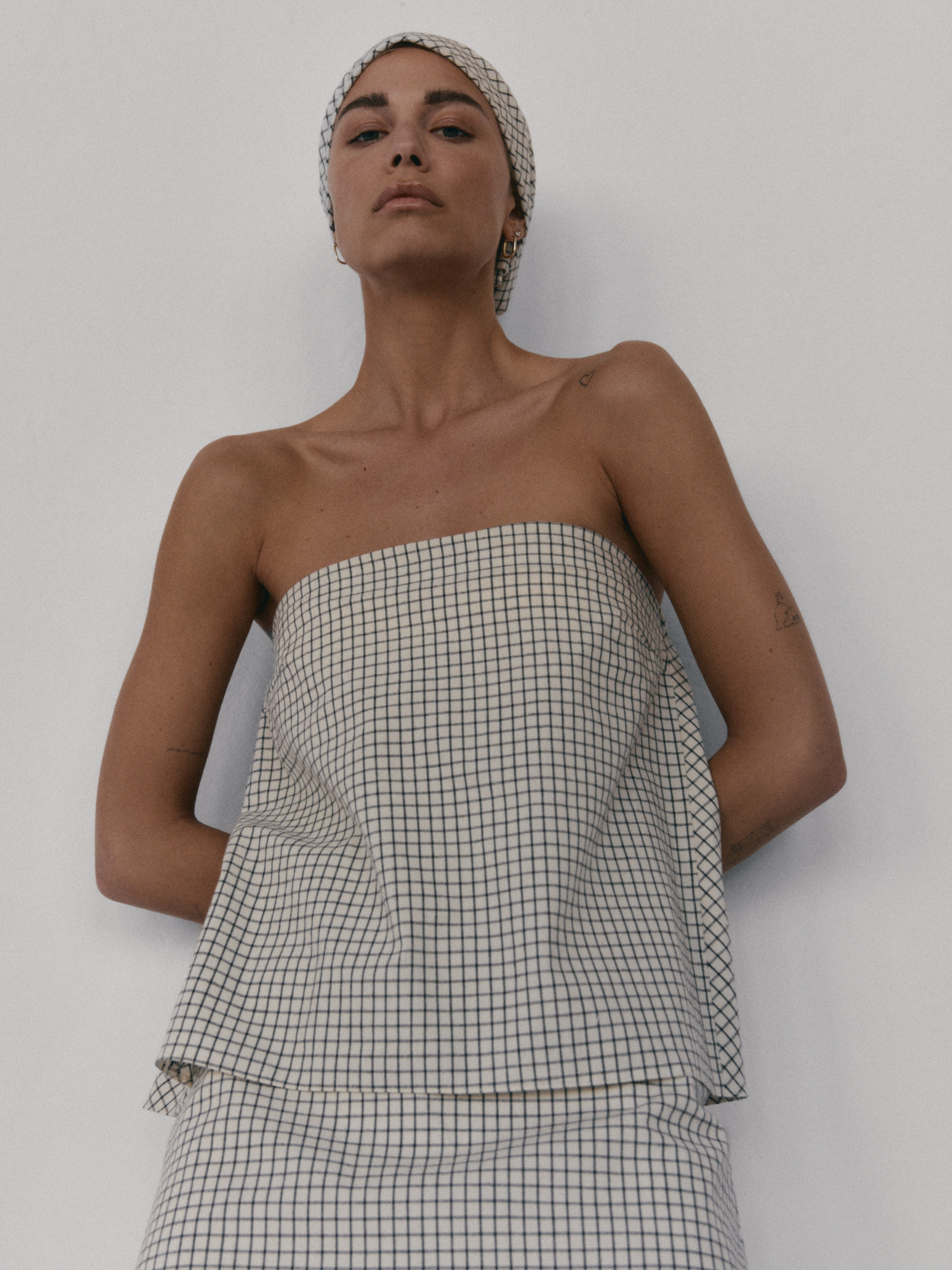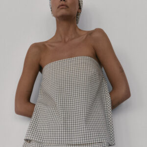Top bez ramiączek o luźnym kroju. Wbudowany w środku stanik oraz guma wszyta z tyłu sprawiają, że top nie opada zapewniając komfort noszenia. Idealnie sprawdzi się w zestawie z spódnicą i apaszką MIE.