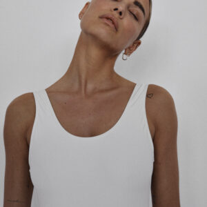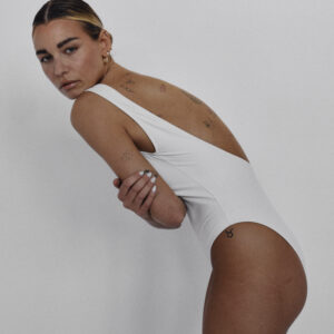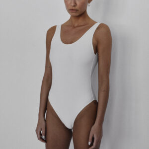 Kostium V SWIMSUIT wykonany jest ze specjalnej przędzy, która pochodzi w 100% z recyklingu. Dzięki odpowiedniemu splotowi włókien, jest on także dwa razy bardziej odporny na działanie chloru, kremów i olejków do opalania niż tradycyjny materiał. Zapobiega namnażaniu się bakterii. Kostium dodatkowo jest wzmocniony delikatnymi gumkami wszytymi w boki, które zapewniają komfort pływania, nie wcinając się jednocześnie w ciało.