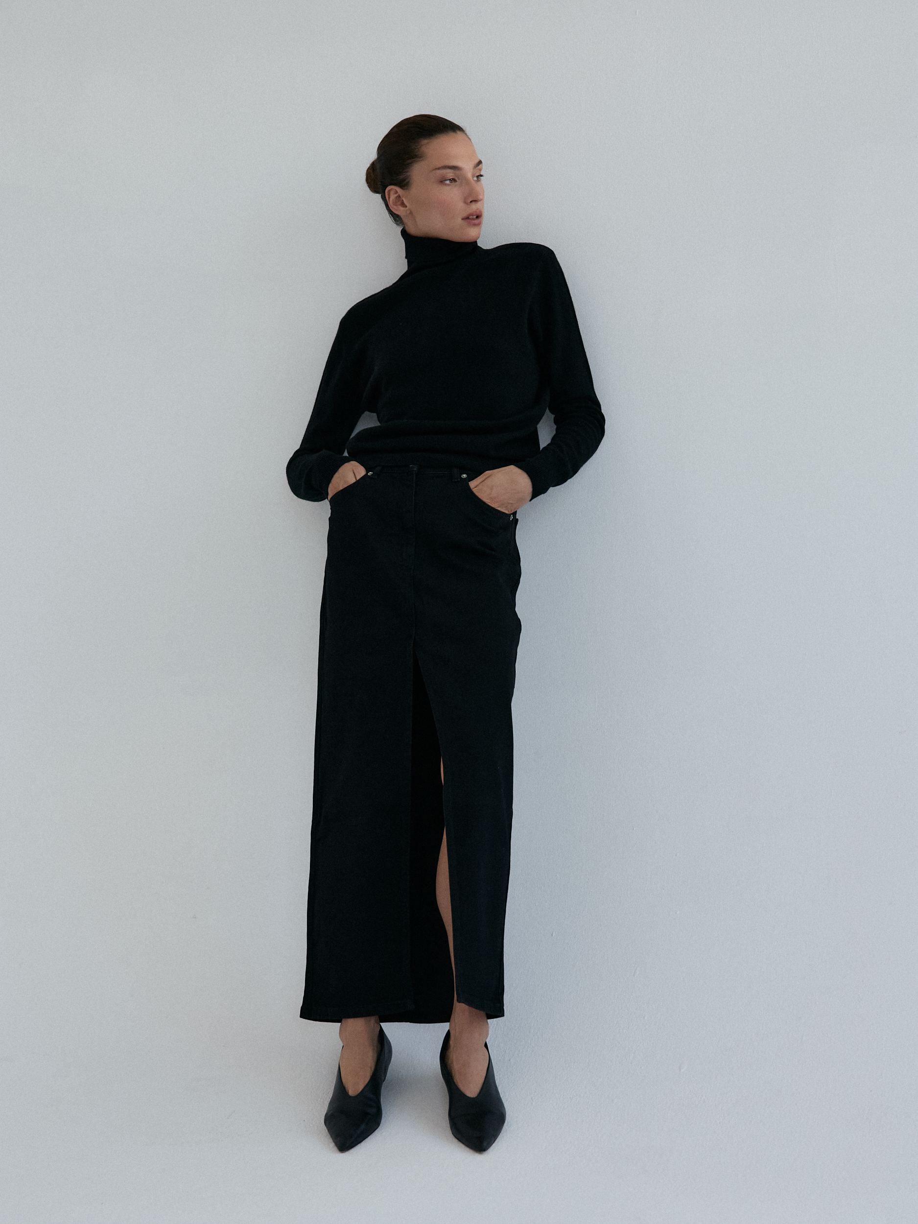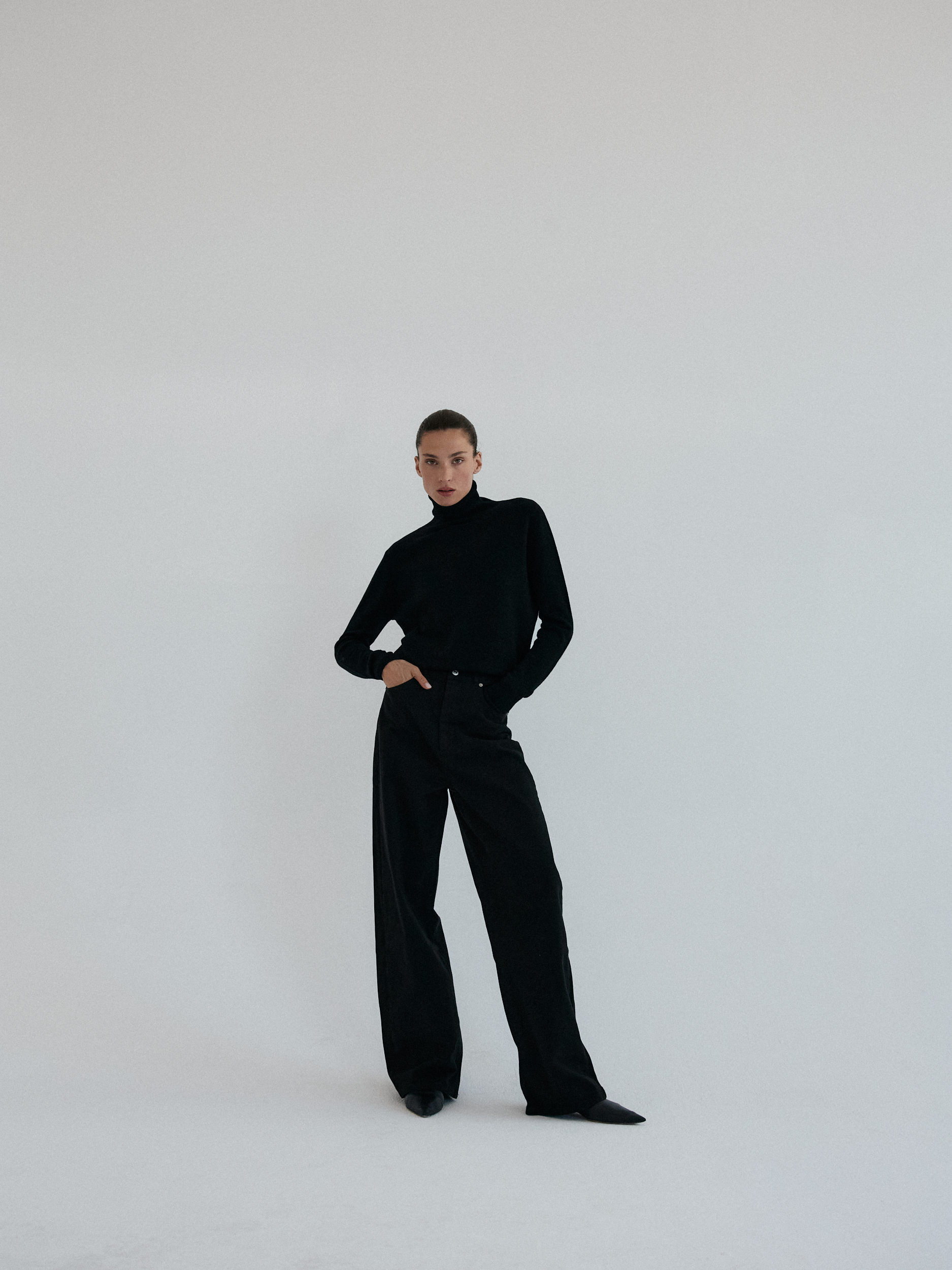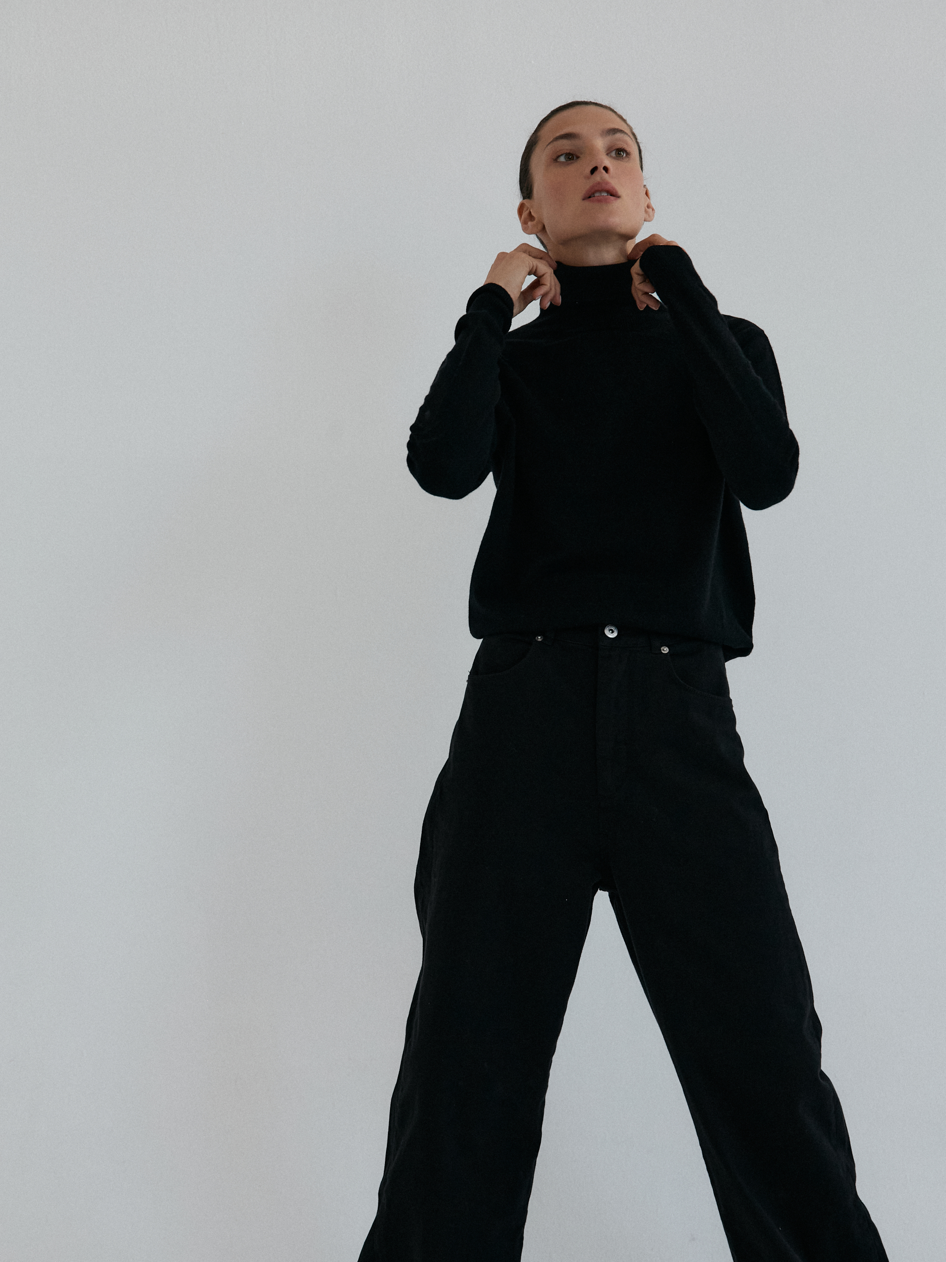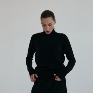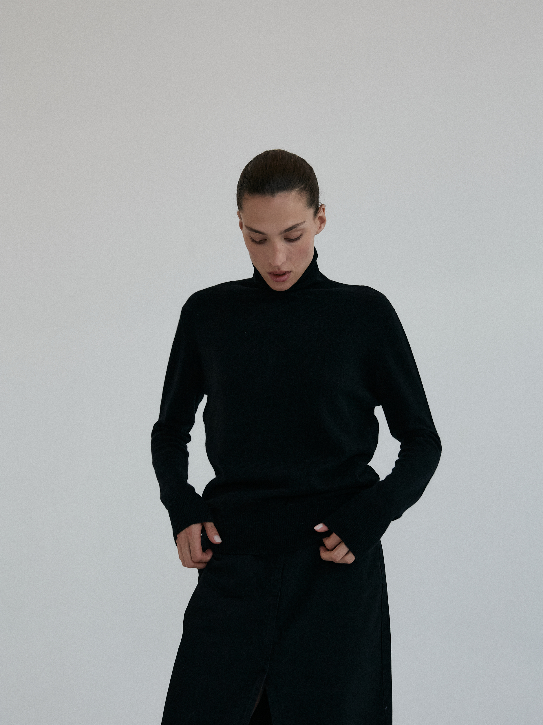 Minimalistyczny sweter z golfem. Klasyczny i ponadczasowy krój doskonale sprawdzi się zarówno jako warstwa wierzchnia na sukienkę, jak i z eleganckimi spodniami, czy jeansami. Ściągacze przy mankietach, w dekolcie i u dołu swetra dodają całości subtelnej struktury i wykończenia. Wełna i kaszmir zapewniają ciepło bez zbędnej objętości. Wysoki, miękki golf  dodaje szyku i dopełnia całości.