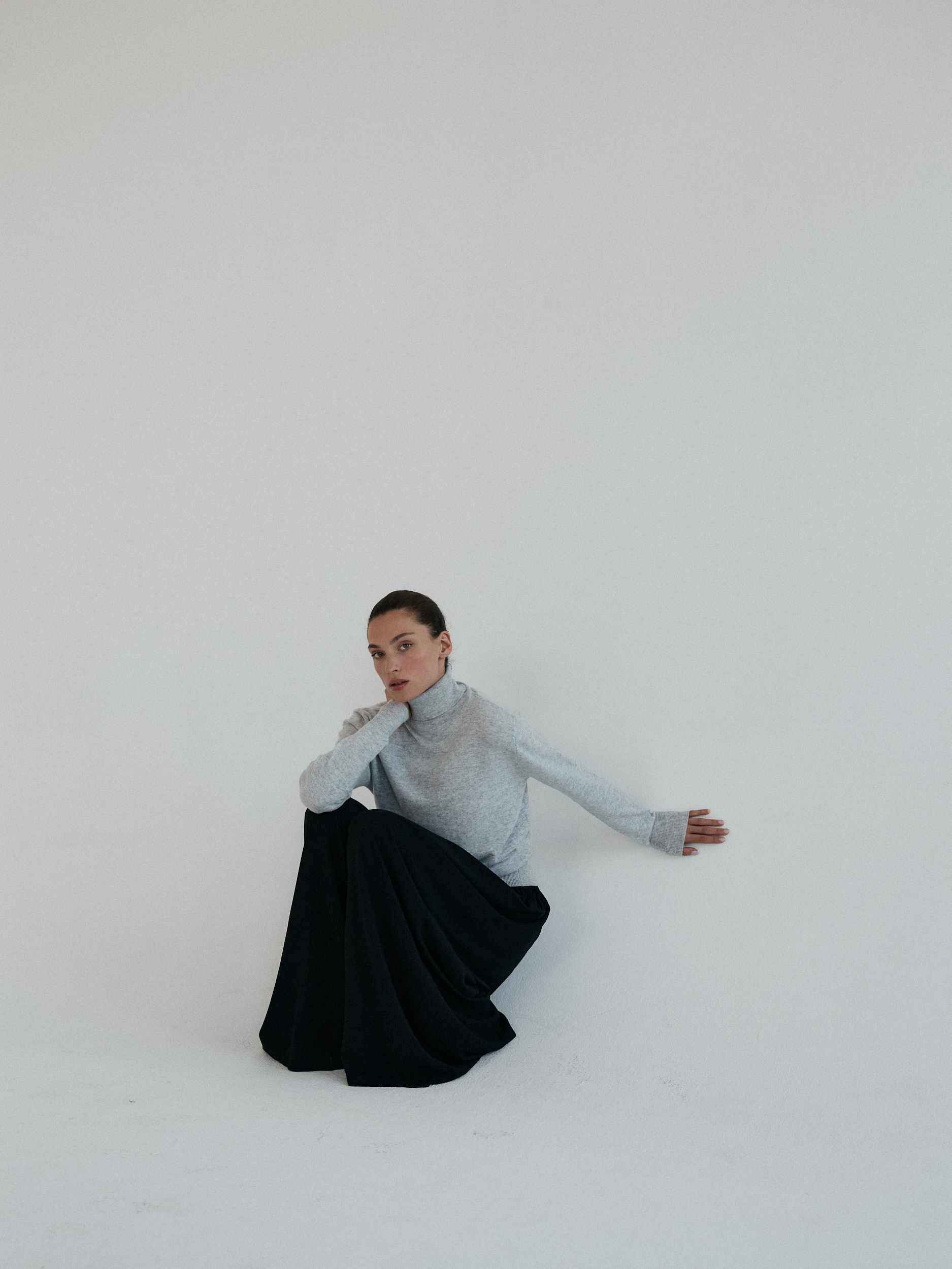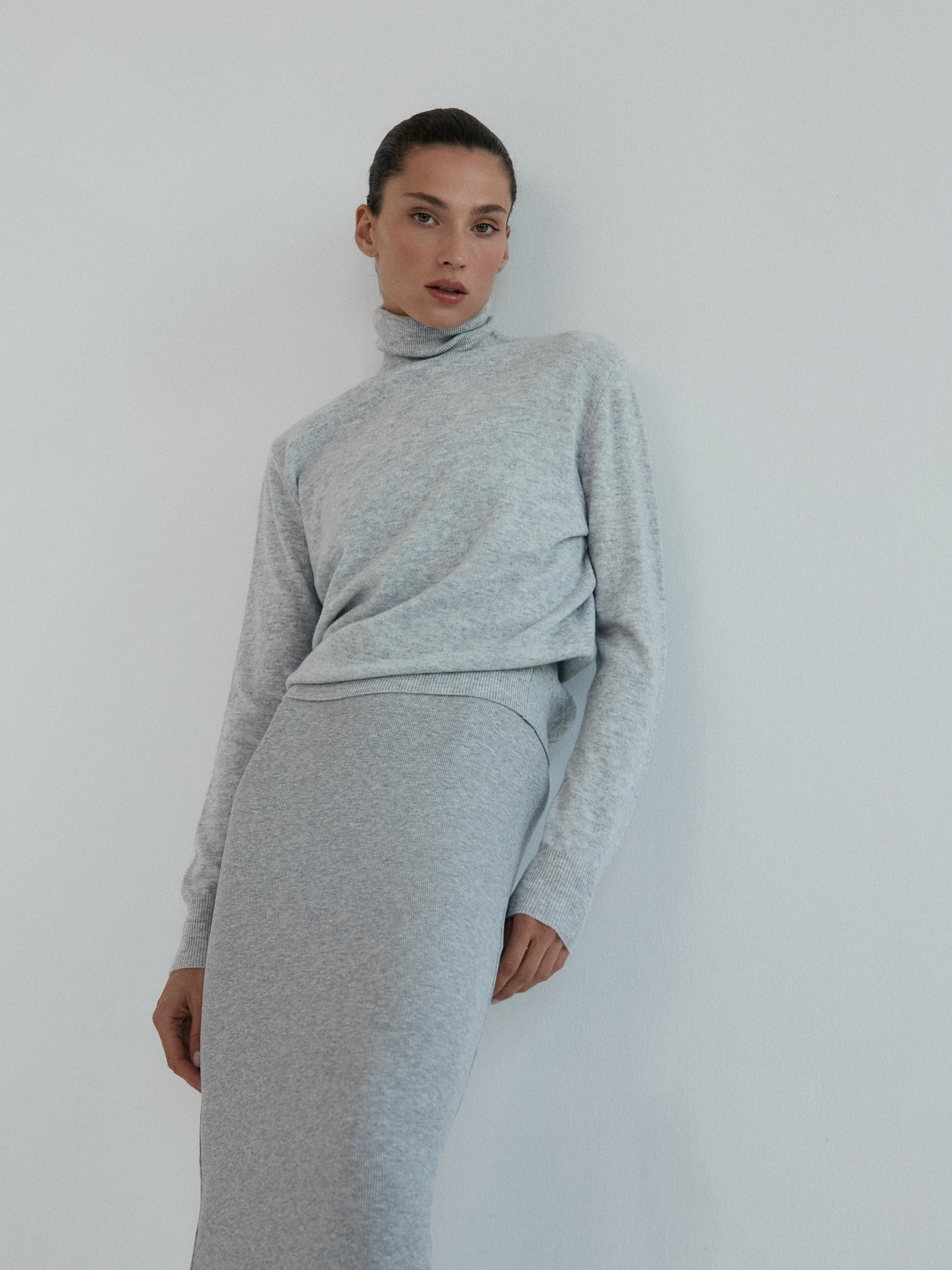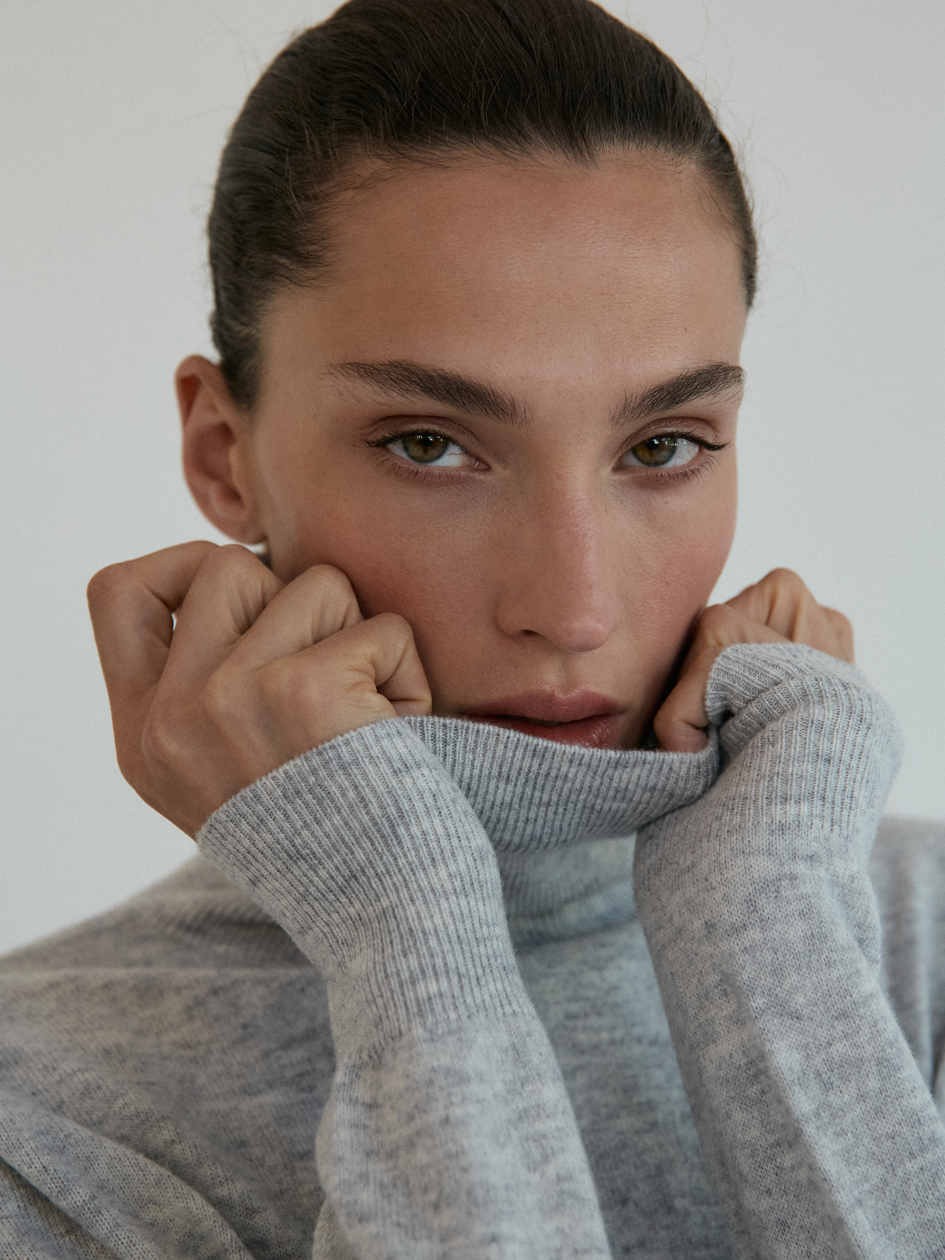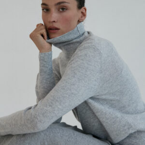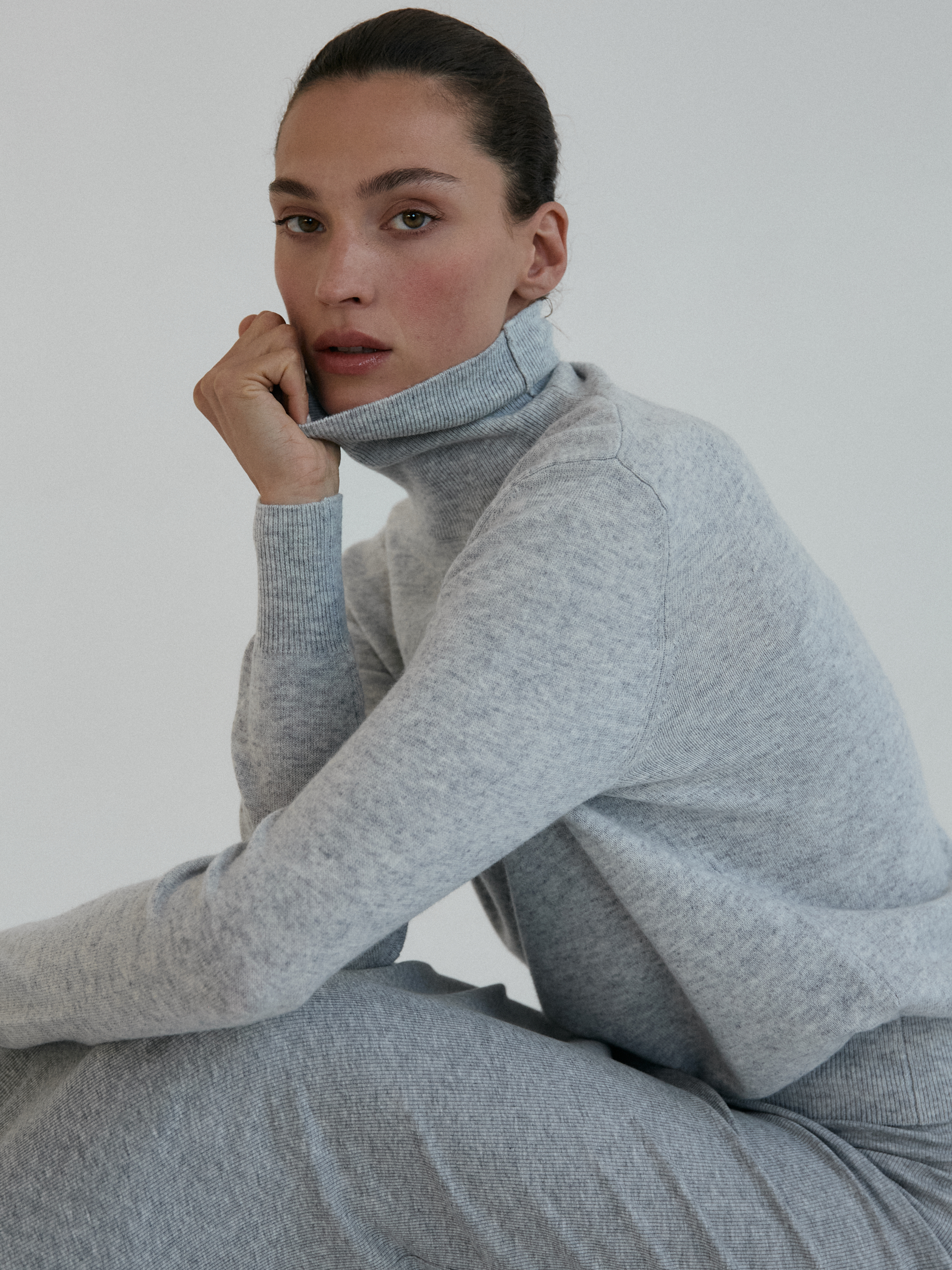 Minimalistyczny sweter z golfem. Klasyczny i ponadczasowy krój doskonale sprawdzi się zarówno jako warstwa wierzchnia na sukienkę, jak i z eleganckimi spodniami, czy jeansami. Ściągacze przy mankietach, w dekolcie i u dołu swetra dodają całości subtelnej struktury i wykończenia. Wełna i kaszmir zapewniają ciepło bez zbędnej objętości. Wysoki, miękki golf dodaje szyku i dopełnia całości.