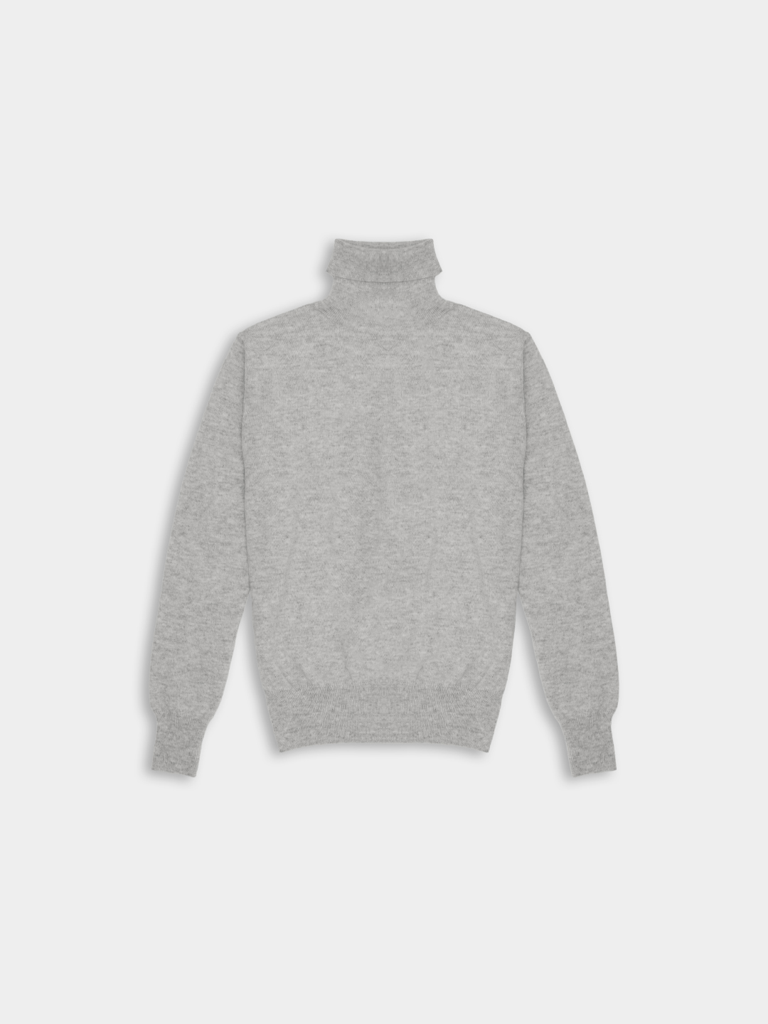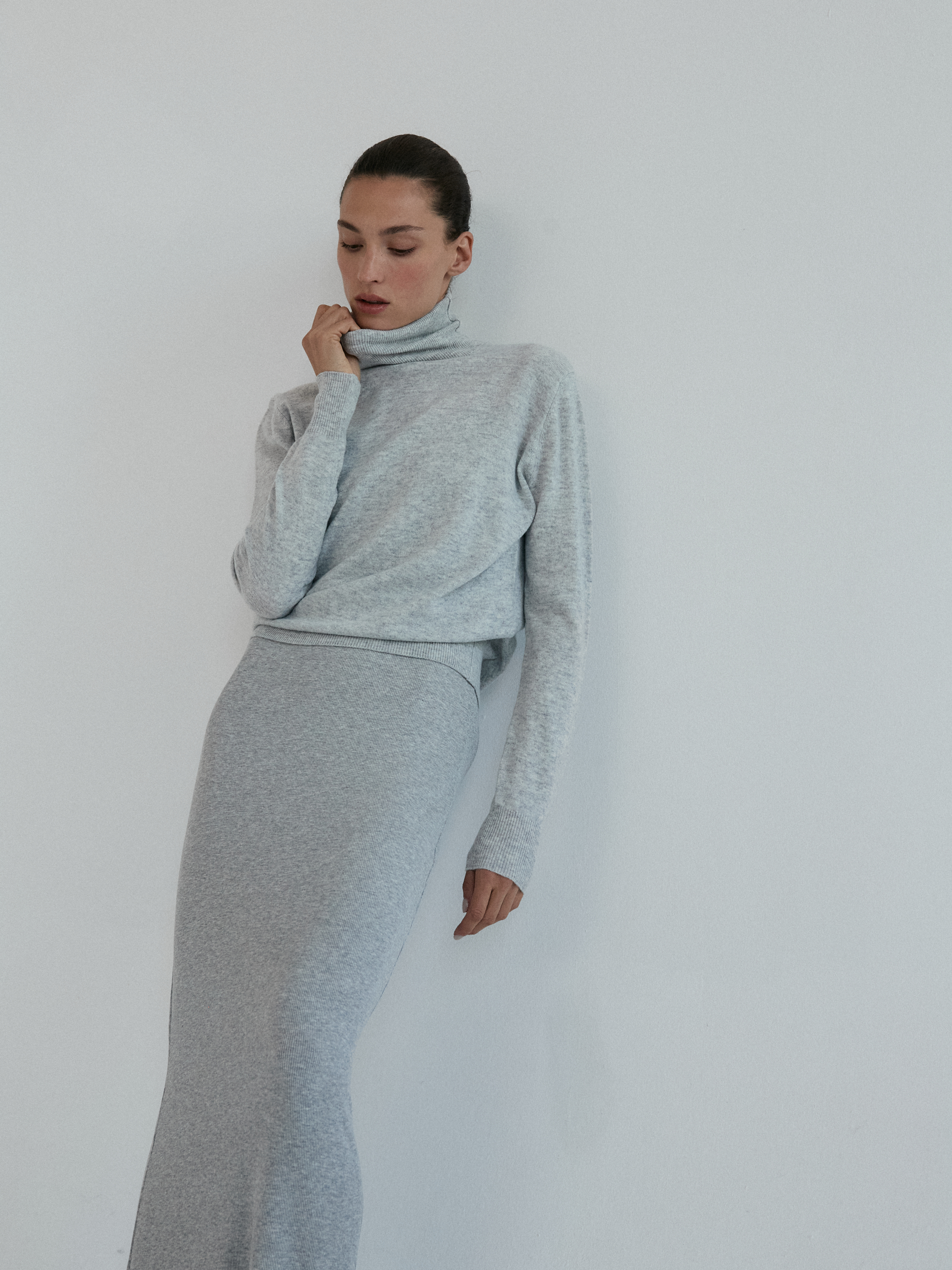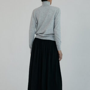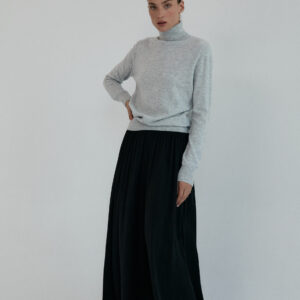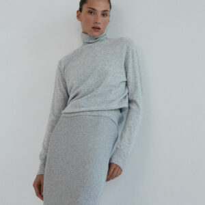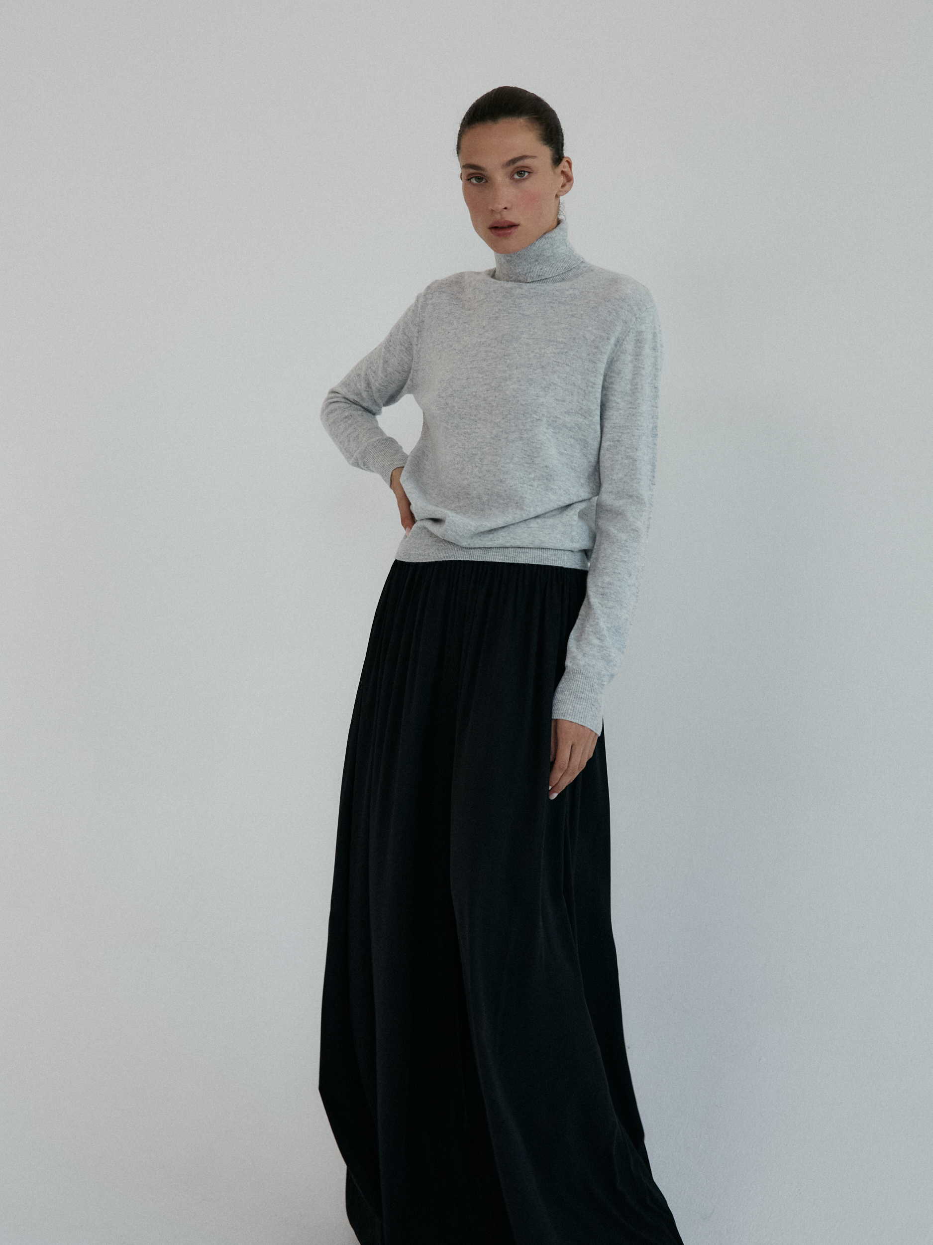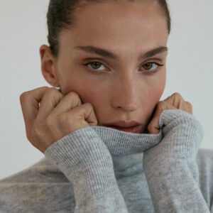 Minimalistyczny sweter z golfem. Klasyczny i ponadczasowy krój doskonale sprawdzi się zarówno jako warstwa wierzchnia na sukienkę, jak i z eleganckimi spodniami, czy jeansami. Ściągacze przy mankietach, w dekolcie i u dołu swetra dodają całości subtelnej struktury i wykończenia. Wełna i kaszmir zapewniają ciepło bez zbędnej objętości. Wysoki, miękki golf dodaje szyku i dopełnia całości.