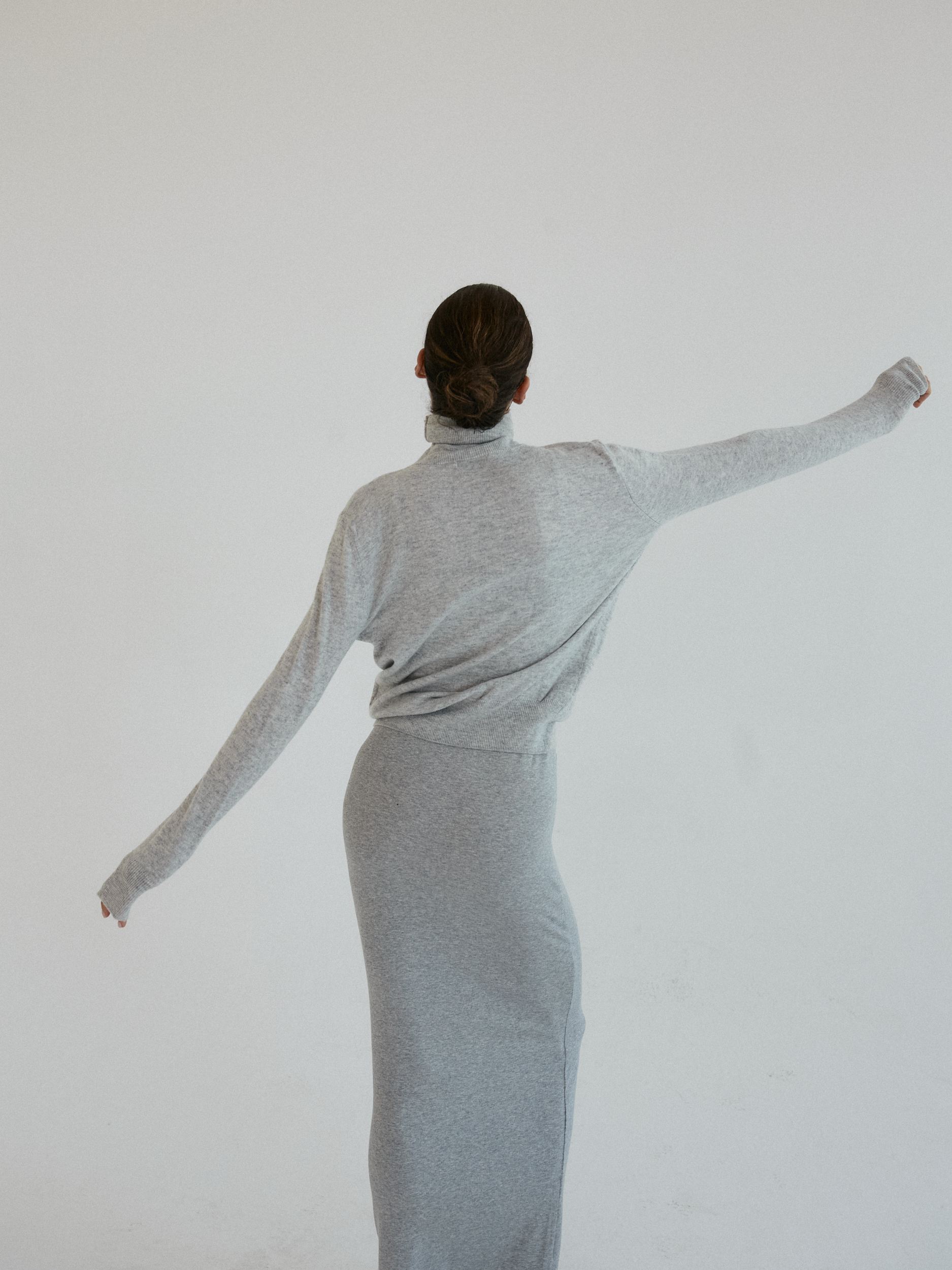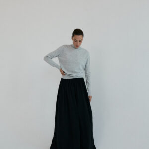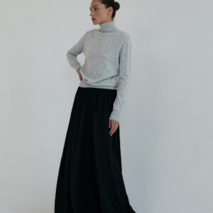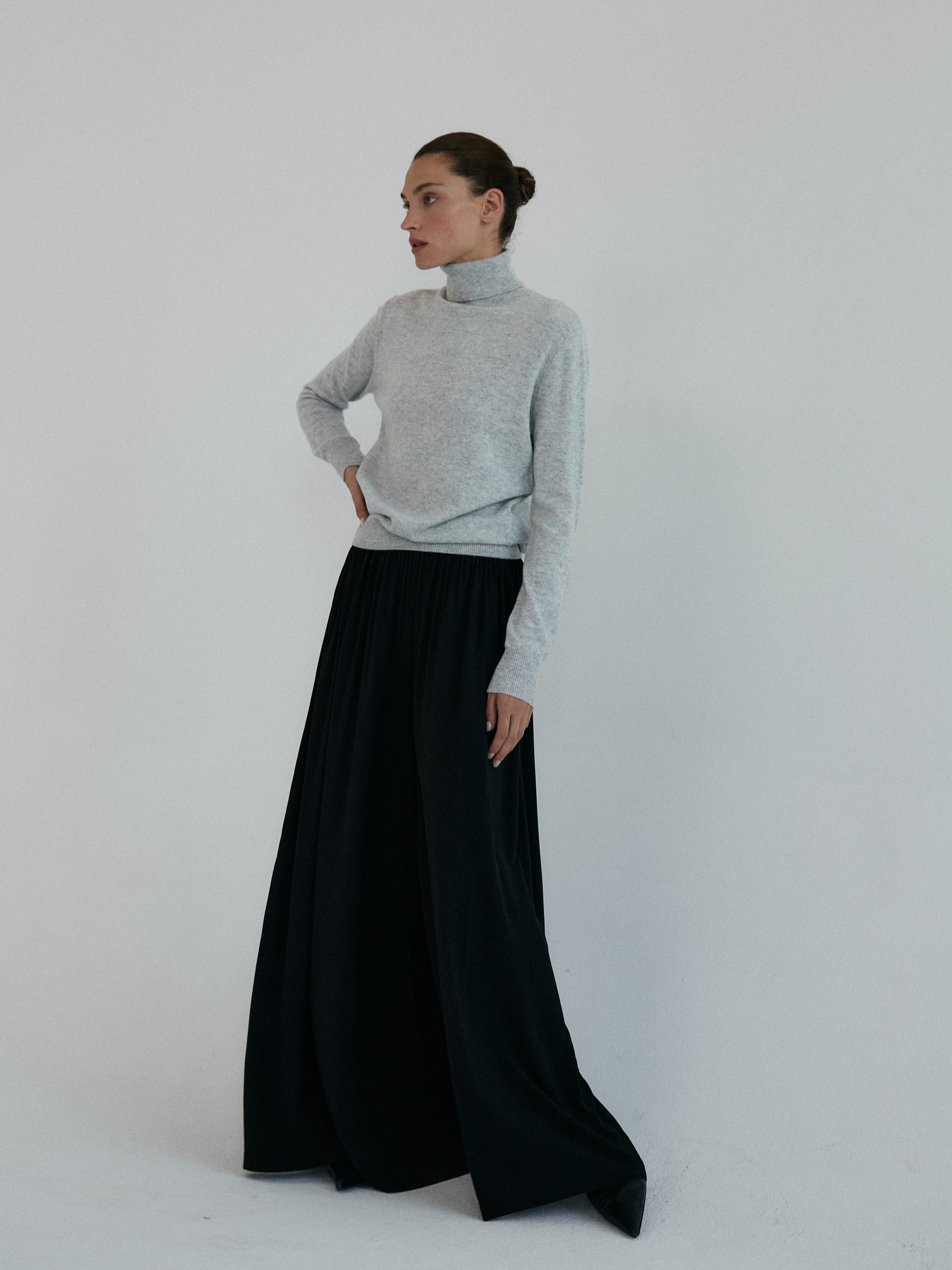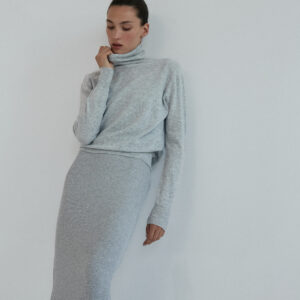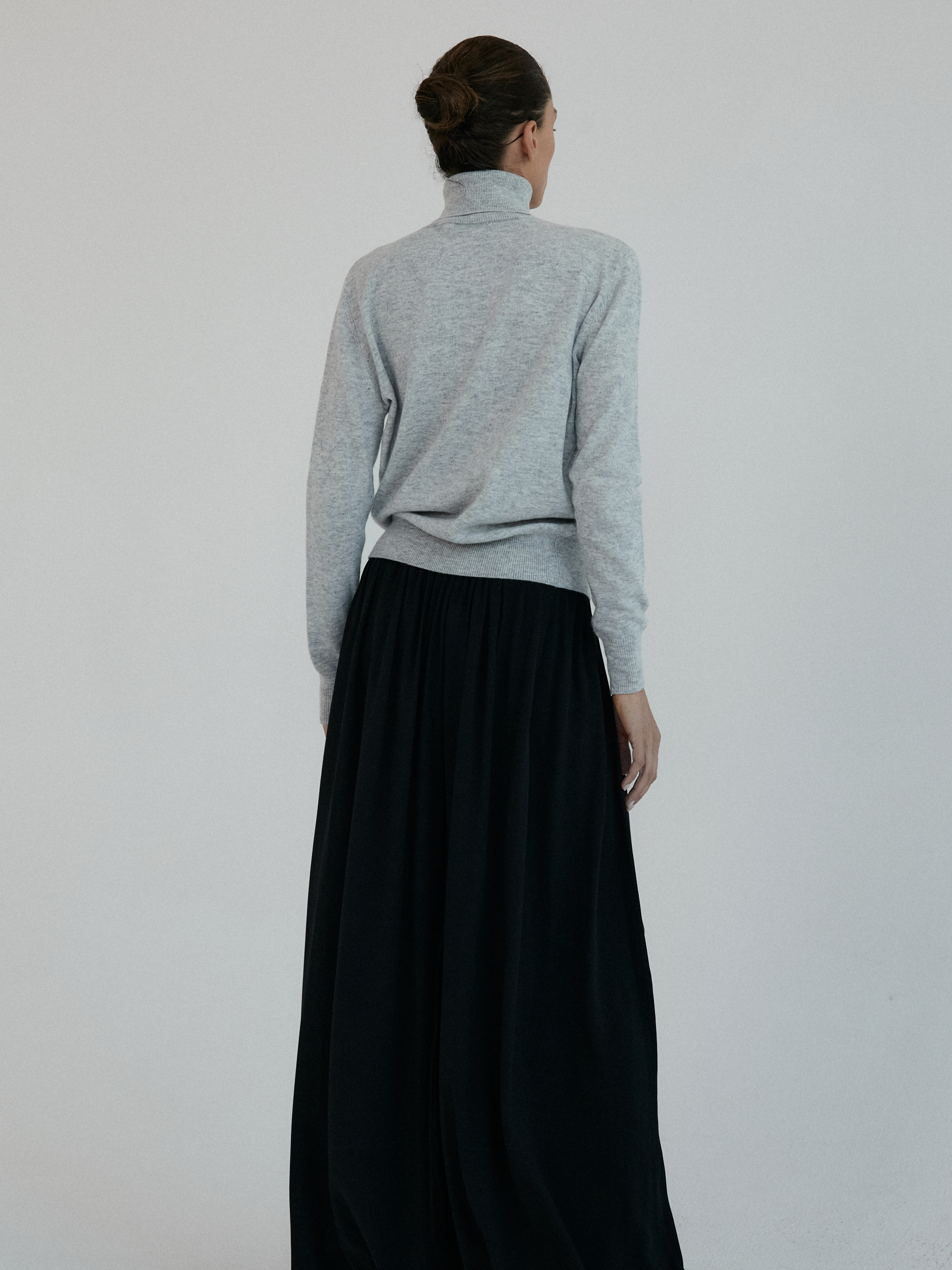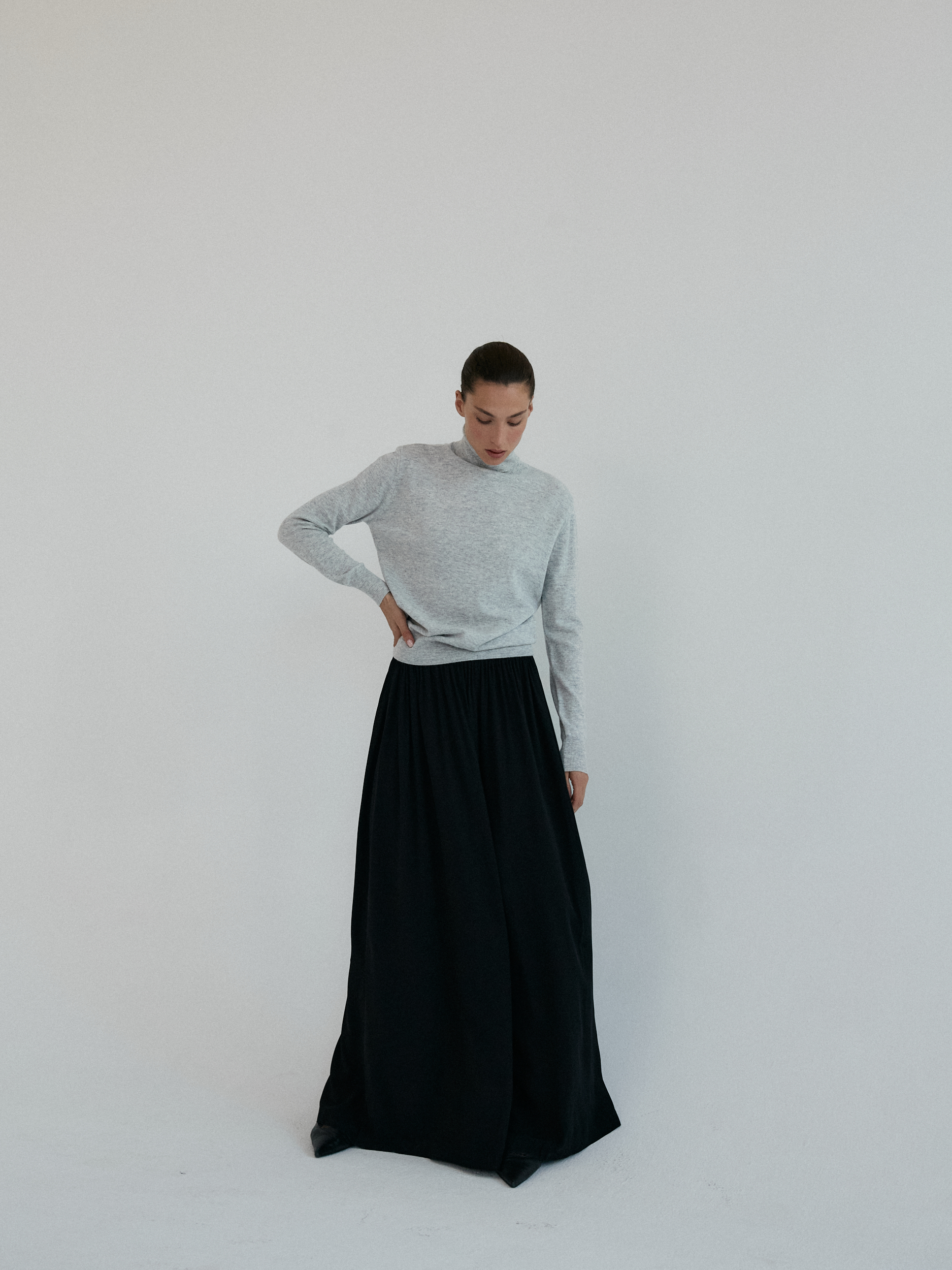 Minimalistyczny sweter z golfem. Klasyczny i ponadczasowy krój doskonale sprawdzi się zarówno jako warstwa wierzchnia na sukienkę, jak i z eleganckimi spodniami, czy jeansami. Ściągacze przy mankietach, w dekolcie i u dołu swetra dodają całości subtelnej struktury i wykończenia. Wełna i kaszmir zapewniają ciepło bez zbędnej objętości. Wysoki, miękki golf dodaje szyku i dopełnia całości.