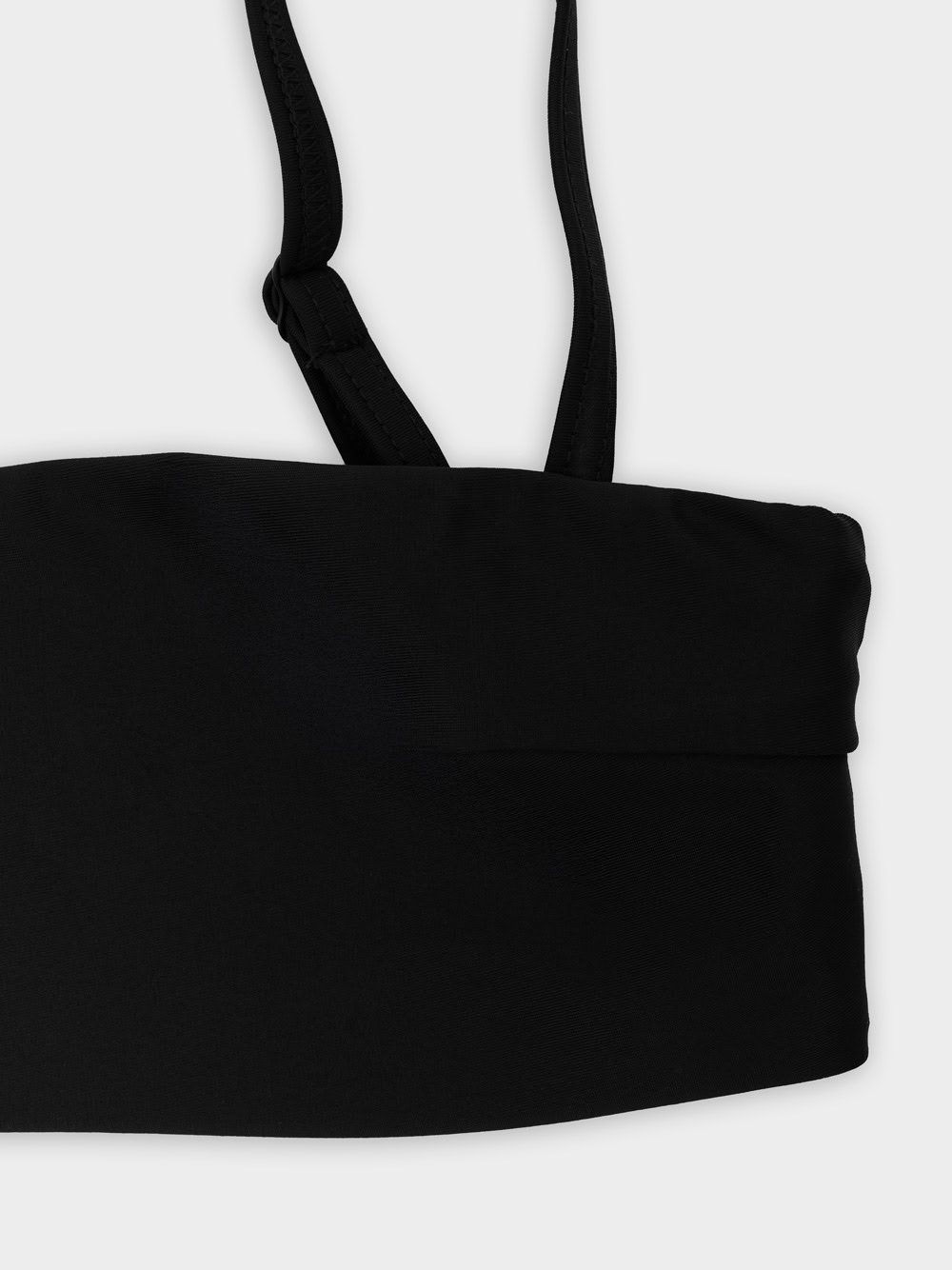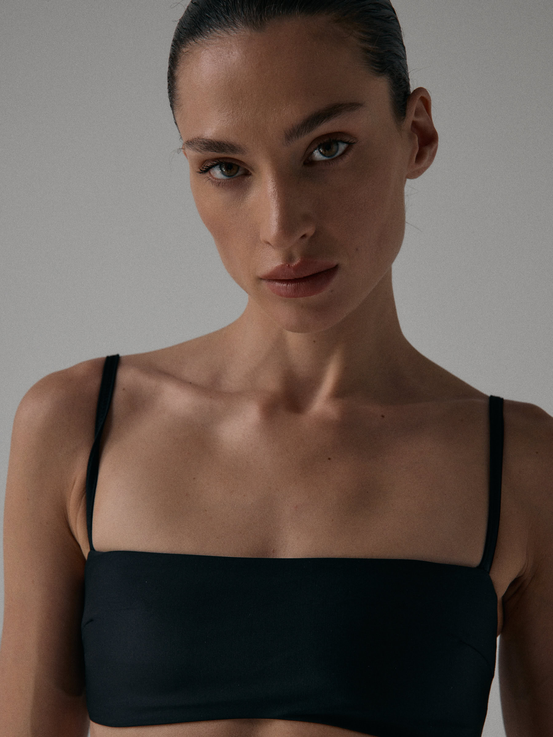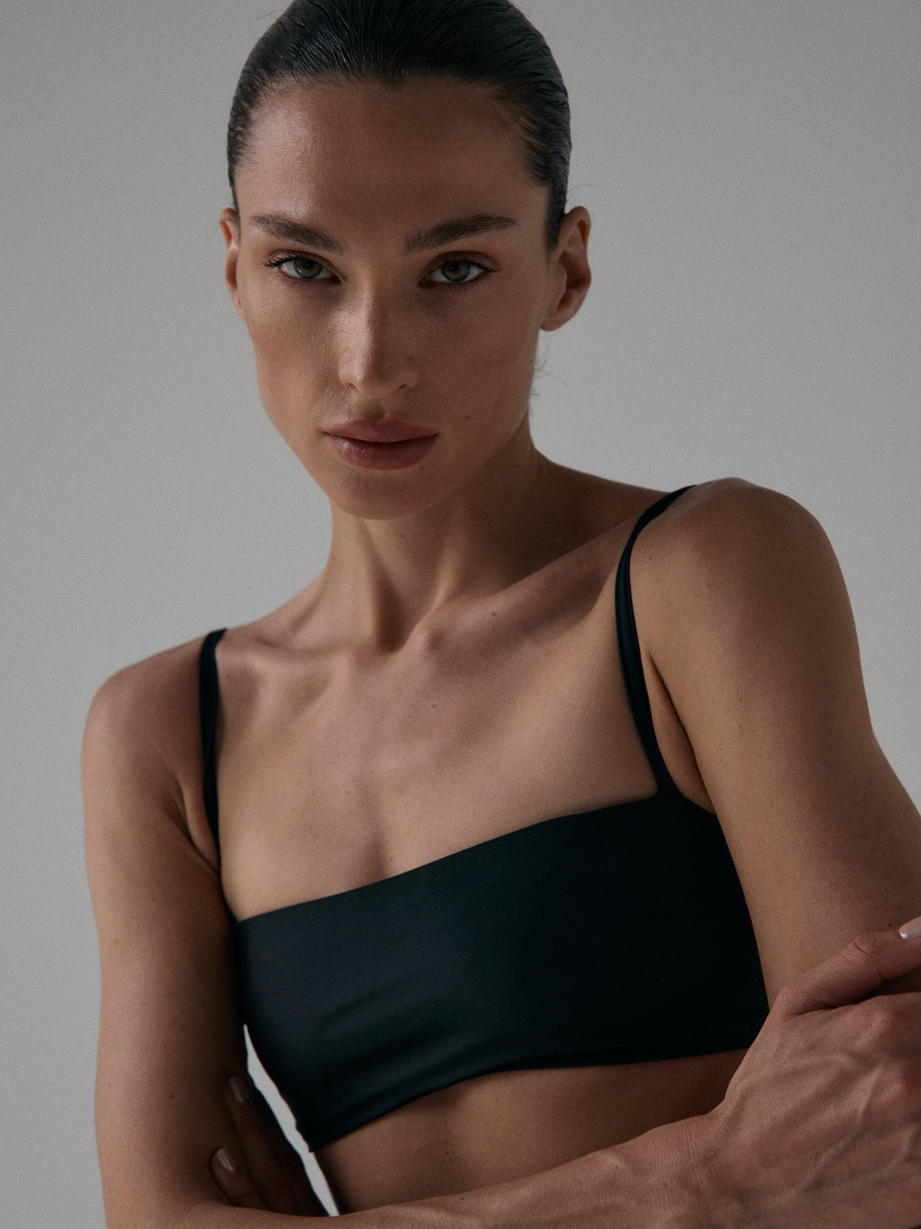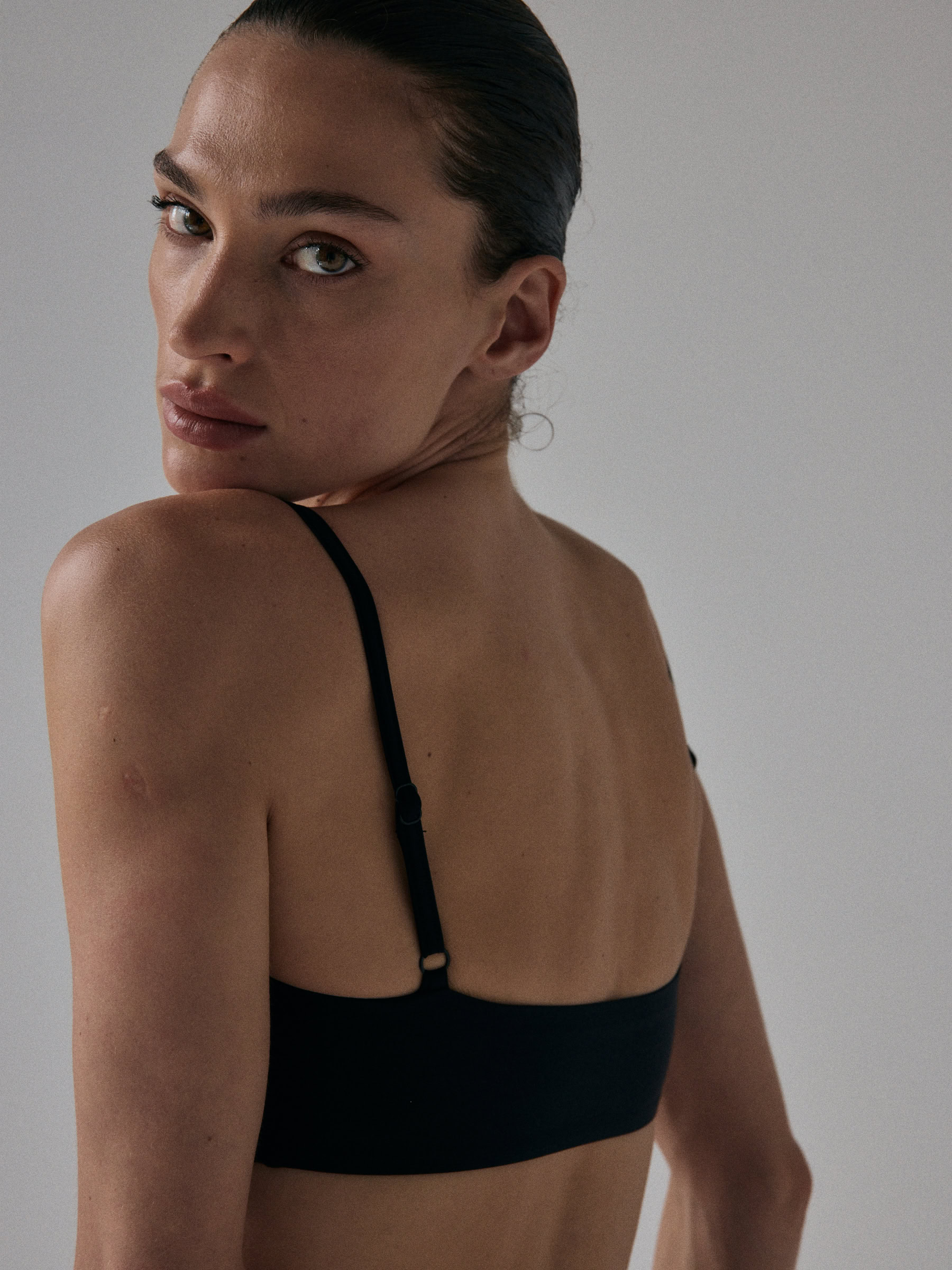 Biustonosz na ultra cienkich ramiączkach, z mocno obniżoną linią dekoltu. Fason bez oddzielnych miseczek i fiszbin. Krój idealnie podtrzymuje biust i ładnie go kształtuje. Doskonale przylega do ciała, modeluje i zapewnia komfort noszenia. Nie posiada zamka, wkładany przez głowę. Model będzie tworzył świetny zestaw z figami kąpielowymi IMPIO w tym samym odcieniu.