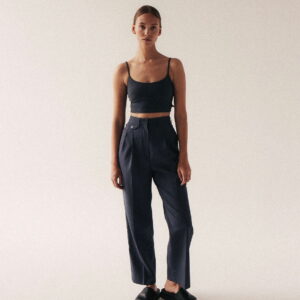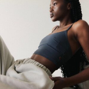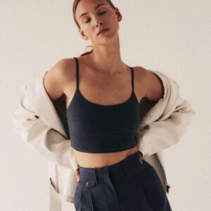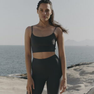 Minimalistyczny, delikatnie przedłużony top na bardzo cienkich ramiączkach, z głębokim dekoltem podkreślającym biust i wbudowanym biustonoszem. Dodatek elastanu w składzie sprawia, że top dopasowuje się do sylwetki delikatnie opinając ciało. Może służyć jako activebra z delikatnym poziomem trzymania w zestawieniu ze sportowowymi leginsami SOFT SELECTION black lub jako koszulka do codziennych casualowo-sportowych zestawów.