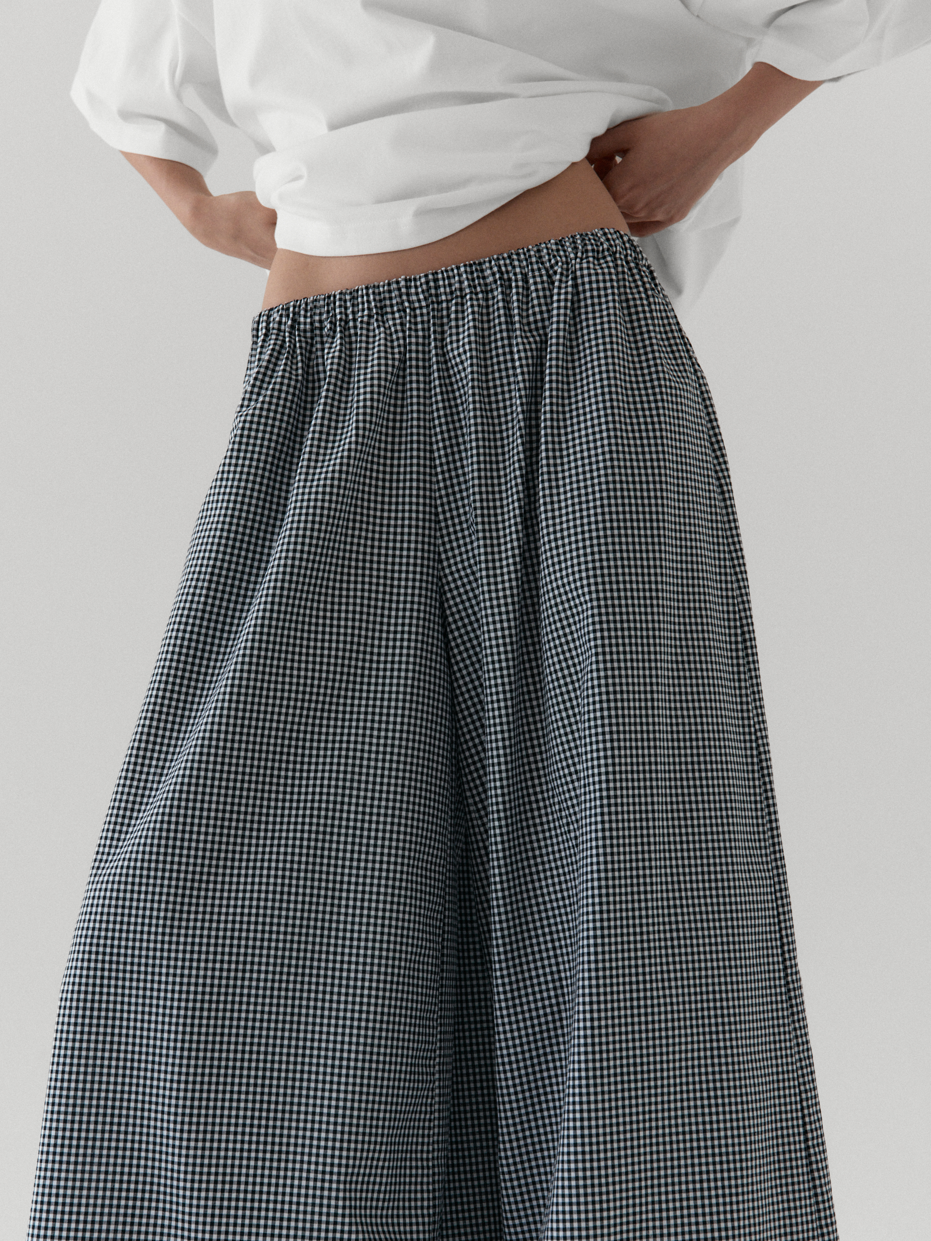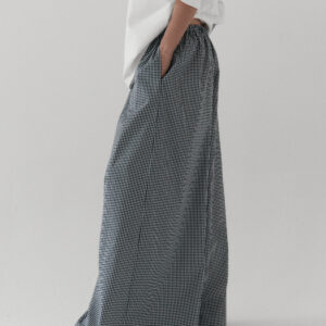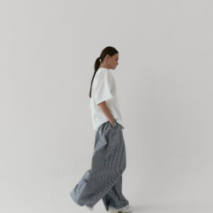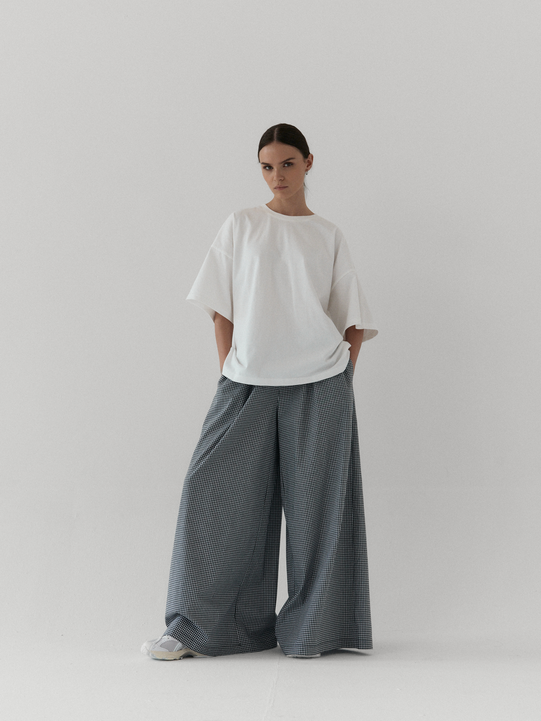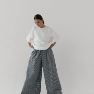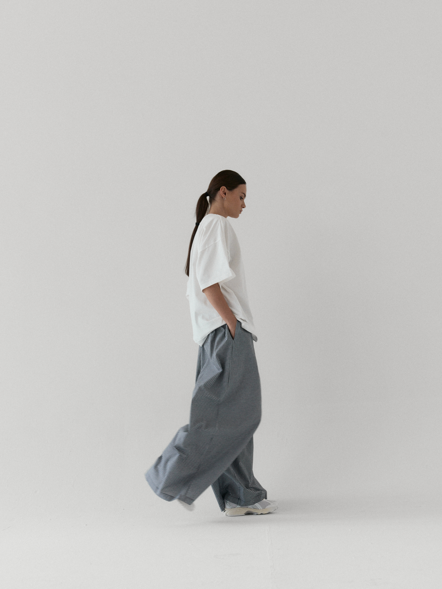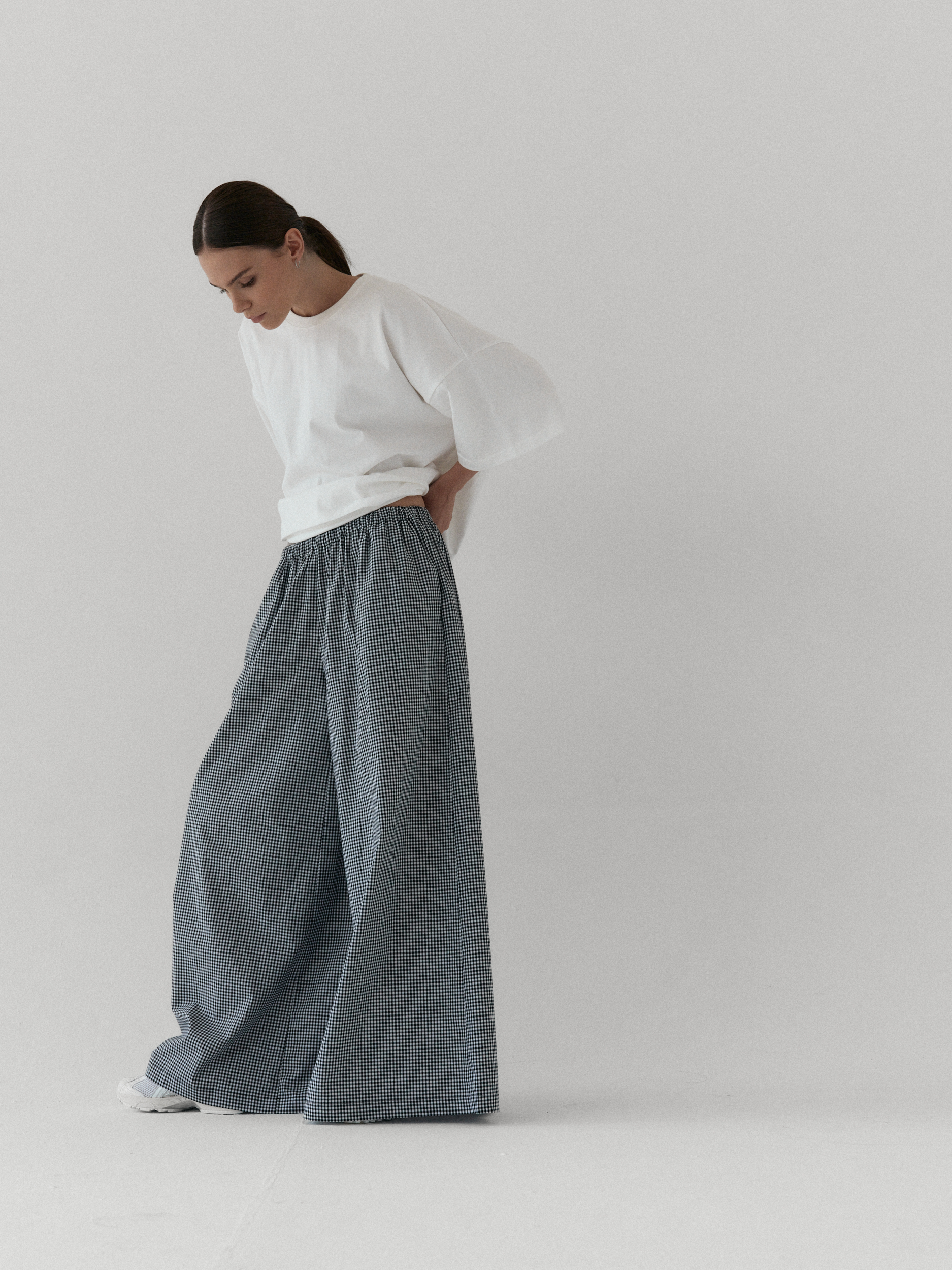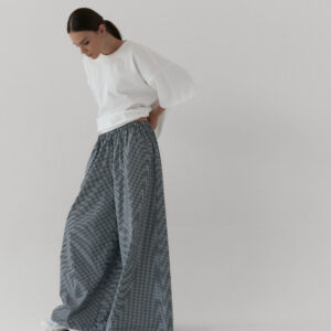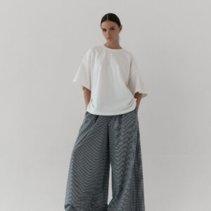Spodnie o luźnym, ultra oversize’owym,. Długość do kostek. Wszyta w pasie gumka delikatnie opina talię dopasowując się do sylwetki. Model świetnie wygląda zarówno z oversize’owym T-shirtem jak i dopasowanym topem. Z naszą koszulą MAU tworzą idealny zestaw na co dzień.