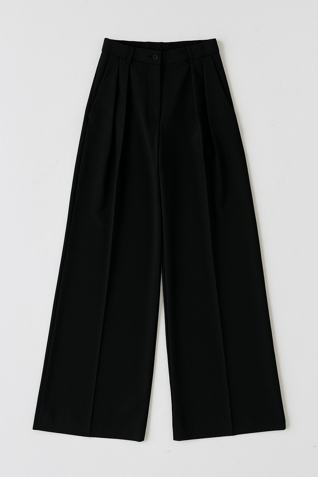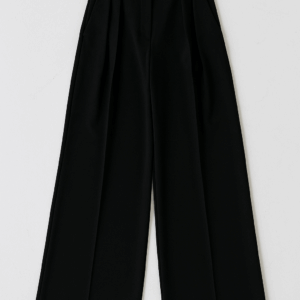 Wełniane spodnie o prostym, luźnym kroju i długości do kostek. Wysoki stan idealnie podkreśla talię. Nogawki rozszerzają się ku dołowi. Zaszewki dopełniają całości tworząc efekt lekkiego plisowania. Model posiada dwie funkcjonalne kieszenie po bokach. Zapinane na zamek.