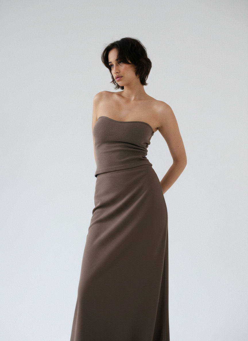 Długa, podkreślająca figurę spódnica wykonana z dzianiny w prążek. Wysoki stan, elastyczna talia, prosty brzeg u dołu. Idealna baza zarówno do codziennych jak i eleganckich stylizacji.