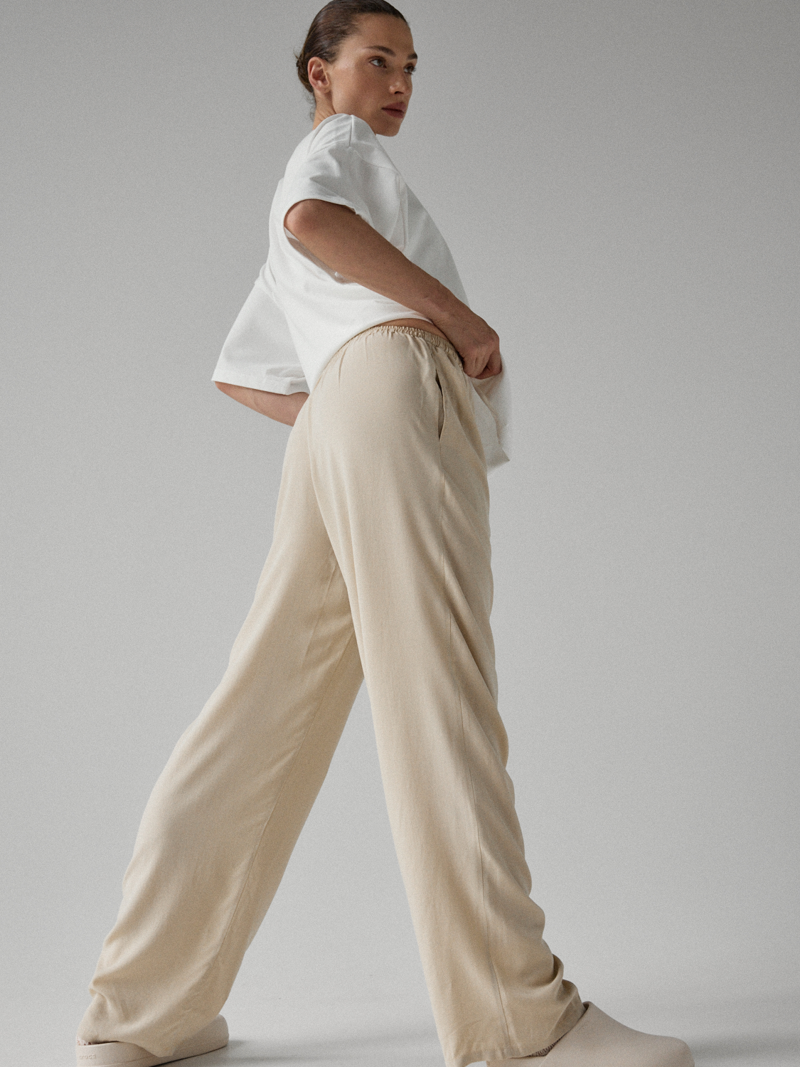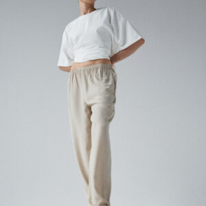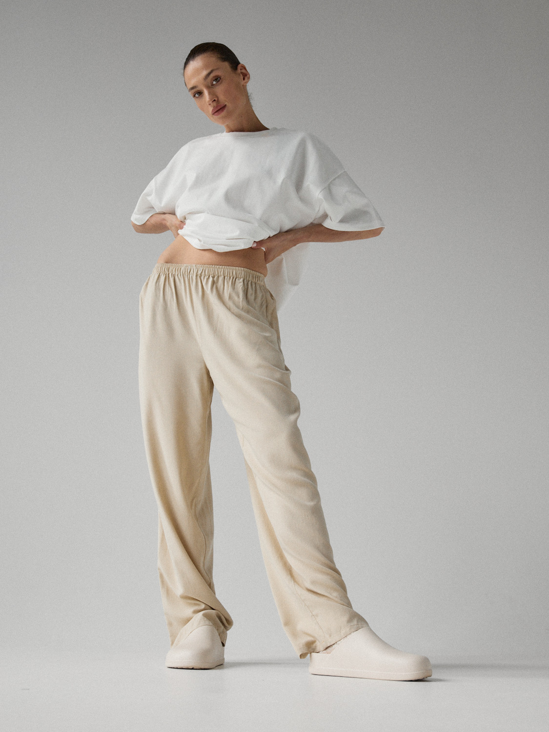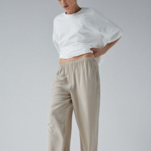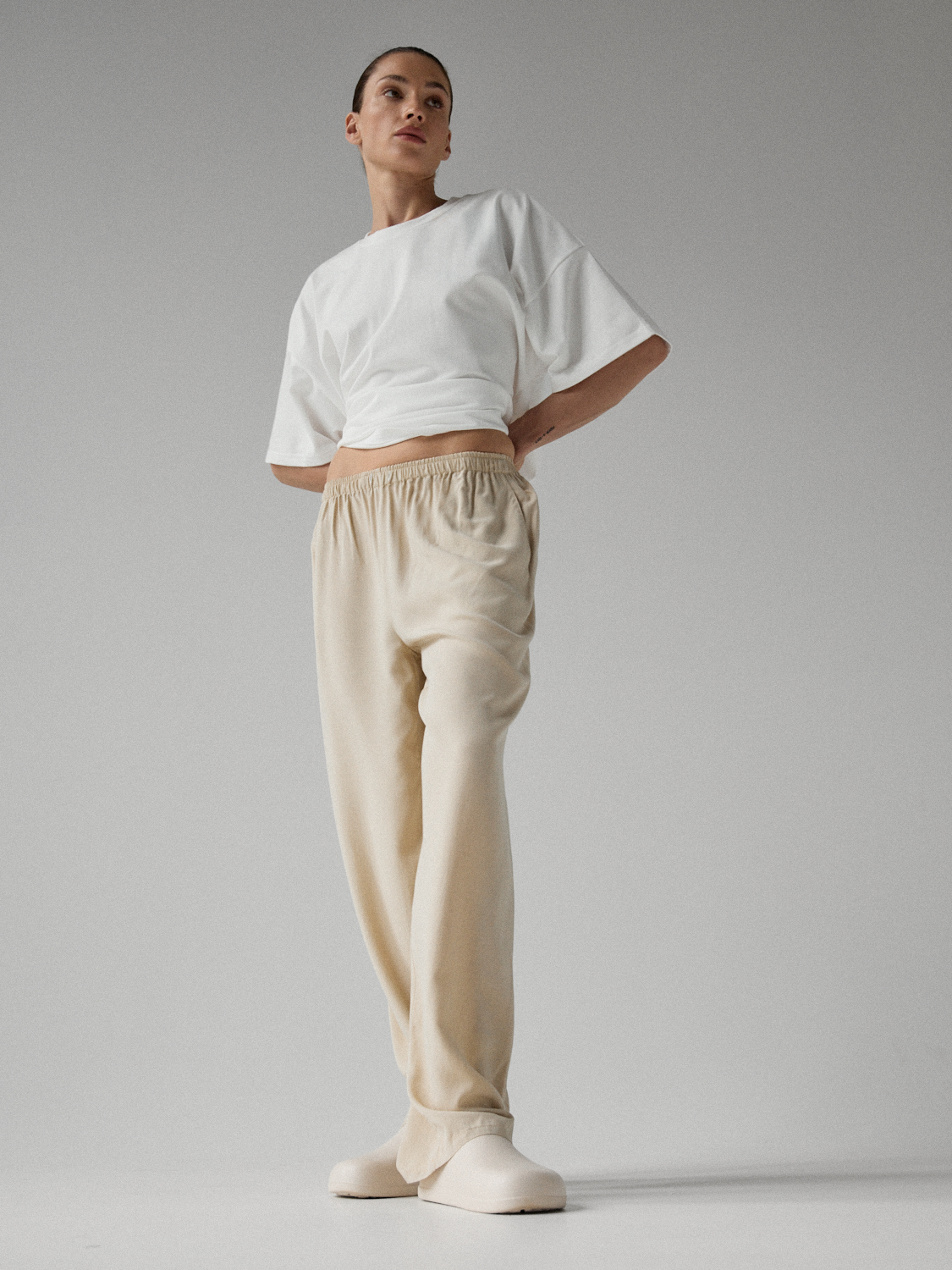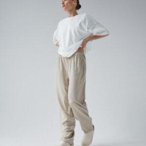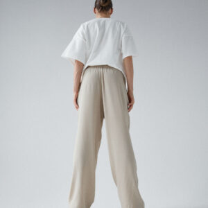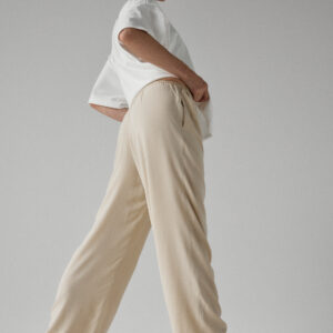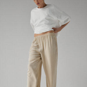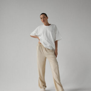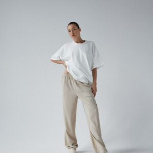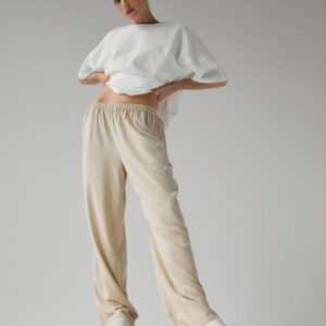 Nowa odsłona naszych bestsellerowych spodni DUE. Spodnie z prostą nogawka. W pasie wszyta delikatnie opinająca talię gumka. Idealnie sprawdzi się w zestawie z koszulką DUE w tym samym odcieniu. Lejący materiał świetnie się układa oraz zapewnia swobodę ruchu.