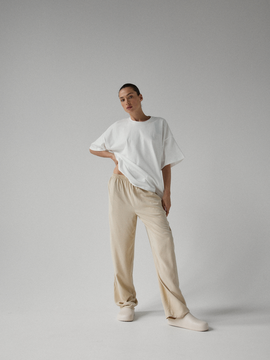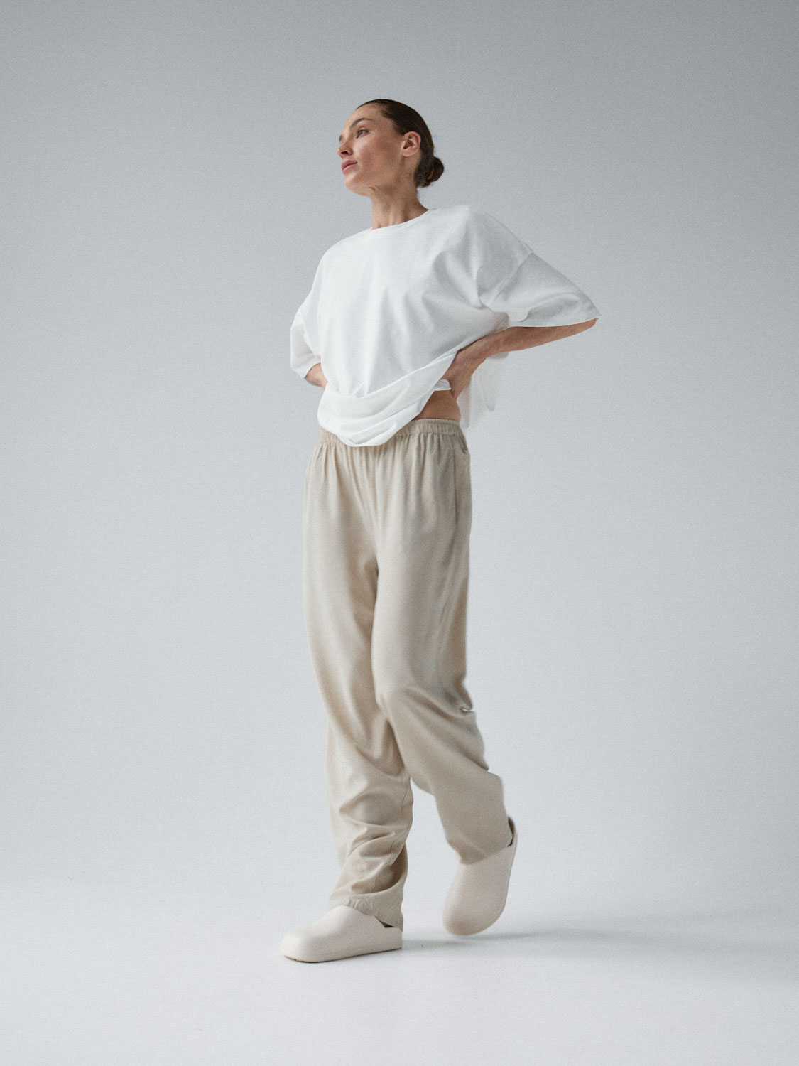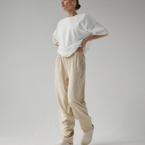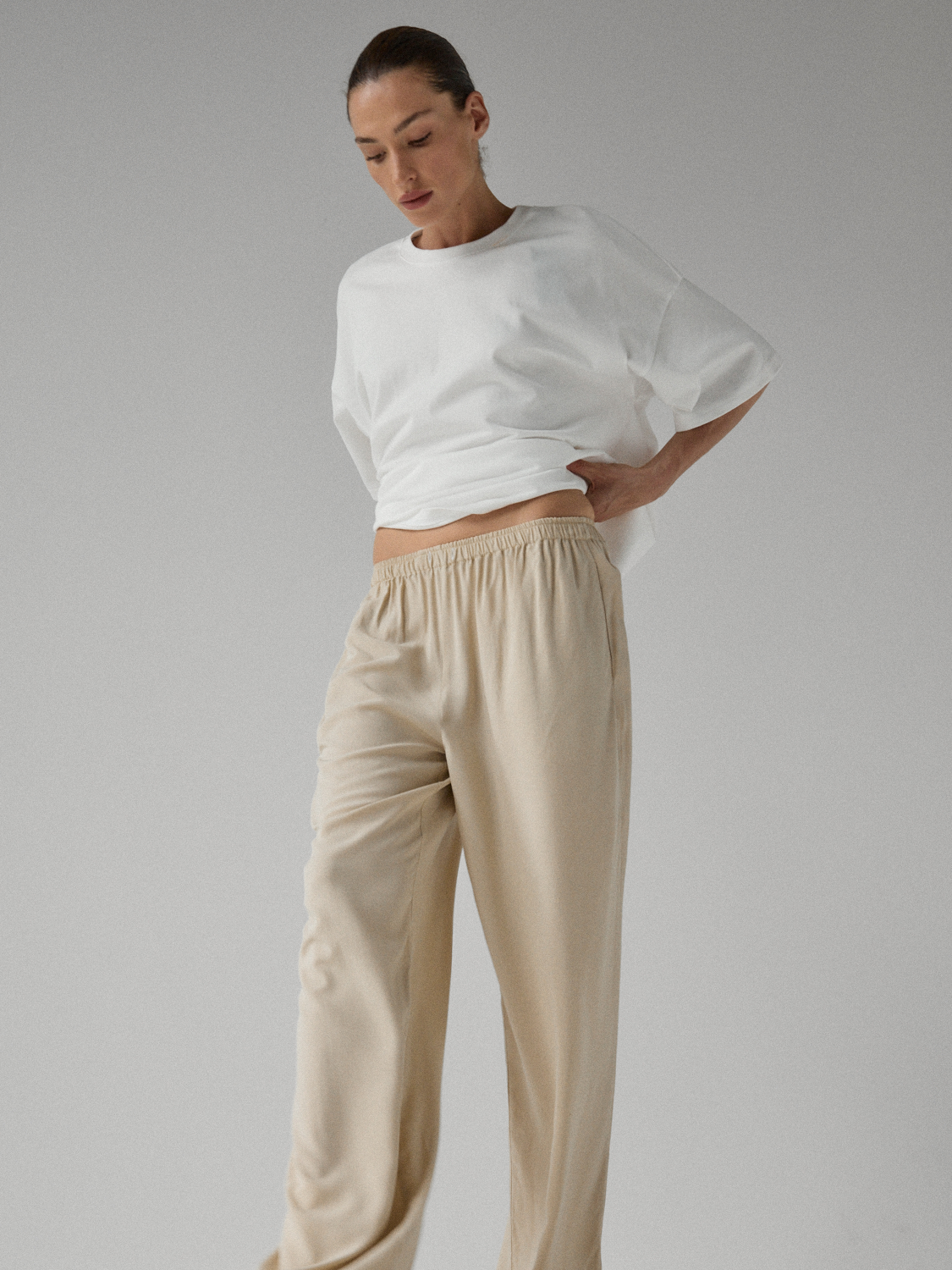 Nowa odsłona naszych bestsellerowych spodni DUE. Spodnie z prostą nogawka. W pasie wszyta delikatnie opinająca talię gumka. Idealnie sprawdzi się w zestawie z koszulką DUE w tym samym odcieniu. Lejący materiał świetnie się układa oraz zapewnia swobodę ruchu.
