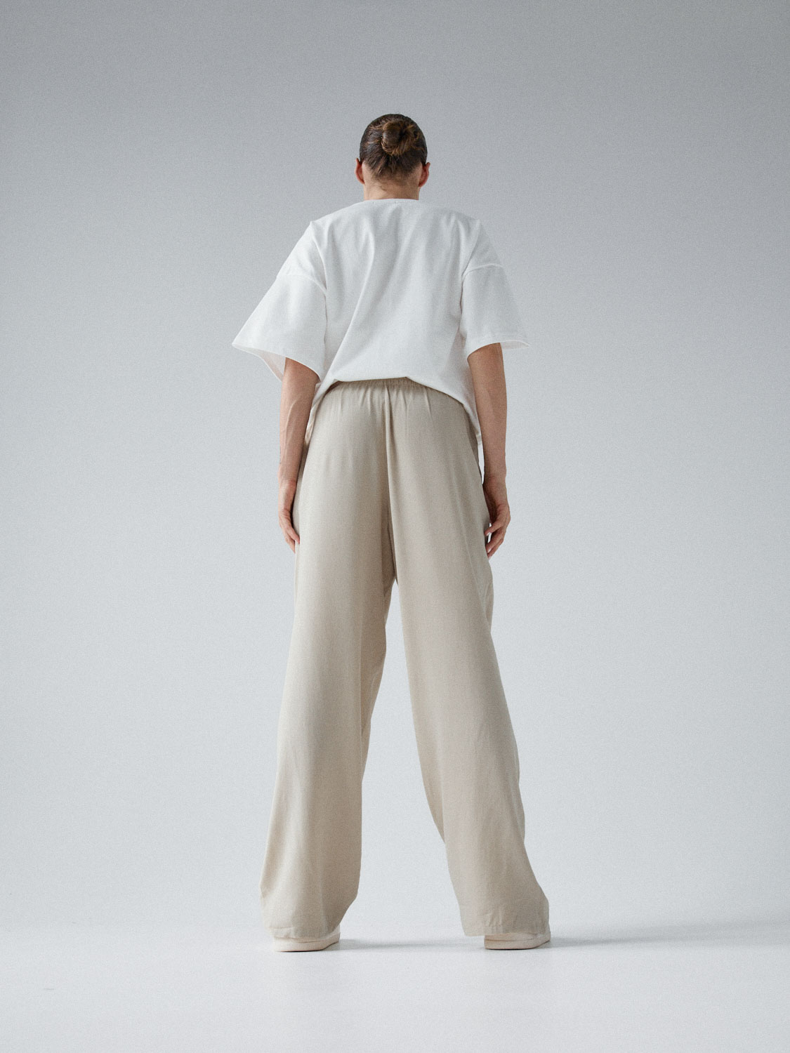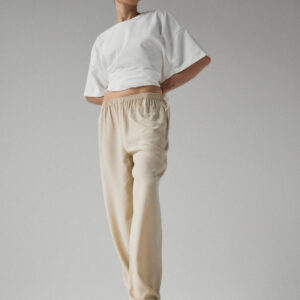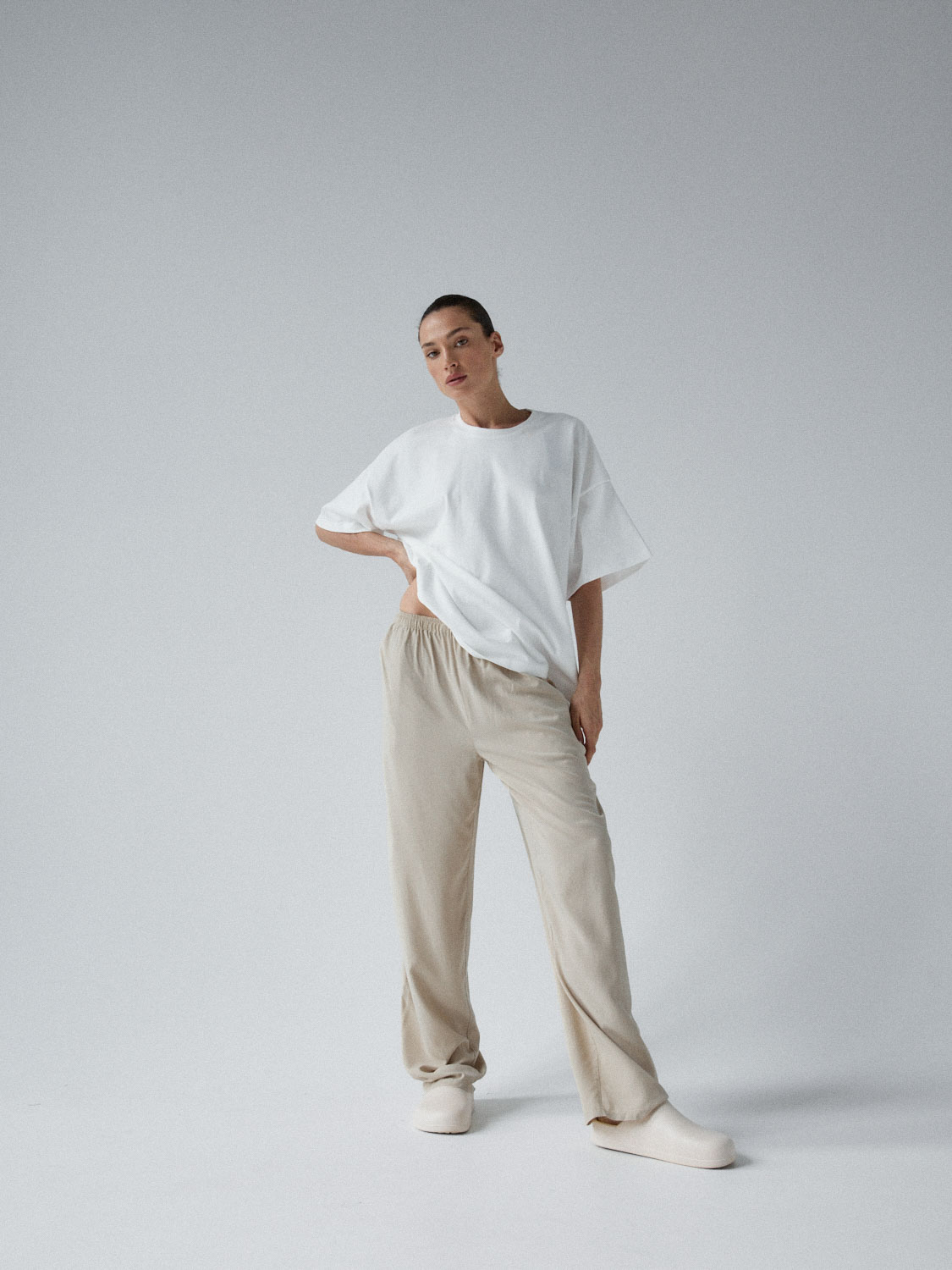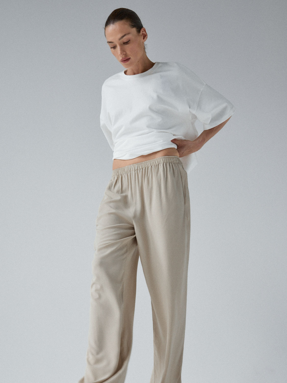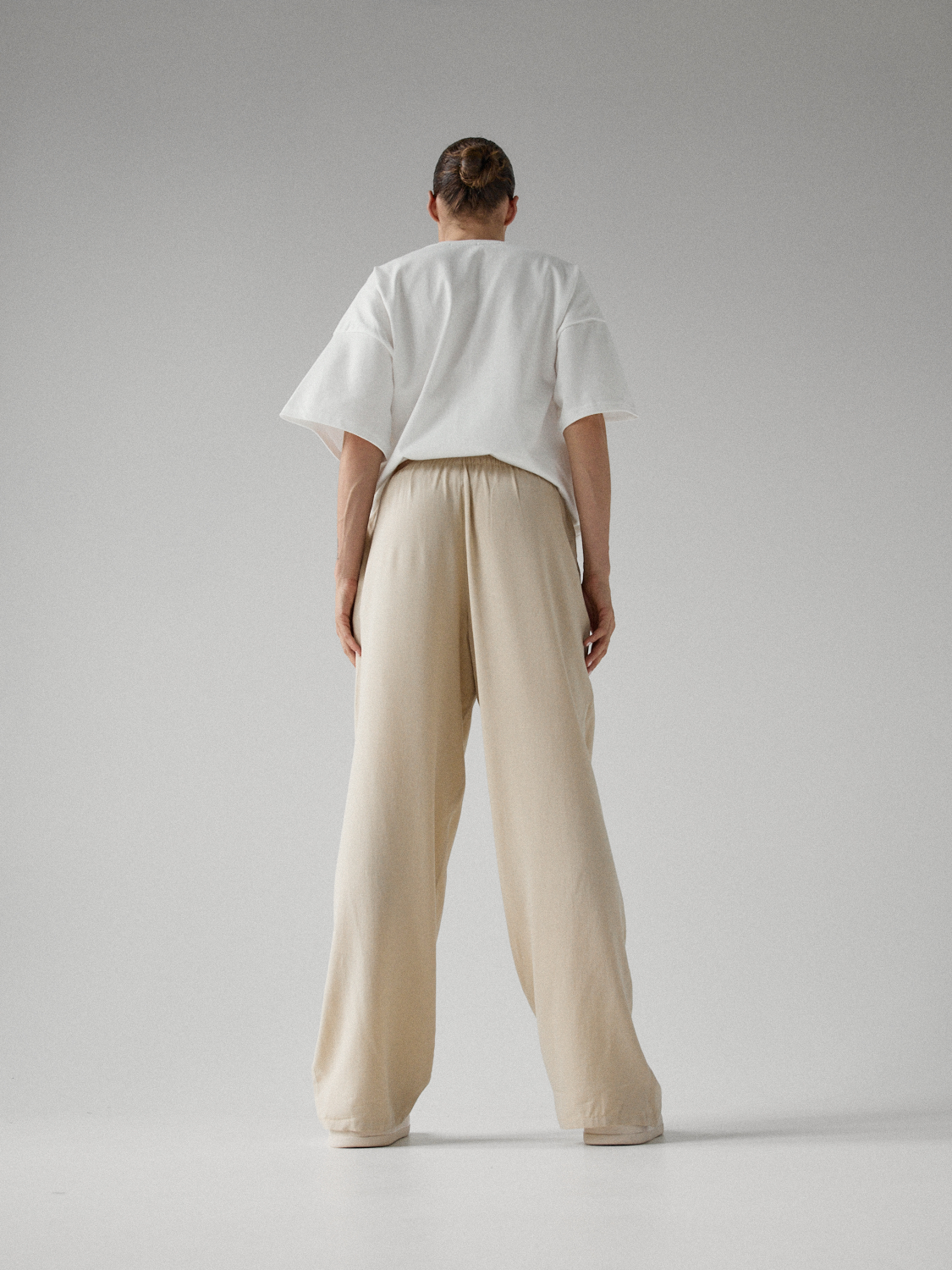 Nowa odsłona naszych bestsellerowych spodni DUE. Spodnie z prostą nogawka. W pasie wszyta delikatnie opinająca talię gumka. Idealnie sprawdzi się w zestawie z koszulką DUE w tym samym odcieniu. Lejący materiał świetnie się układa oraz zapewnia swobodę ruchu.