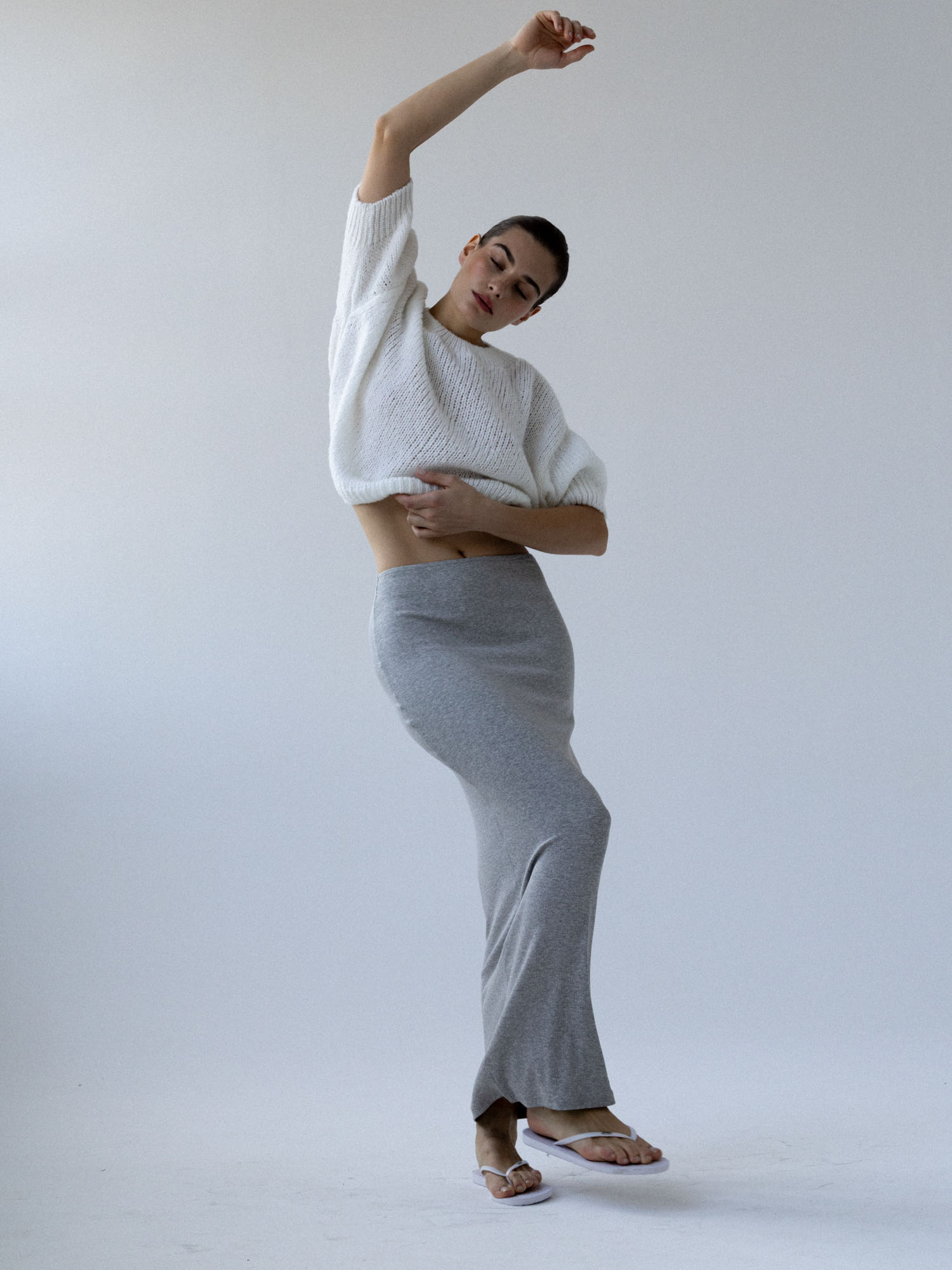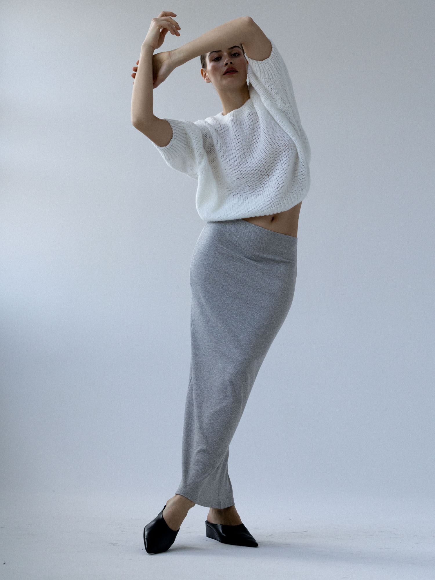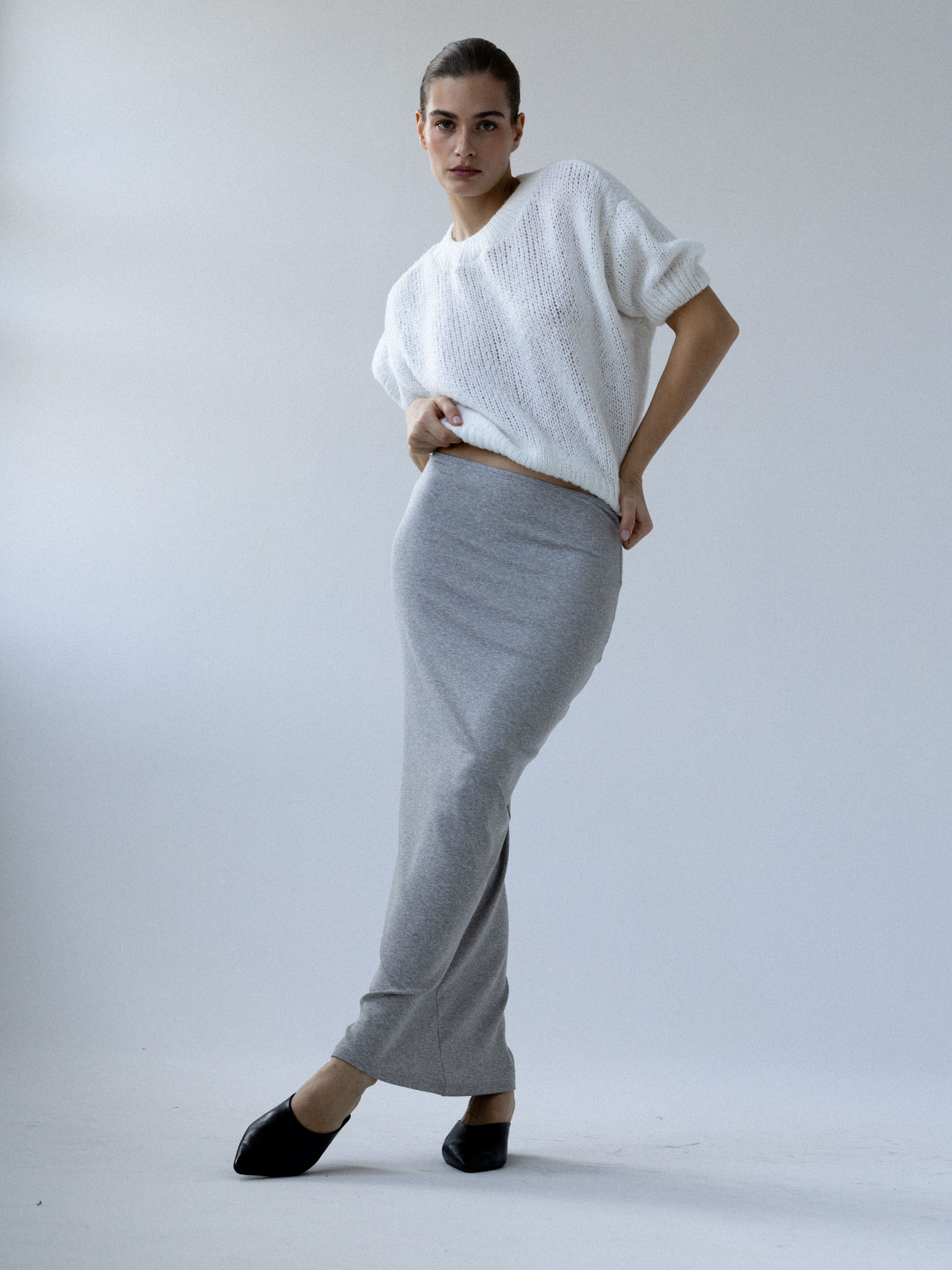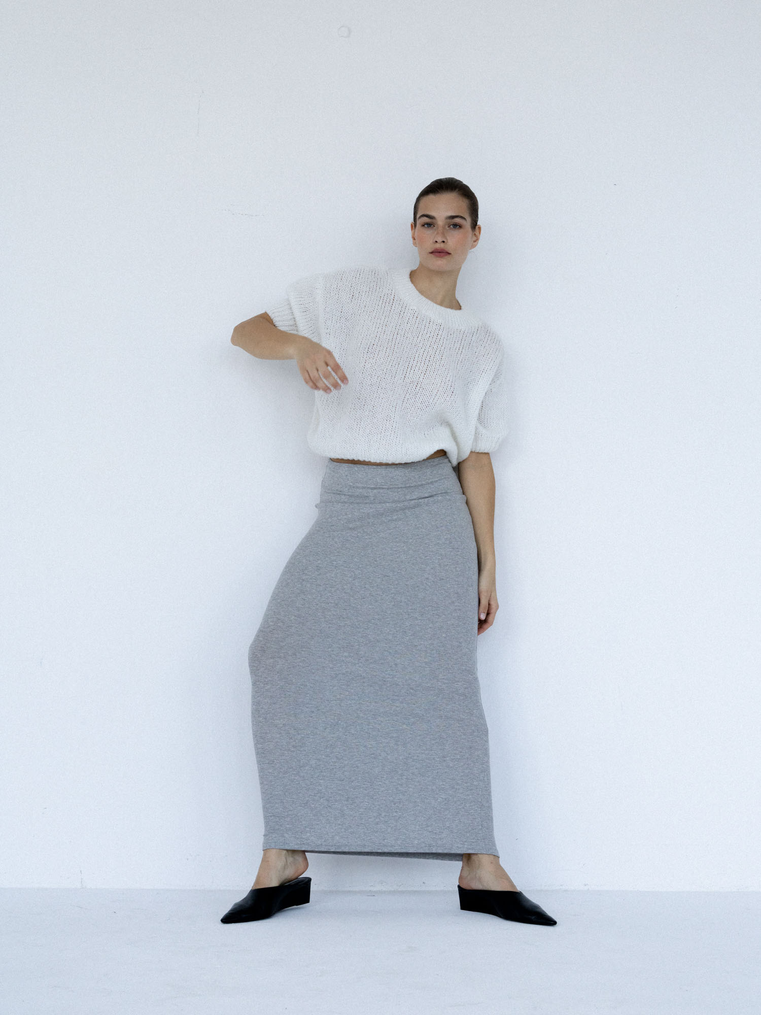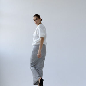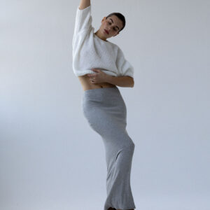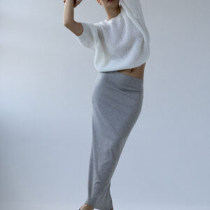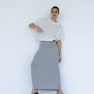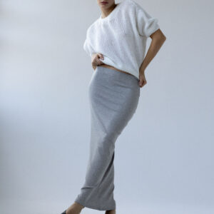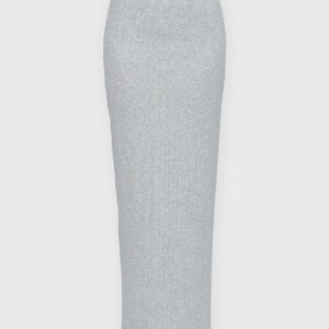 Długa, dopasowana, podkreślająca figurę spódnica wykonana z dzianiny w prążek. Wysoki stan, elastyczna talia, prosty brzeg u dołu. Idealna baza zarówno do codziennych, jak i eleganckich stylizacji.
