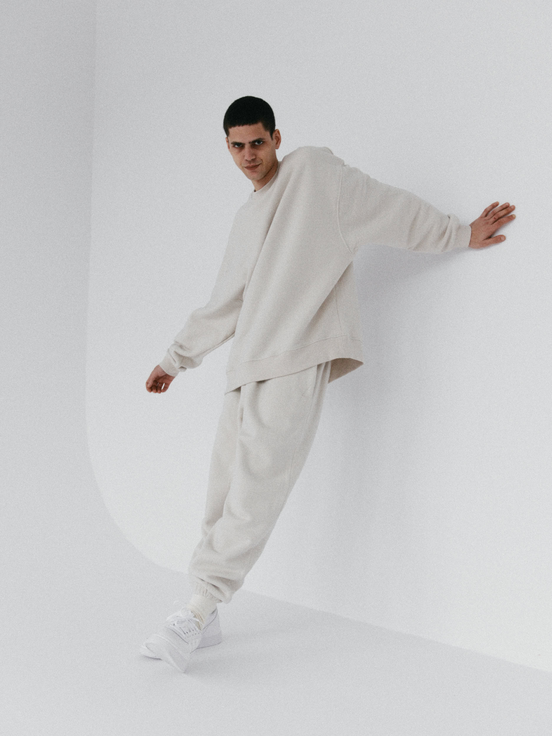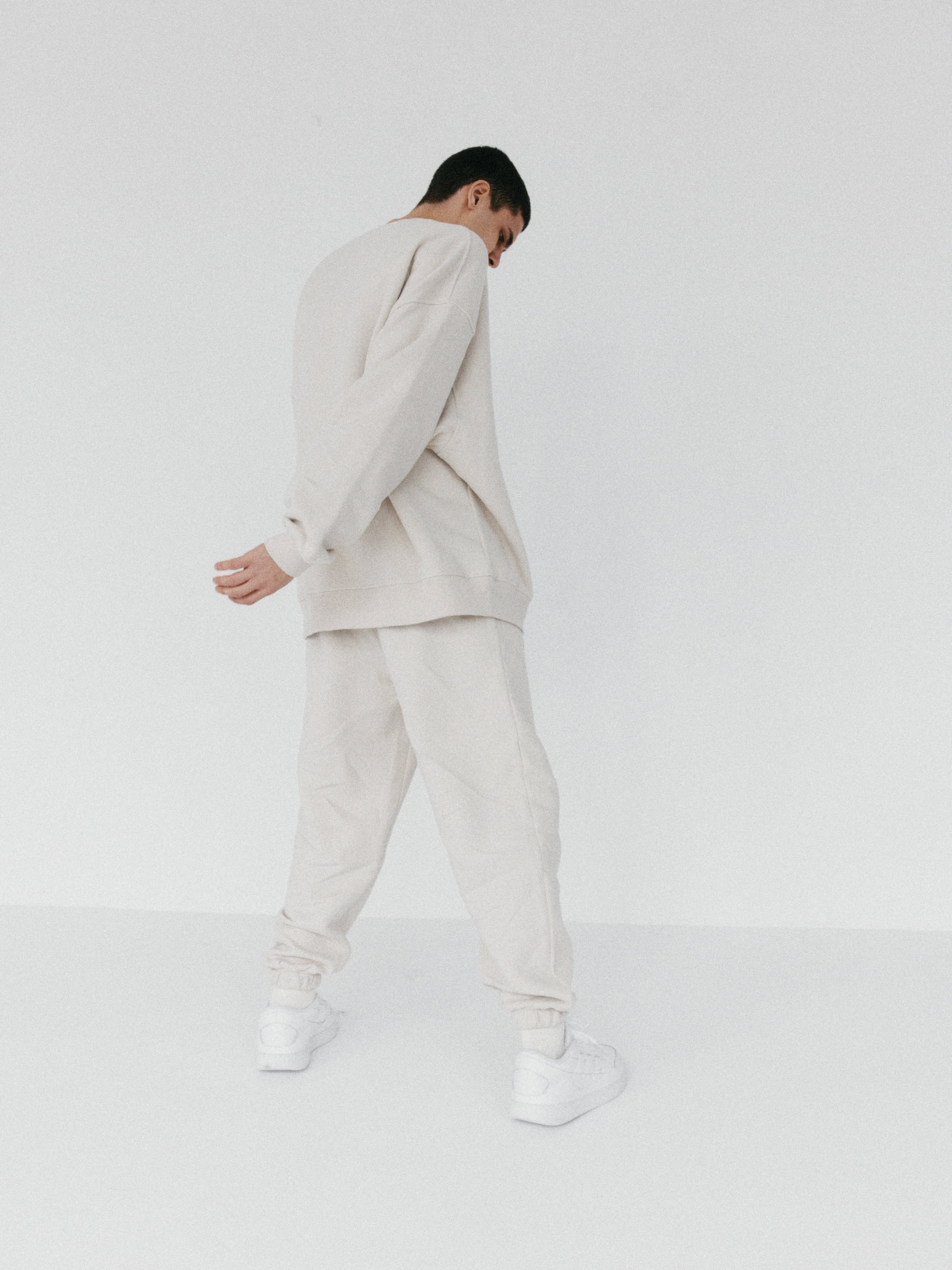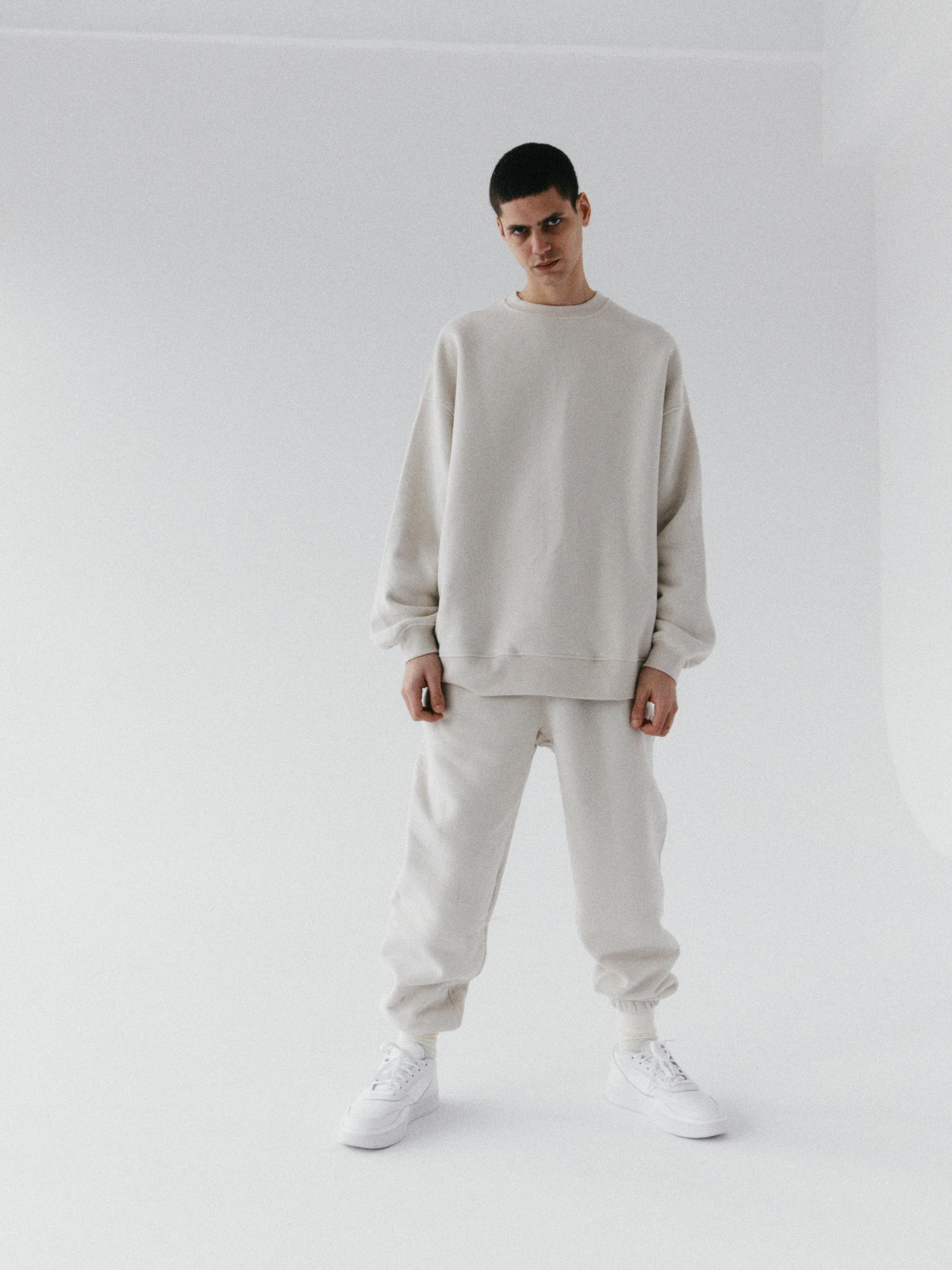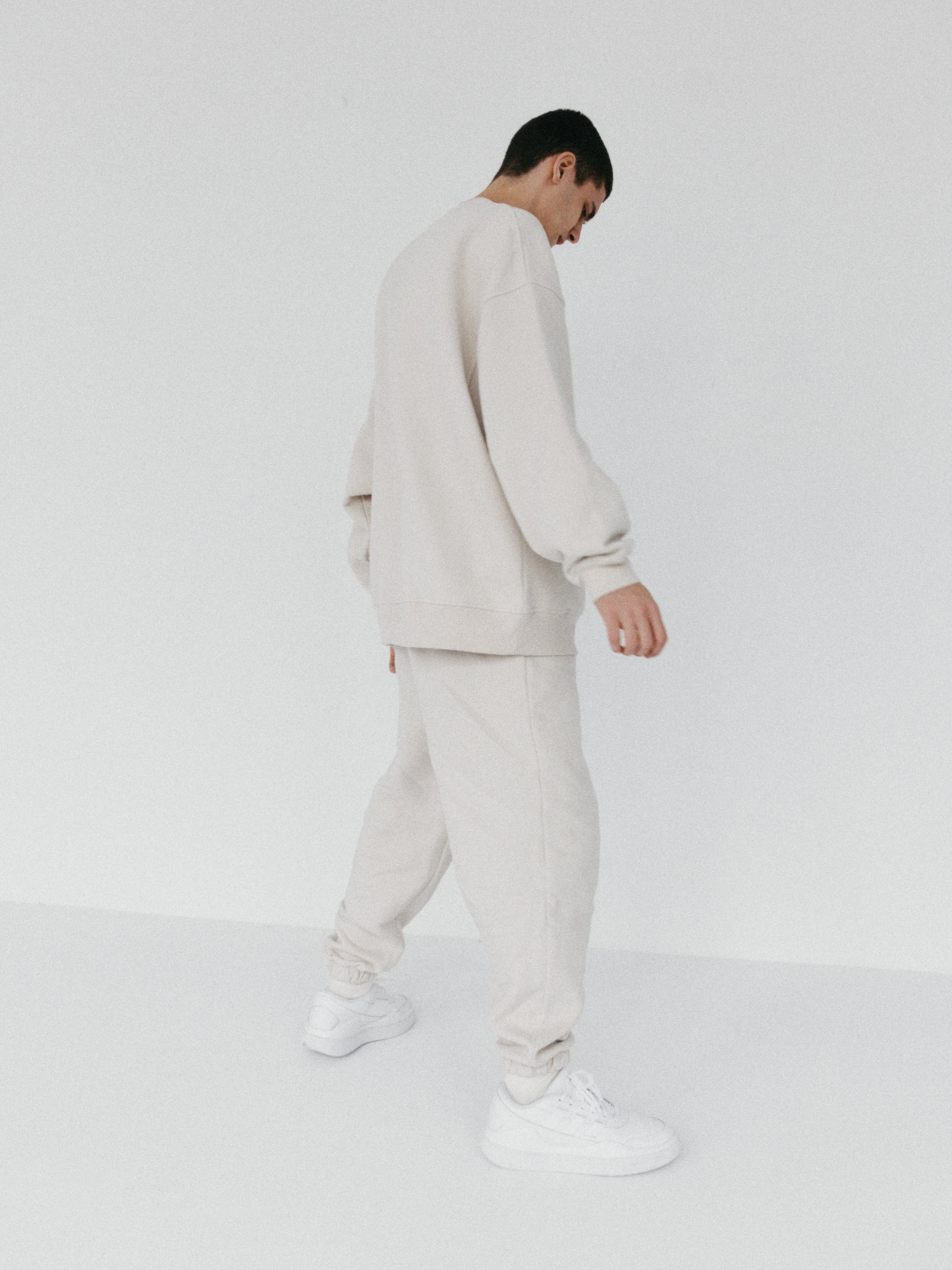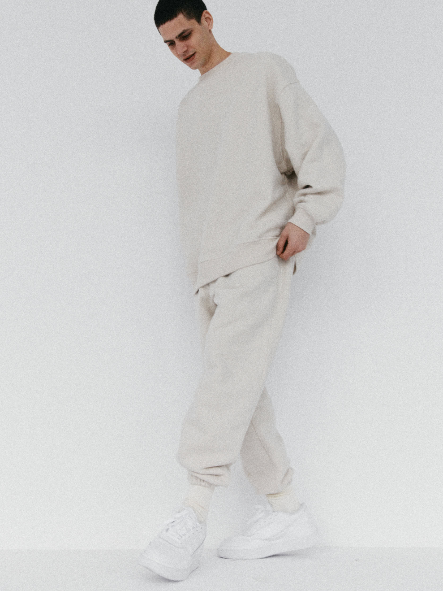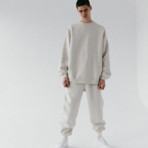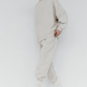 Spodnie dresowe o kroju baggy, z niskim stanem, obniżoną linią kroku i dłuższymi nogawkami. Model posiada głębokie kieszenie i możemy nosić go na dwa sposoby: z lekko podniesioną nogawką, bądź swobodnie opuszczoną przy kostce. Idealnie prezentują się z bluzą oversize unisex 1990 almond beige.
