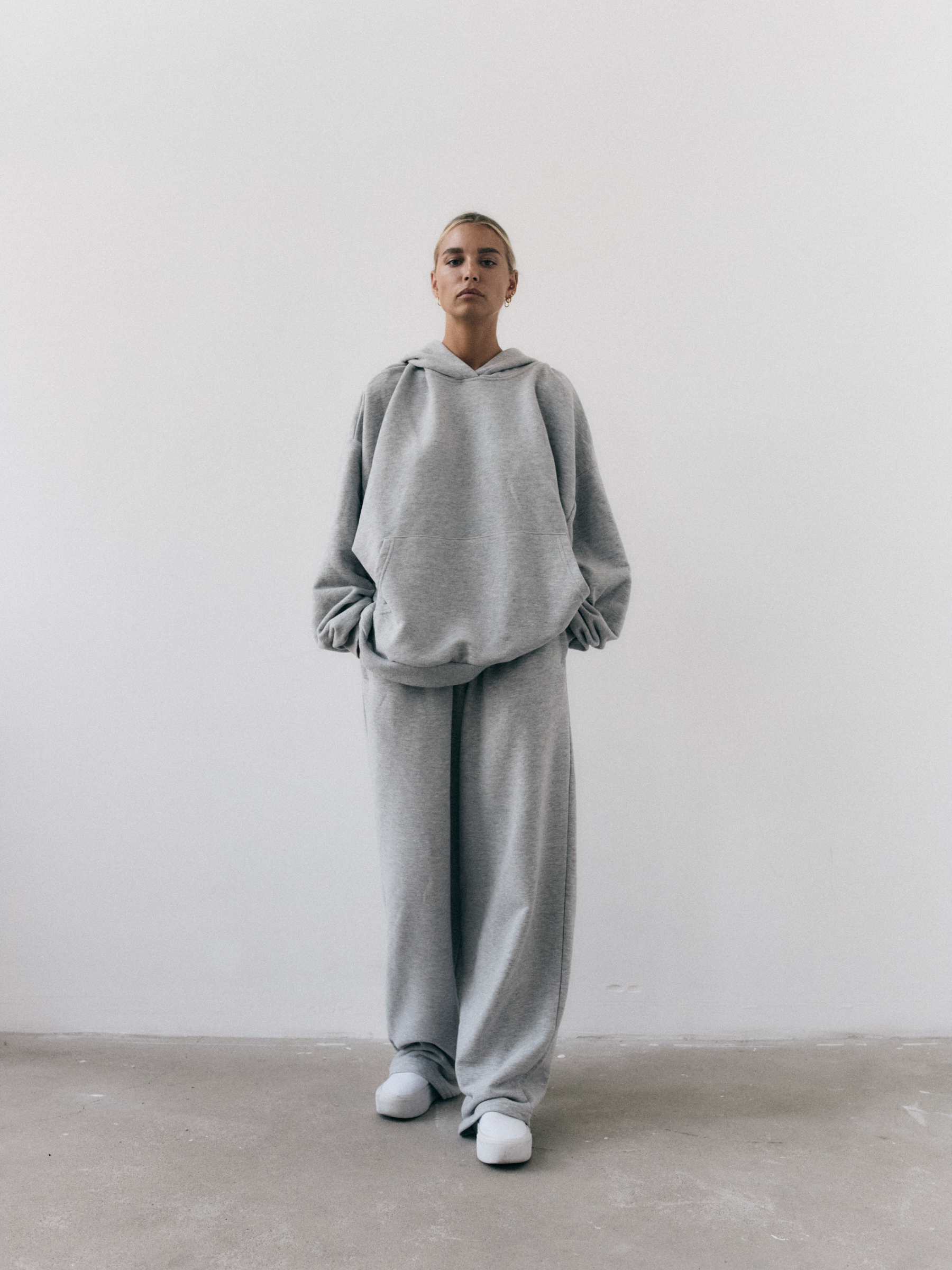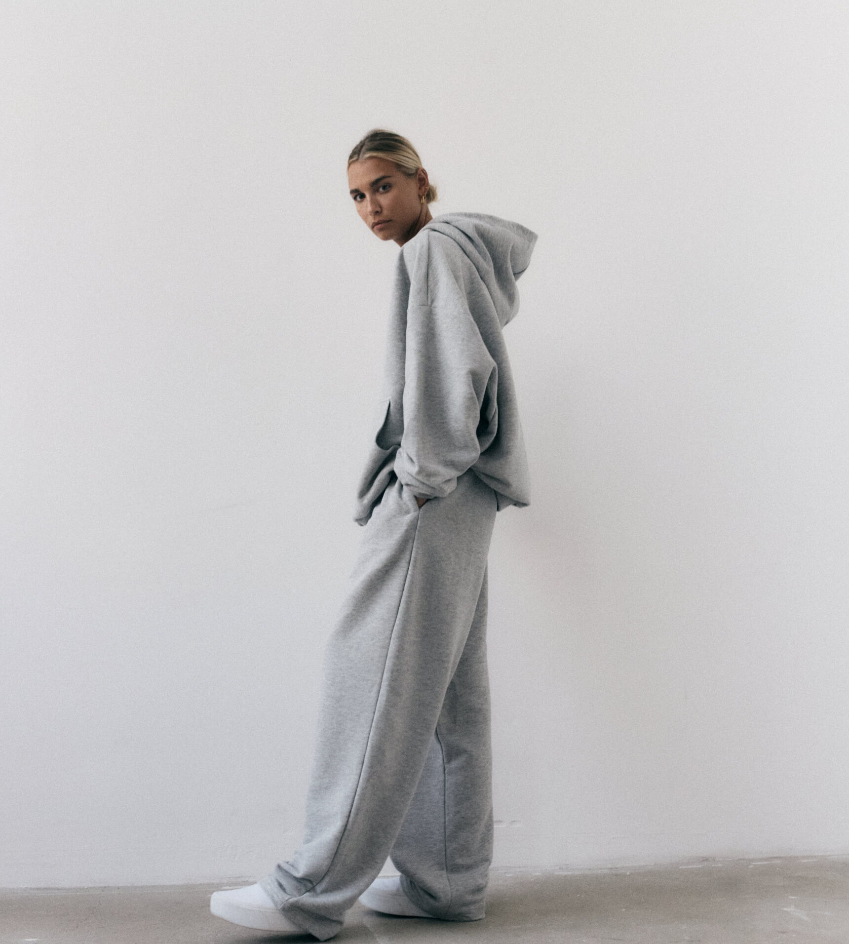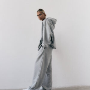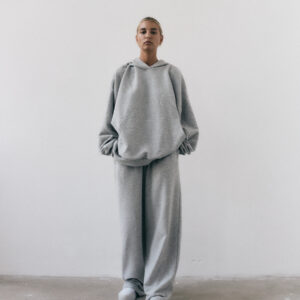 Spodnie dresowe o luźniejszym kroju z wysokim stanem i zaczepnie przydługimi nogawkami. Charakterystyczna dla tego modelu jest szeroka guma w pasie oraz proste nogawki swobodnie opadające na stopy. Model posiada funkcjonalne kieszenie po bokach, Razem z oversize’ową bluzą z kapturem LE PUMP stanowią zestaw doskonały.
