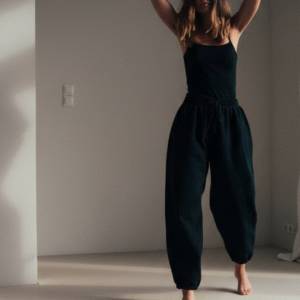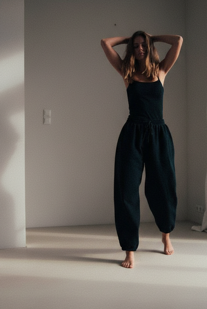 Spodnie dresowe o kroju baggy, z wysokim stanem, obniżoną linią kroku i dłuższymi nogawkami. Model posiada głębokie kieszenie i możemy nosić go na dwa sposoby: z lekko podniesioną nogawką, bądź swobodnie opuszczoną przy kostce. Idealnie prezentują się z bluzą oversize SMOOTH COTTON black oraz bluzą z kapturem cropped SMOOTH COTTON black.