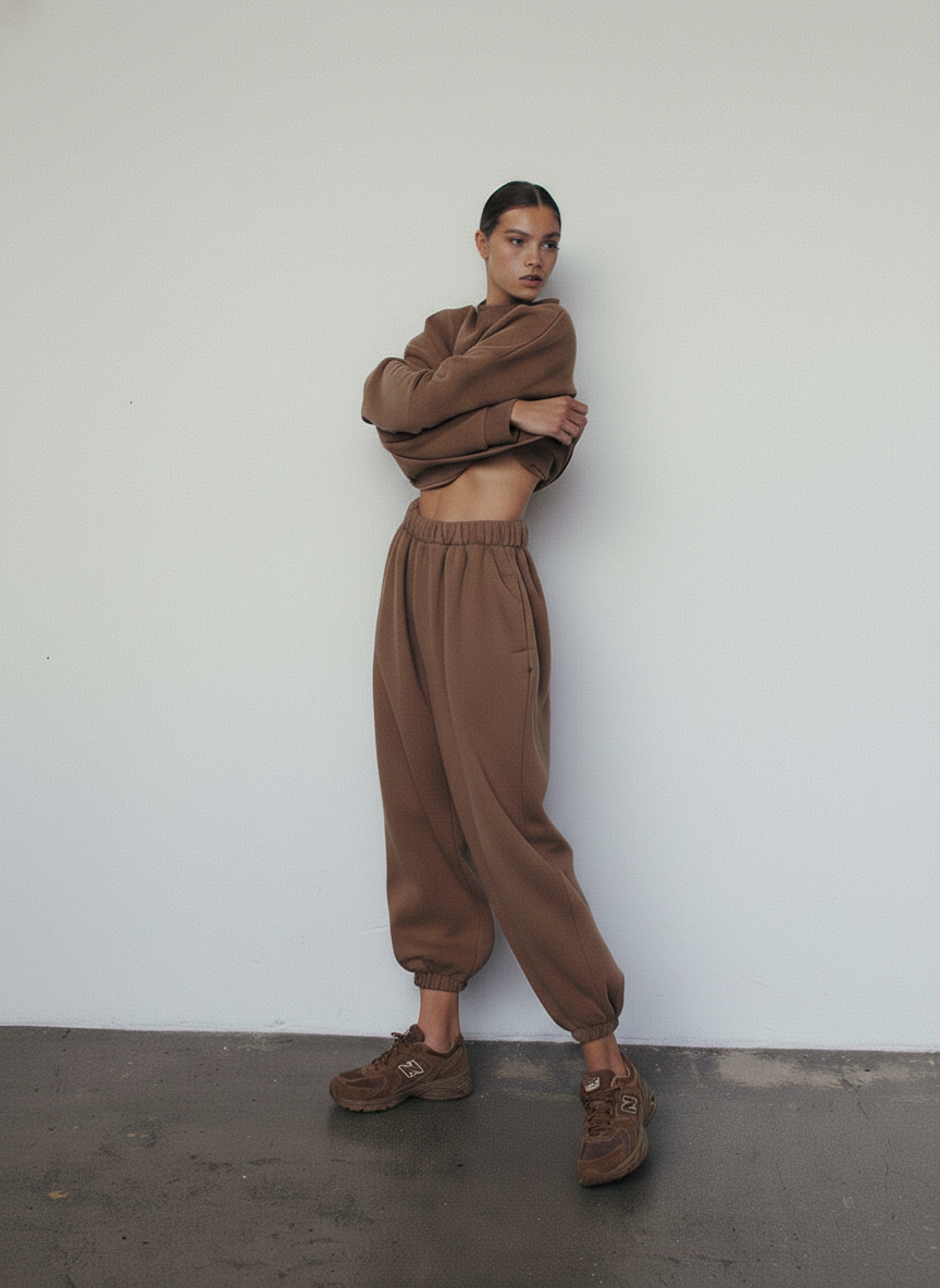 Spodnie dresowe o kroju baggy, z wysokim stanem, obniżoną linią kroku i dłuższymi nogawkami. Model posiada głębokie kieszenie i możemy nosić go na dwa sposoby: z lekko podniesioną nogawką, bądź swobodnie opuszczoną przy kostce. W odróżnieniu od pozostałych modeli SMOOTH COTTON, spodnie nie posiadają sznurka w pasie. Idealnie prezentują się z bluzą cropped SMOOTH COTTON peanut butter.