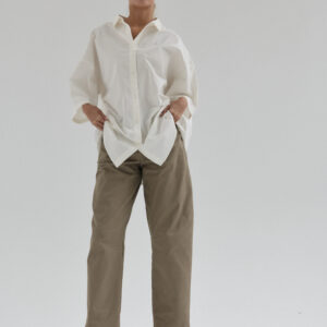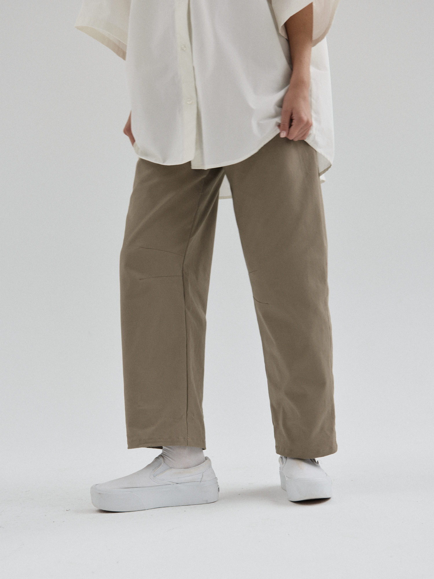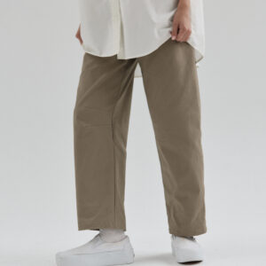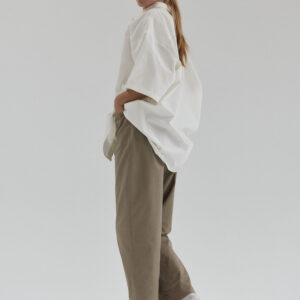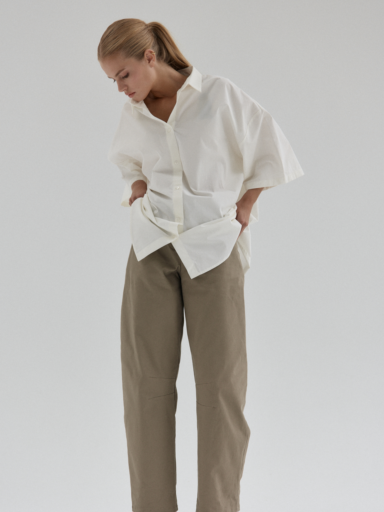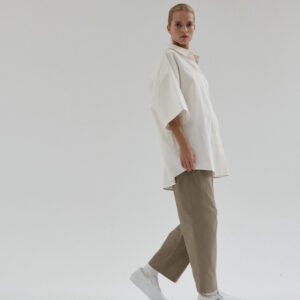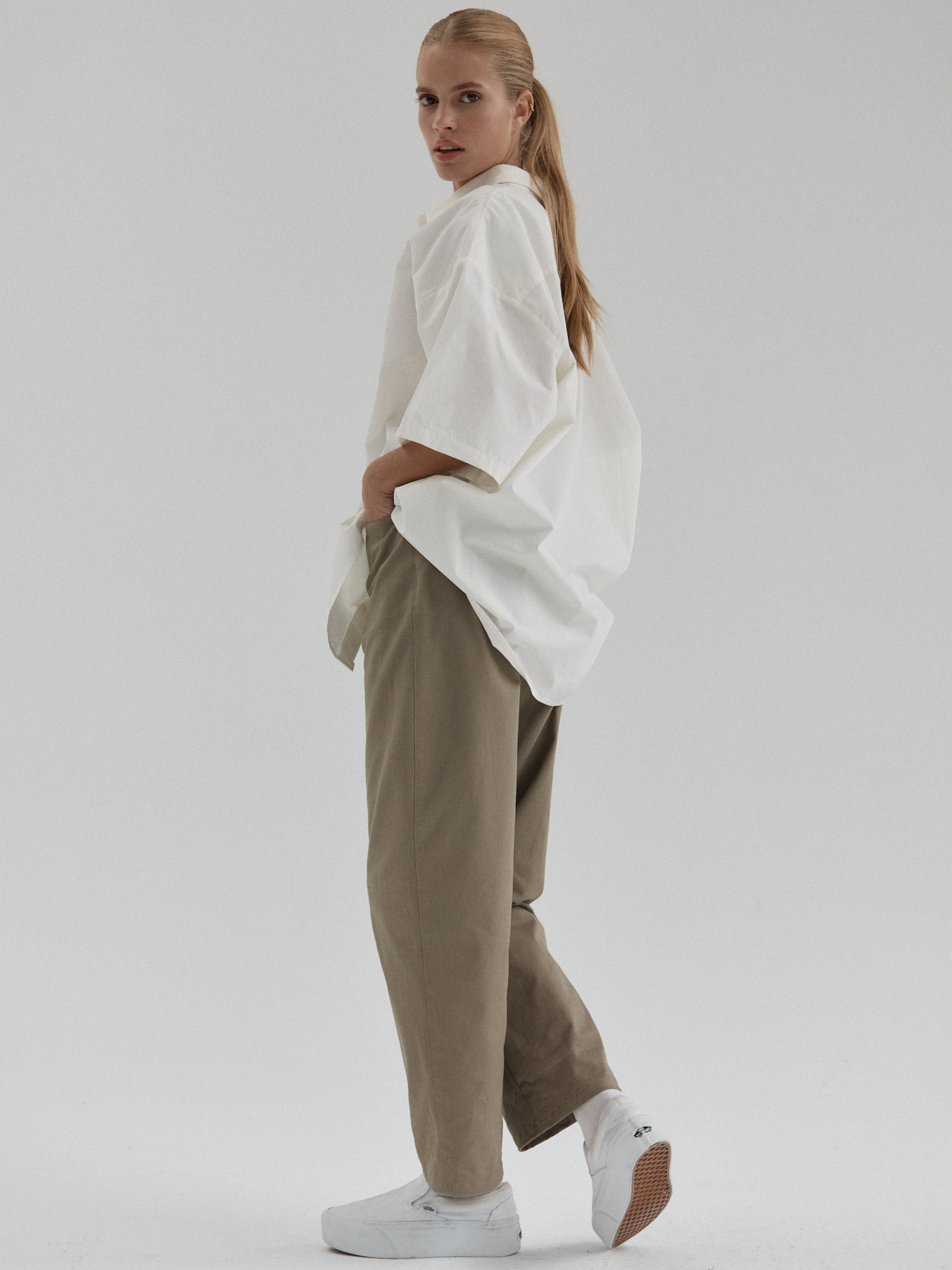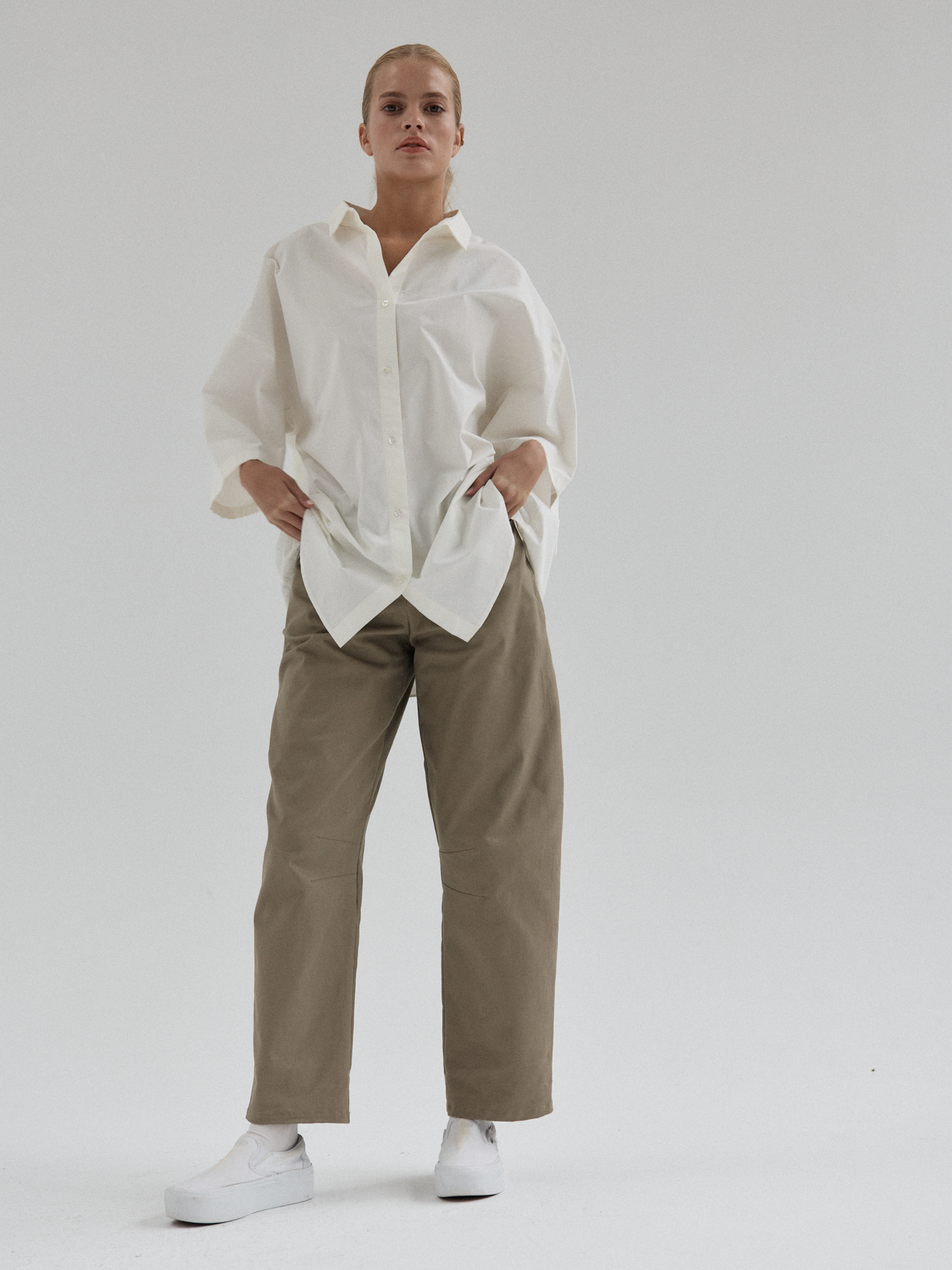 Spodnie typu balloon o luźnym, prostym kroju. Model posiada średni stan i nogawki przed kostkę. Wysoka gramatura bawełny sprawia, że spodnie trzymają formę, jednocześnie zapewniając komfort noszenia. Całości dopełniają funkcjonalne kieszenie oraz przeszycia na kolanach. Doskonale komponują się z oversize’ową koszulą czy dopasowanym topem.