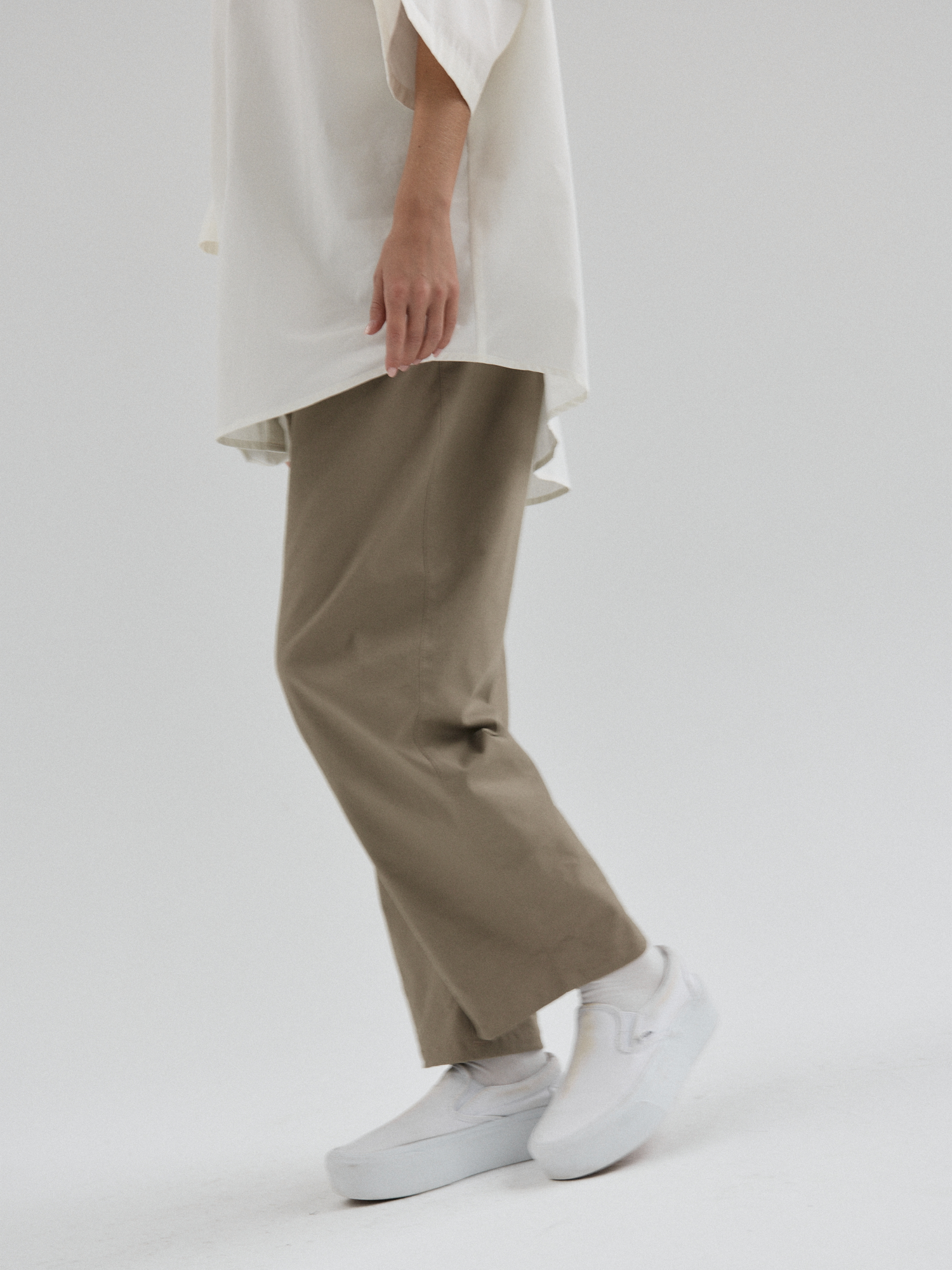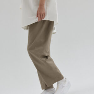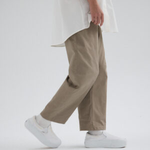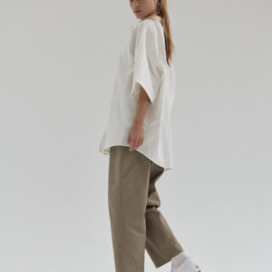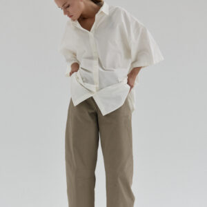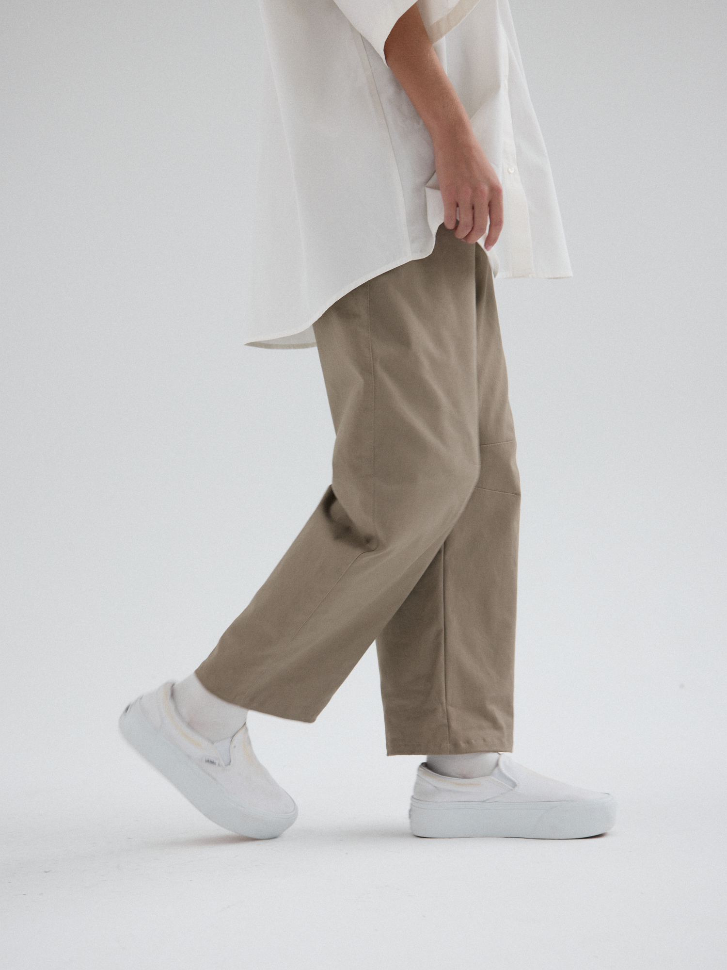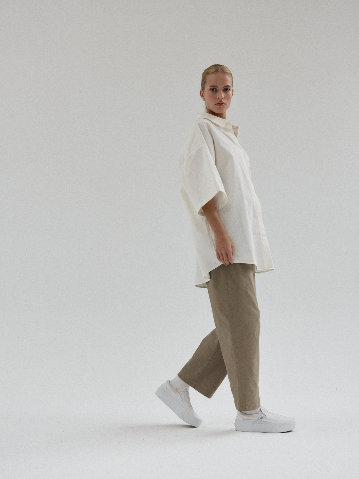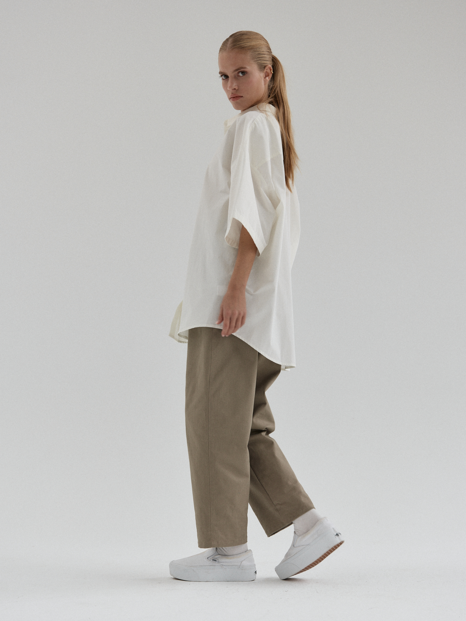 Spodnie typu balloon o luźnym, prostym kroju. Model posiada średni stan i nogawki przed kostkę. Wysoka gramatura bawełny sprawia, że spodnie trzymają formę, jednocześnie zapewniając komfort noszenia. Całości dopełniają funkcjonalne kieszenie oraz przeszycia na kolanach. Doskonale komponują się z oversize’ową koszulą czy dopasowanym topem.