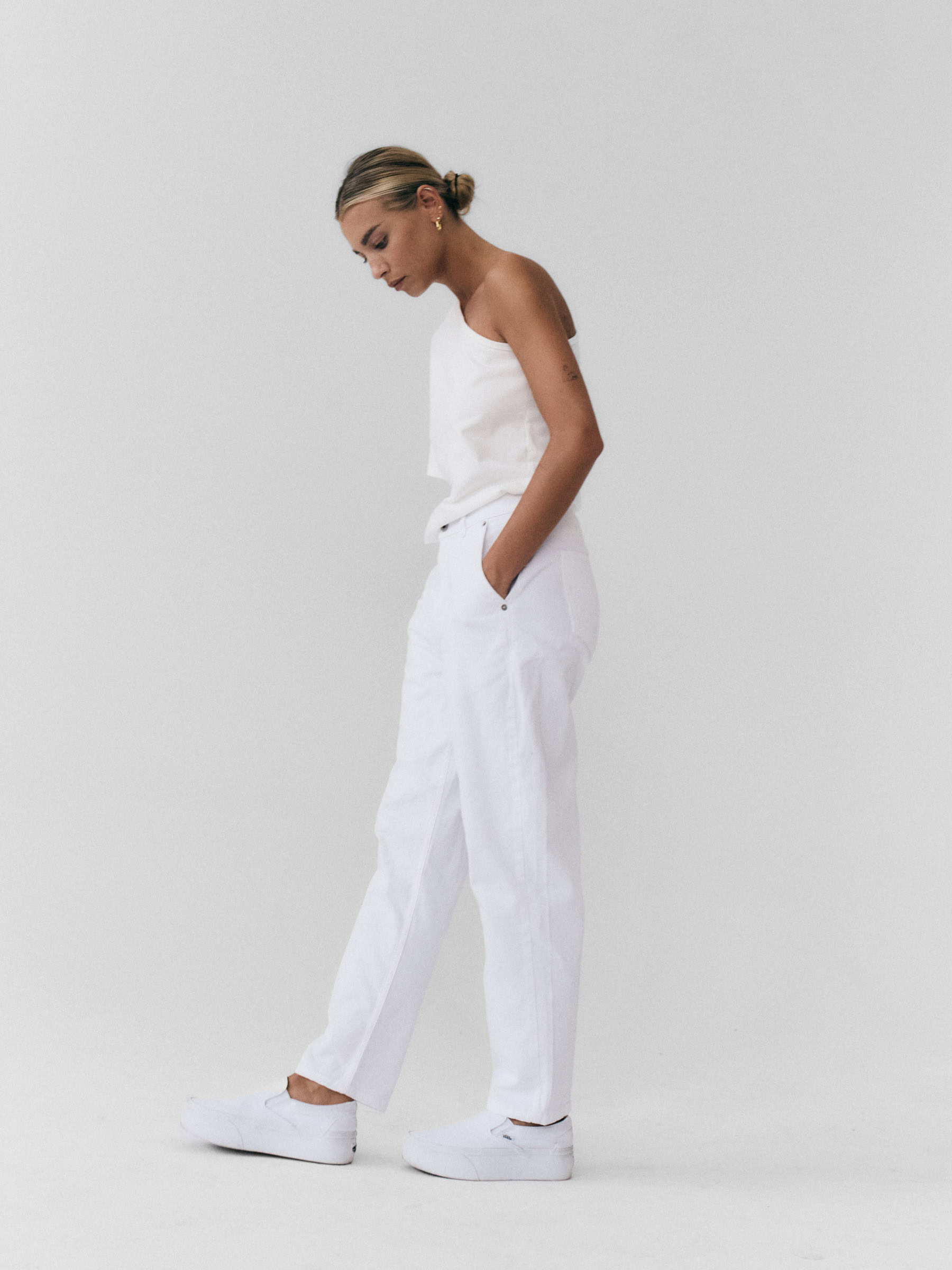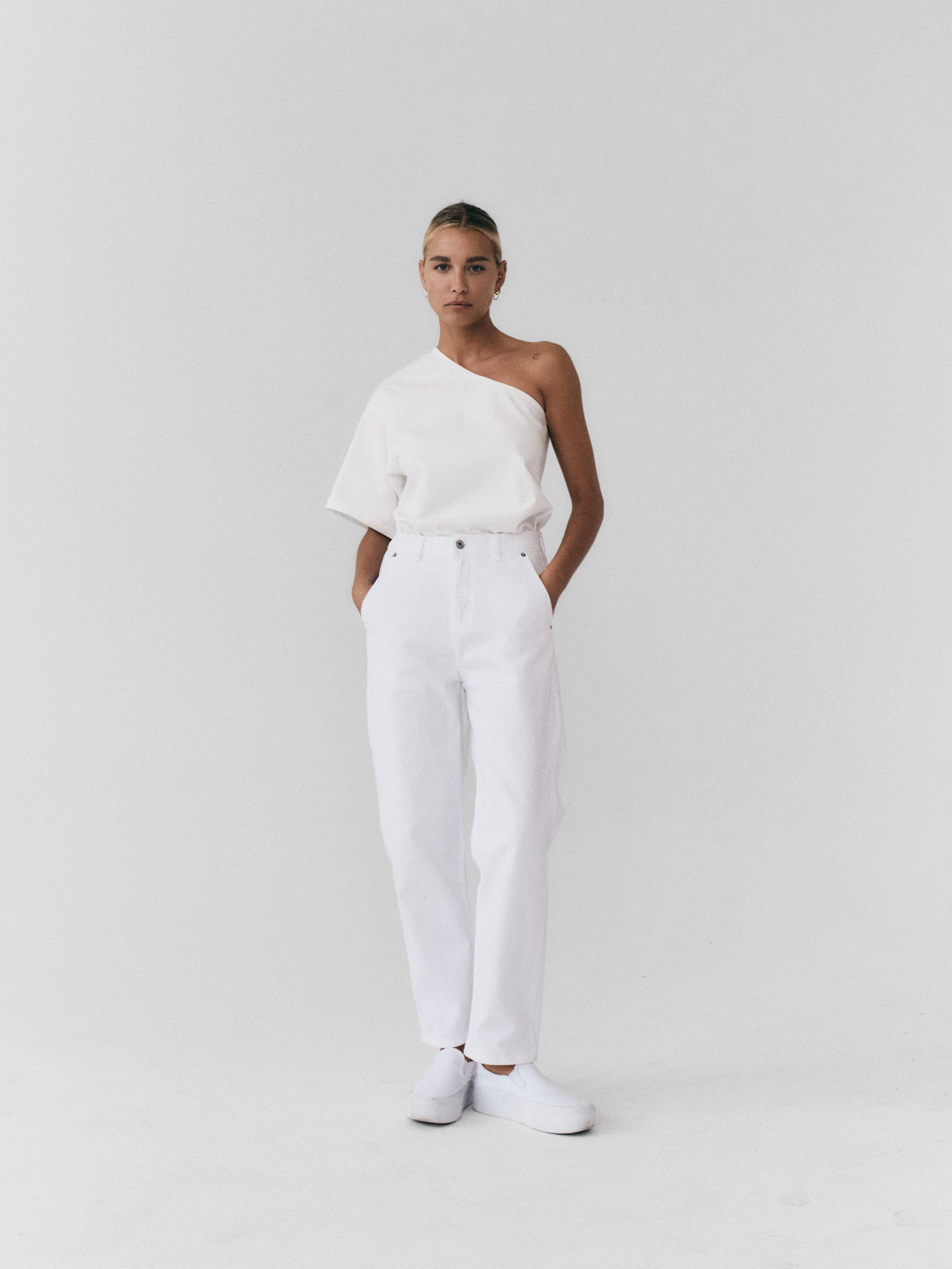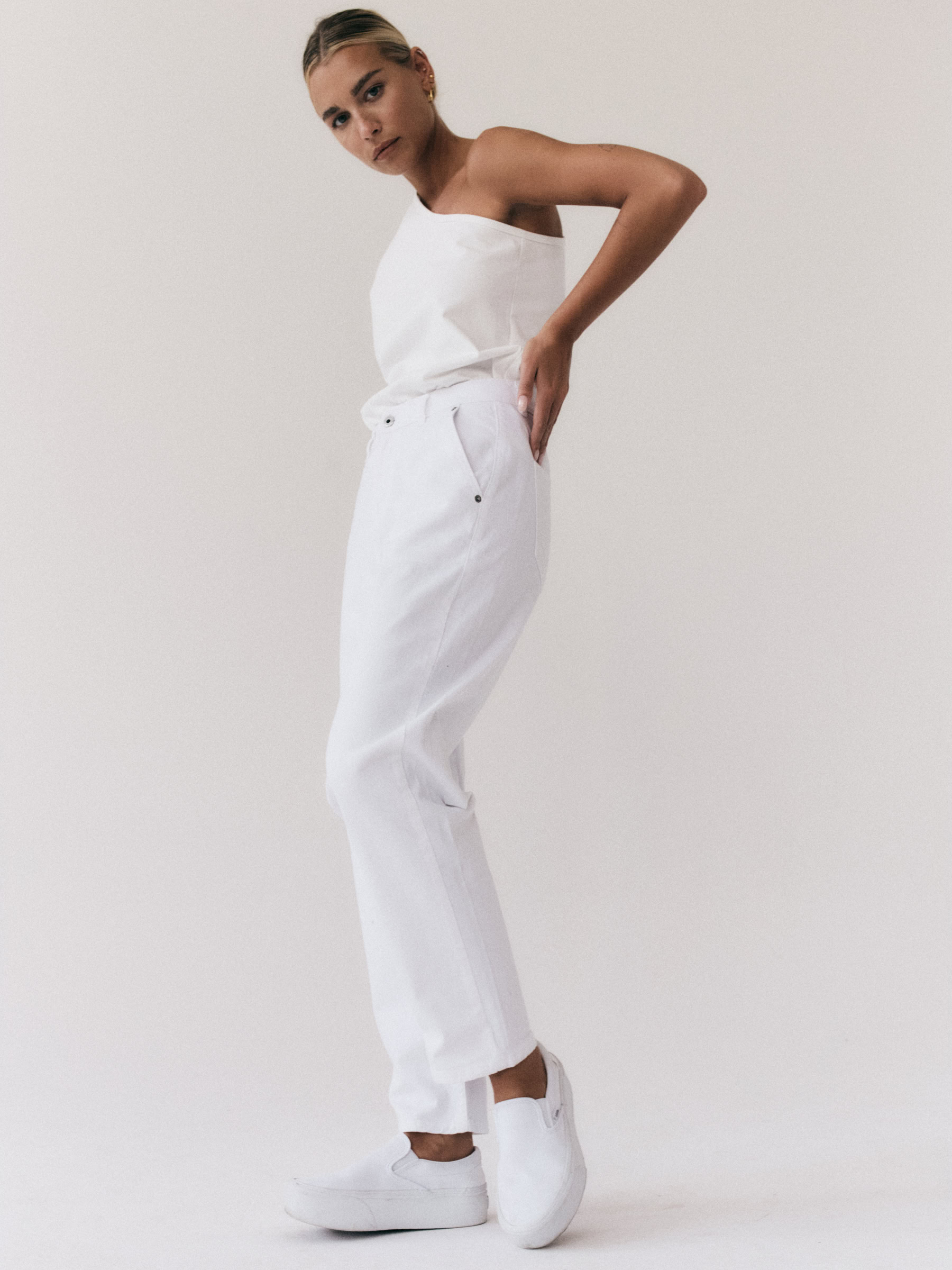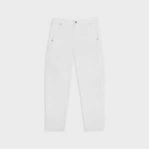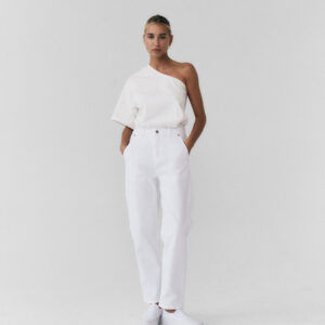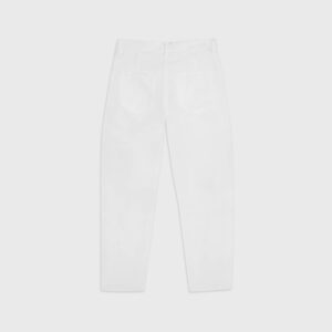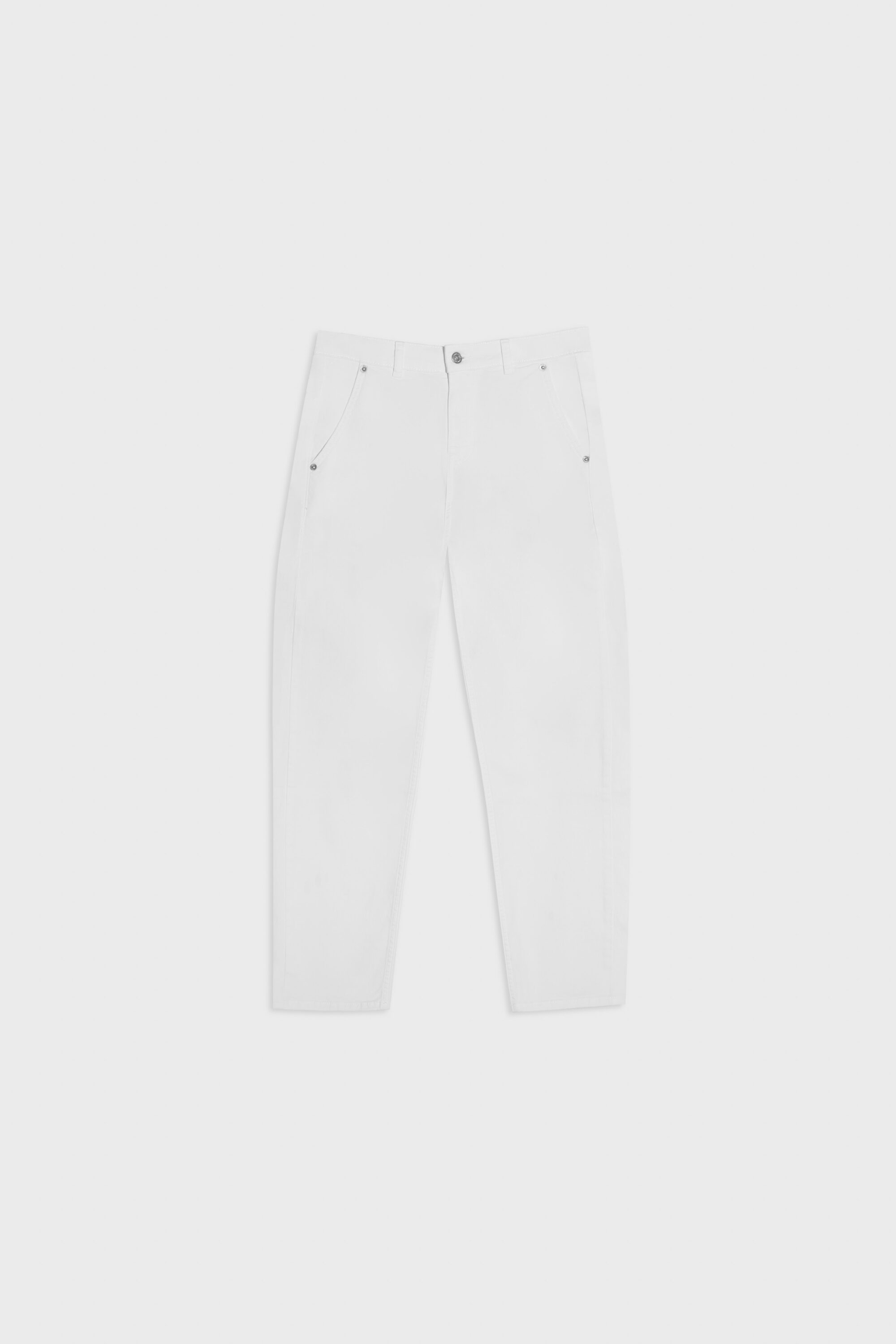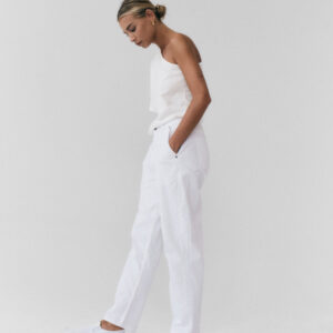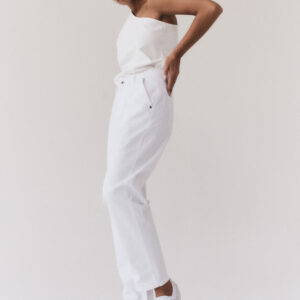 Spodnie typu cygaretki o luźnym, trapezowym kroju. Wysoki stan idealnie podkreśla talię. Nogawki lekko zwężane ku dołowi. Model posiada dwie funkcjonalne kieszenie po bokach. Spodnie zapinane na zamek i guzik. Będą wyglądać doskonale zarówno jako element codziennej stylizacji, jak i wieczorowej.