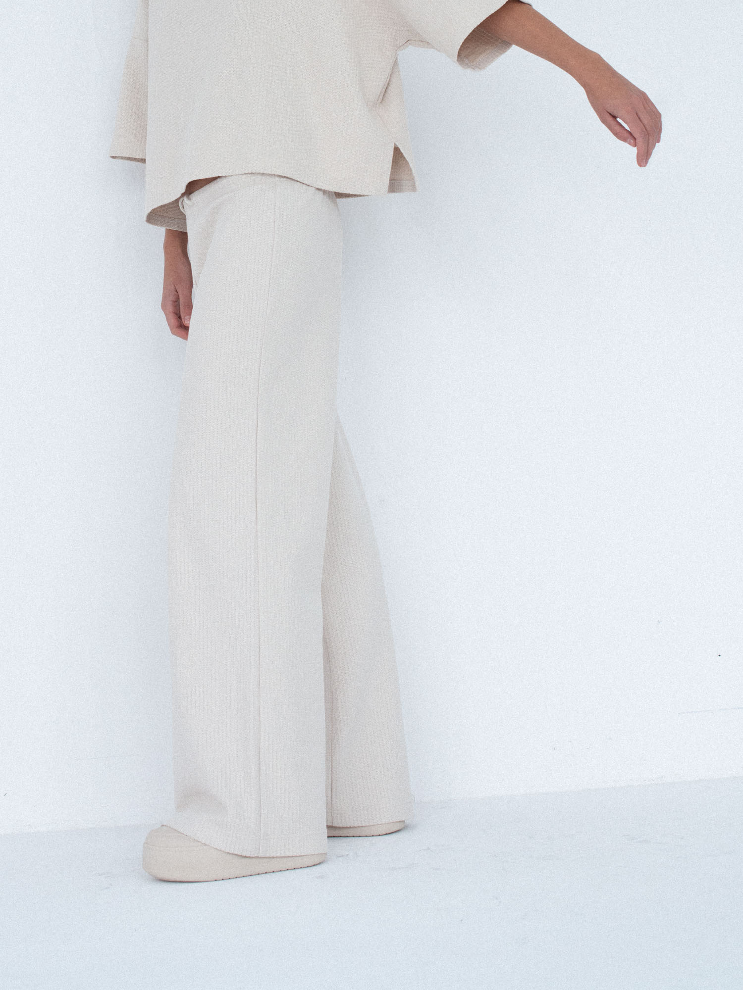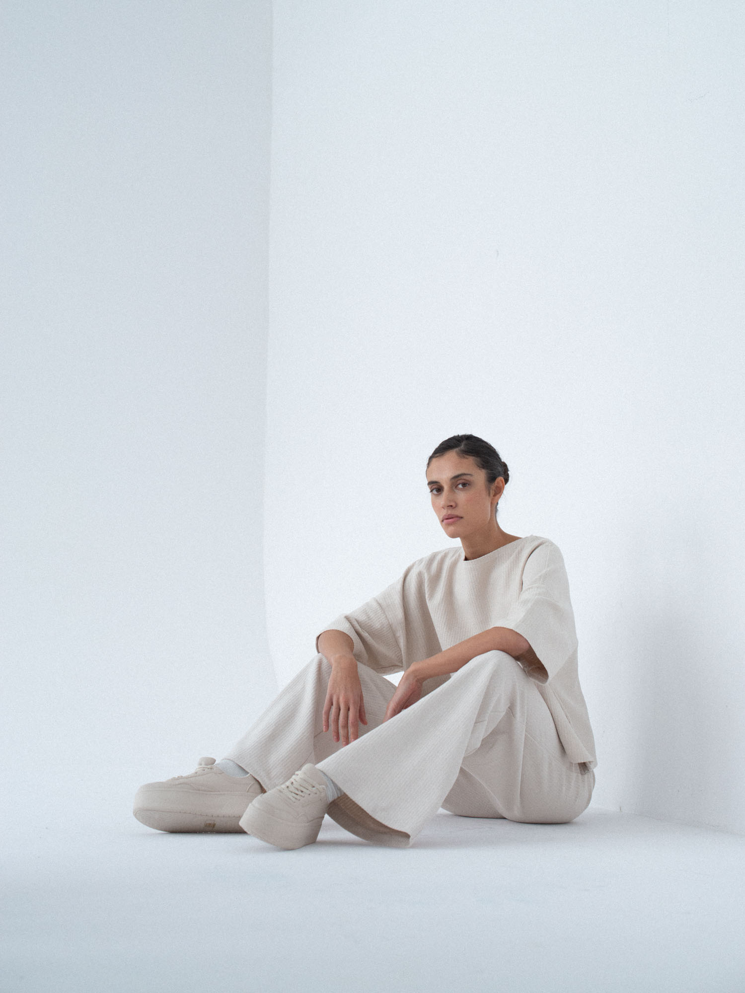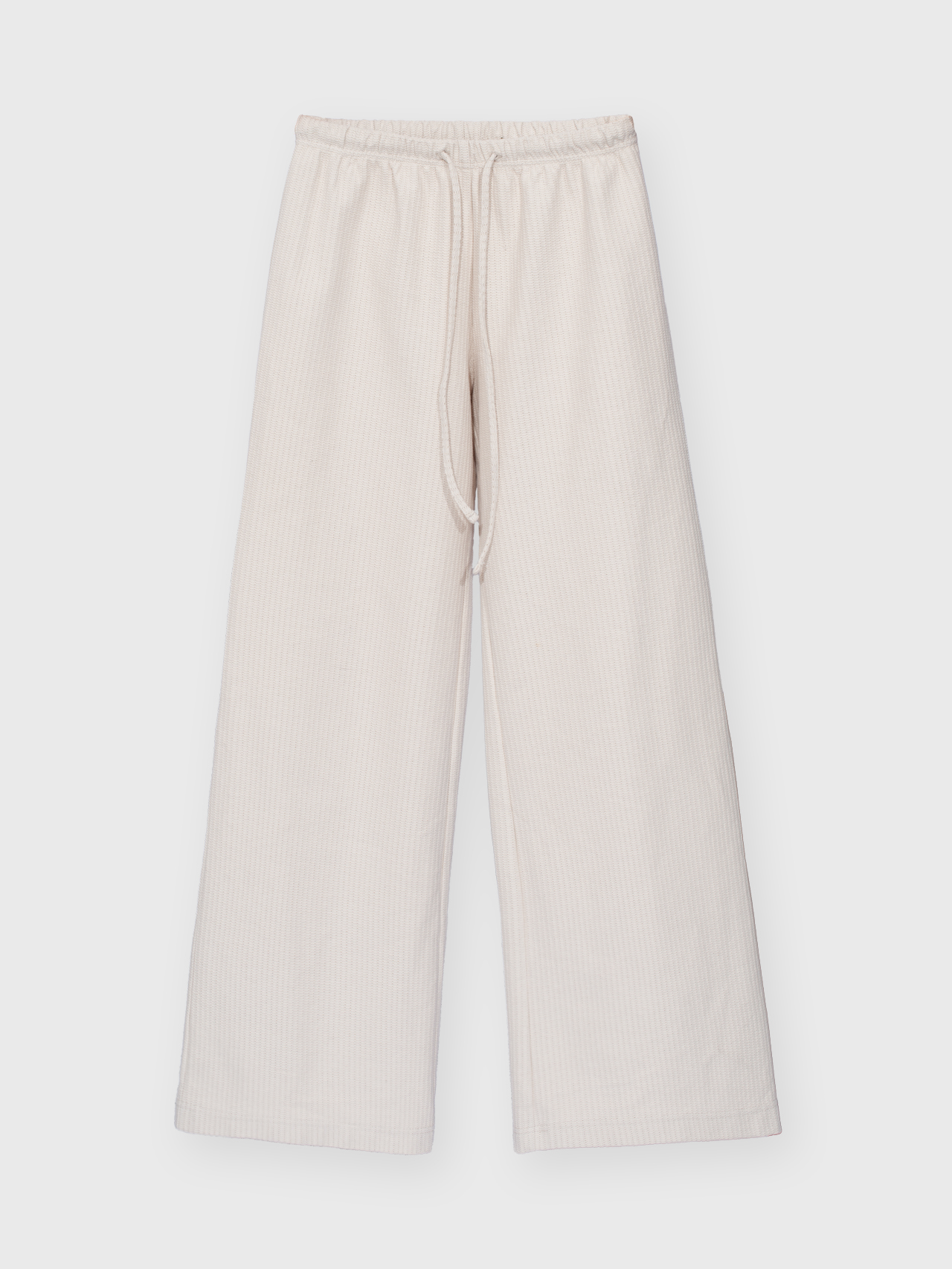 Minimalistyczne spodnie o kroju wide leg. Wykonane z dzianiny o wyraźnej, strukturalnej fakturze. Model posiada proste, szerokie nogawki oraz elastyczną talię z gumą i troczkiem, które zapewniają wygodne dopasowanie. Najlepiej prezentują się w zestawieniu z naszym longsleevem MOAI w tym samym odcieniu.