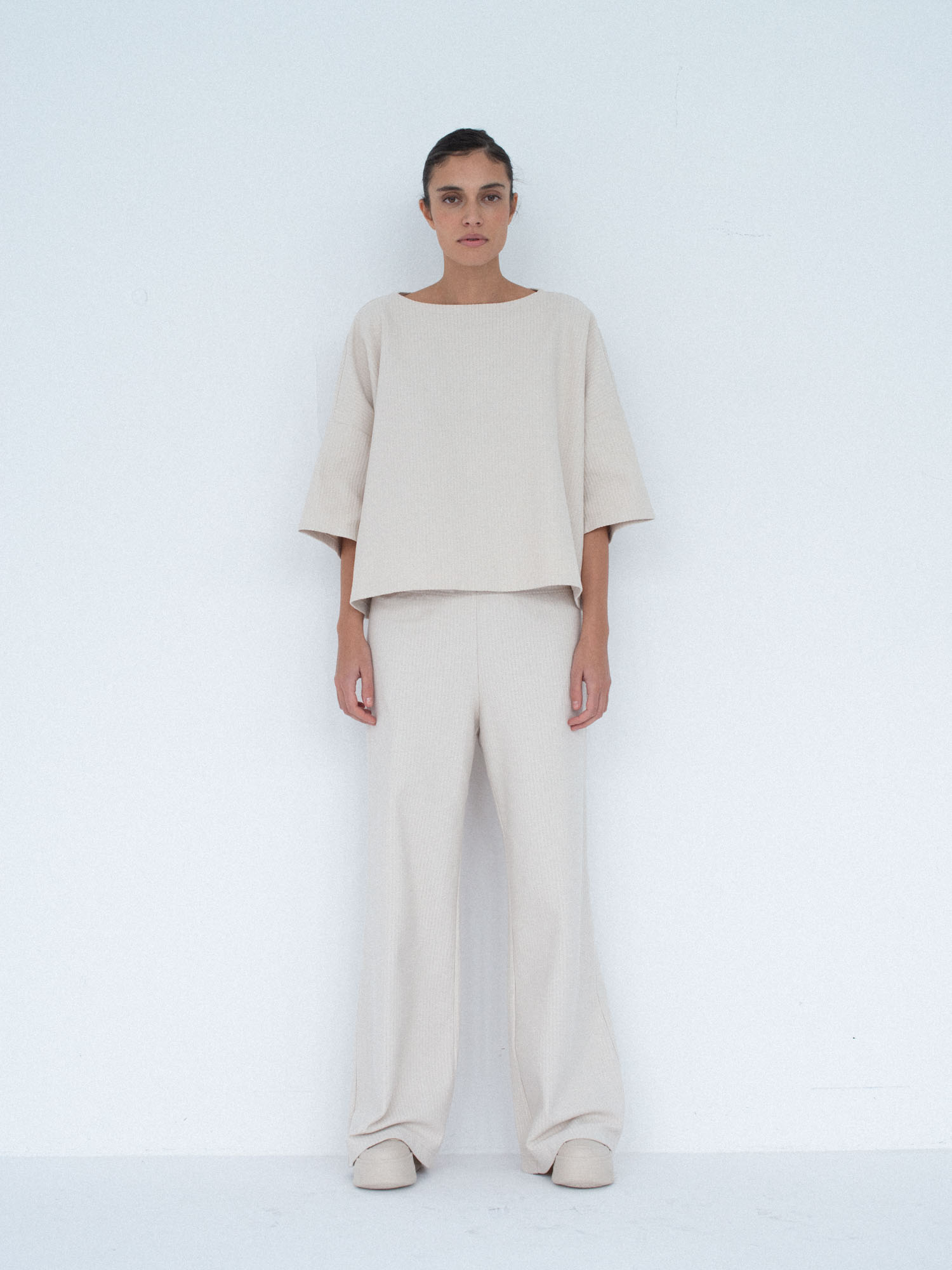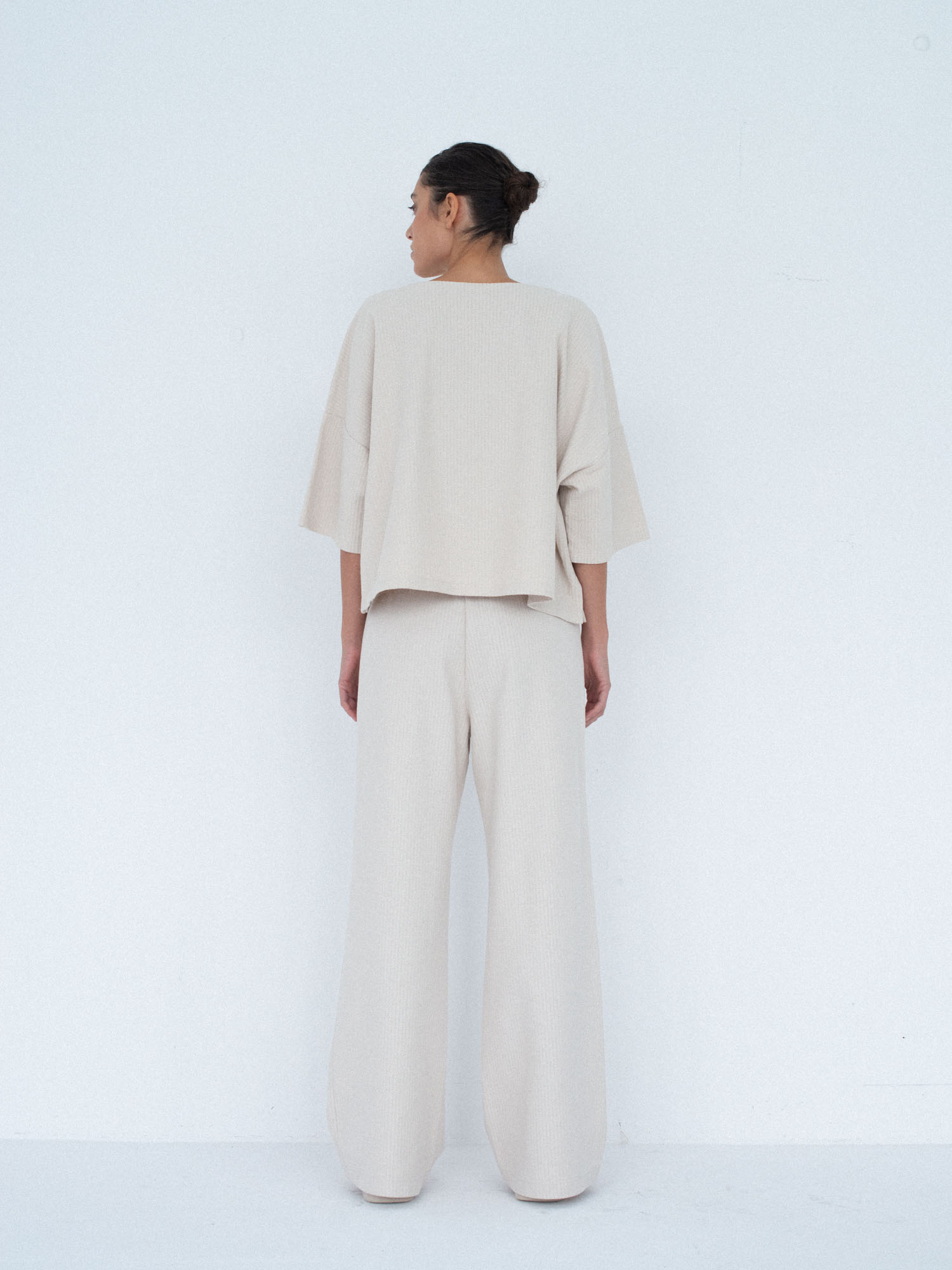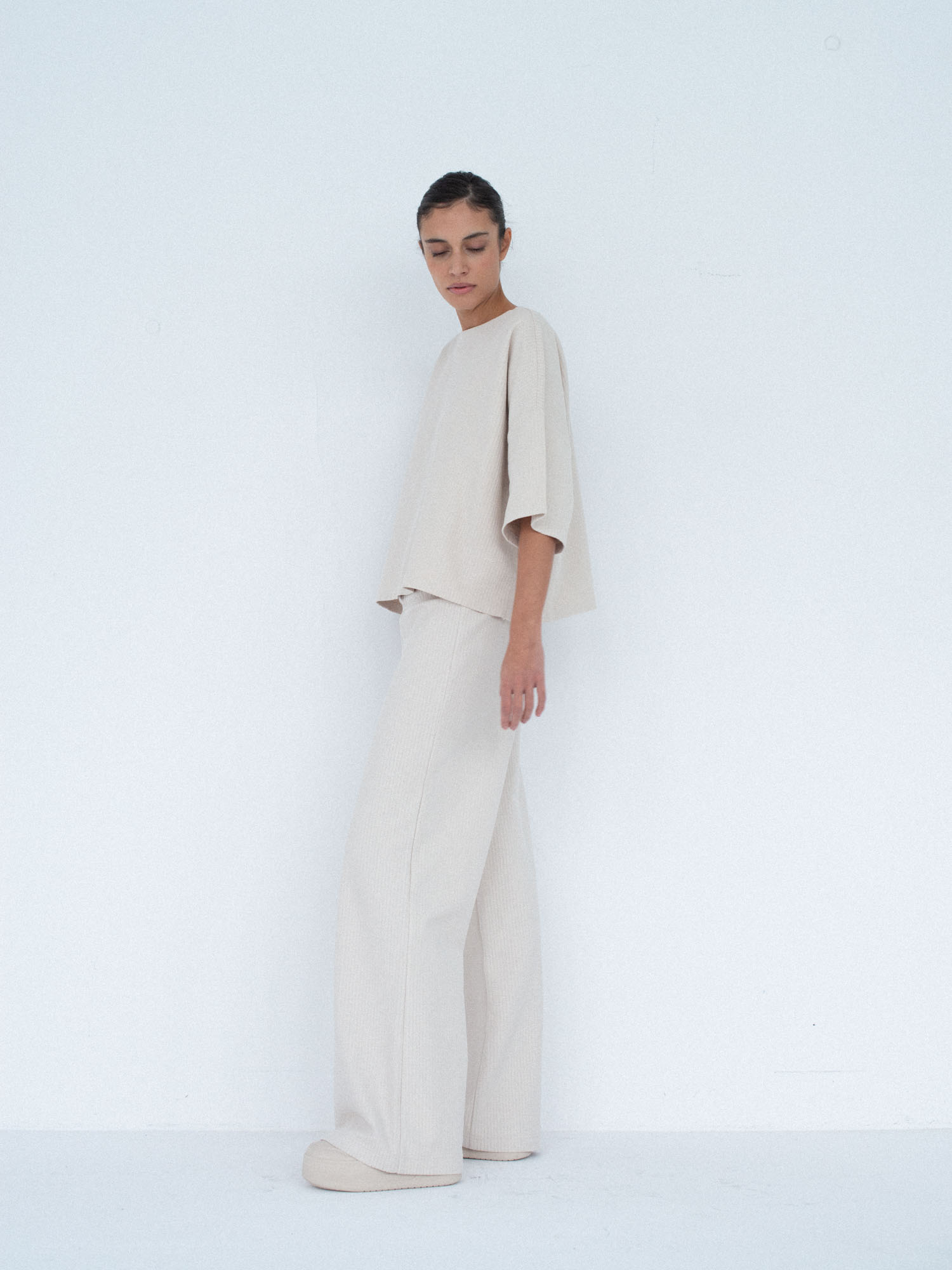 Minimalistyczne spodnie o kroju wide leg. Wykonane z dzianiny o wyraźnej, strukturalnej fakturze. Model posiada proste, szerokie nogawki oraz elastyczną talię z gumą i troczkiem, które zapewniają wygodne dopasowanie. Najlepiej prezentują się w zestawieniu z naszym longsleevem MOAI w tym samym odcieniu.