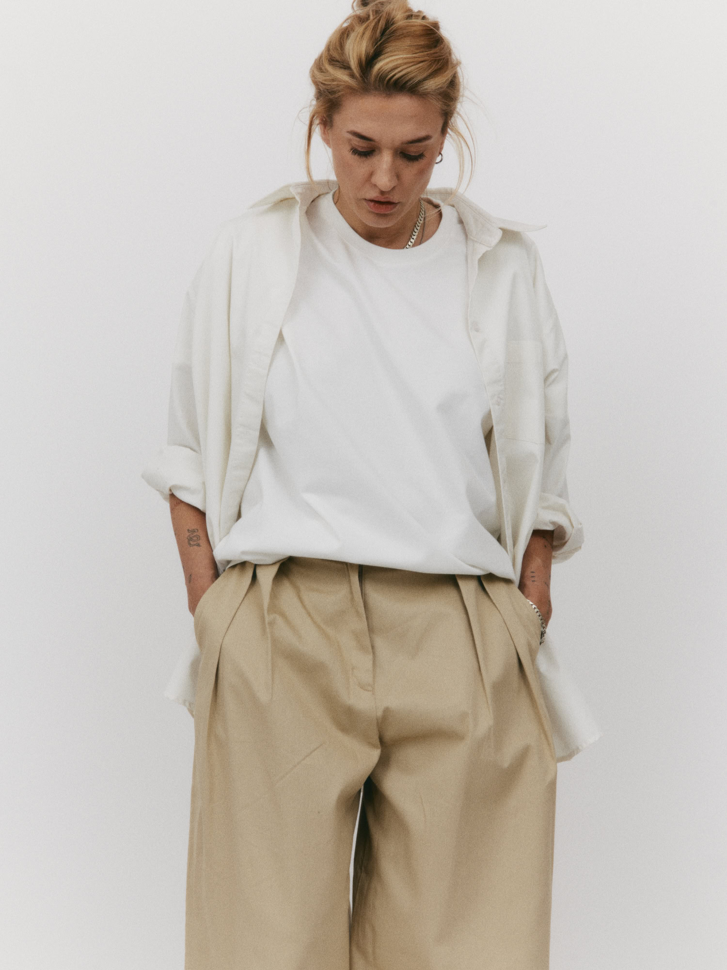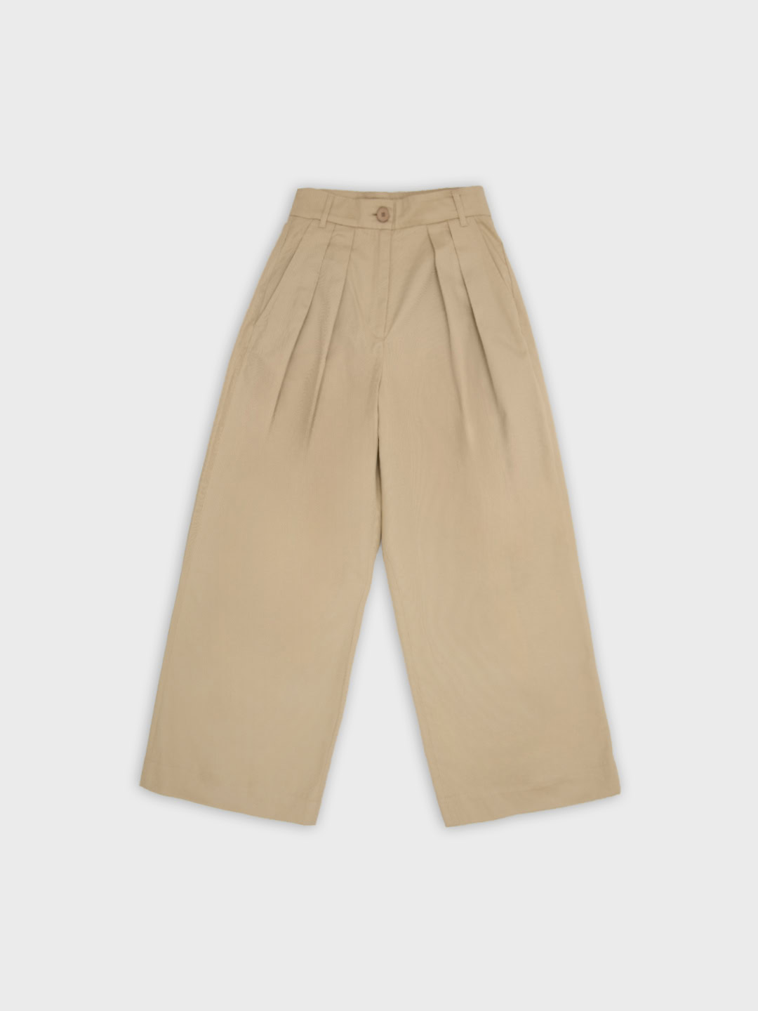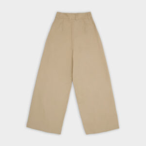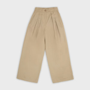 Bawełniane spodnie o prostym, luźnym kroju i długości do kostek. Wysoki stan idealnie podkreśla talię. Nogawki rozszerzają się ku dołowi. Zaszewki dopełniają całości tworząc efekt lekkiego plisowania. Model posiada dwie funkcjonalne kieszenie po bokach. Zapinane na zamek.