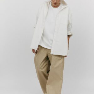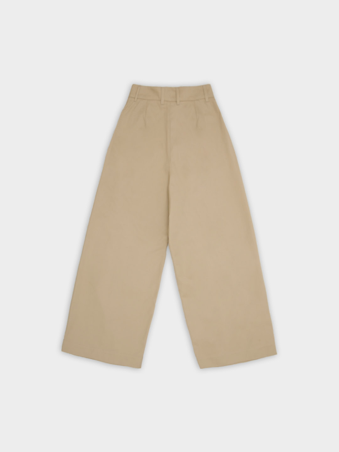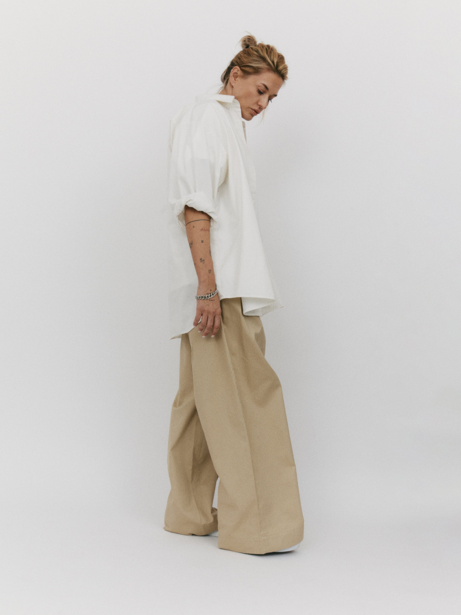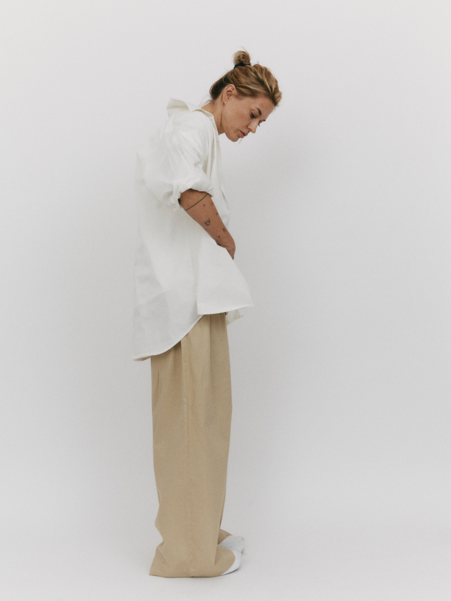Bawełniane spodnie o prostym, luźnym kroju i długości do kostek. Wysoki stan idealnie podkreśla talię. Nogawki rozszerzają się ku dołowi. Zaszewki dopełniają całości tworząc efekt lekkiego plisowania. Model posiada dwie funkcjonalne kieszenie po bokach. Zapinane na zamek.