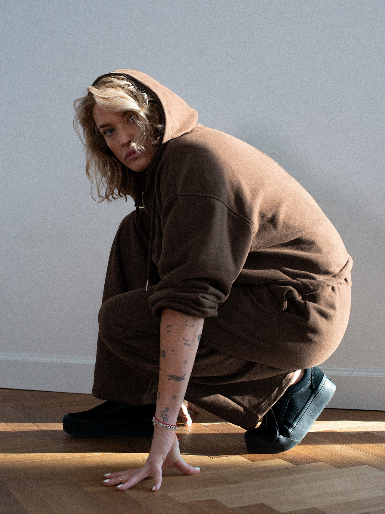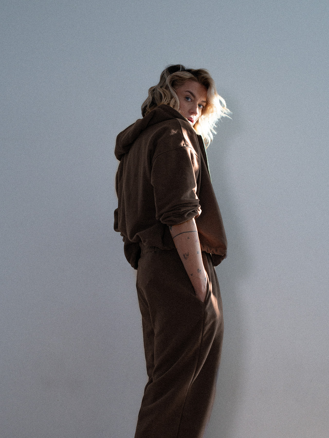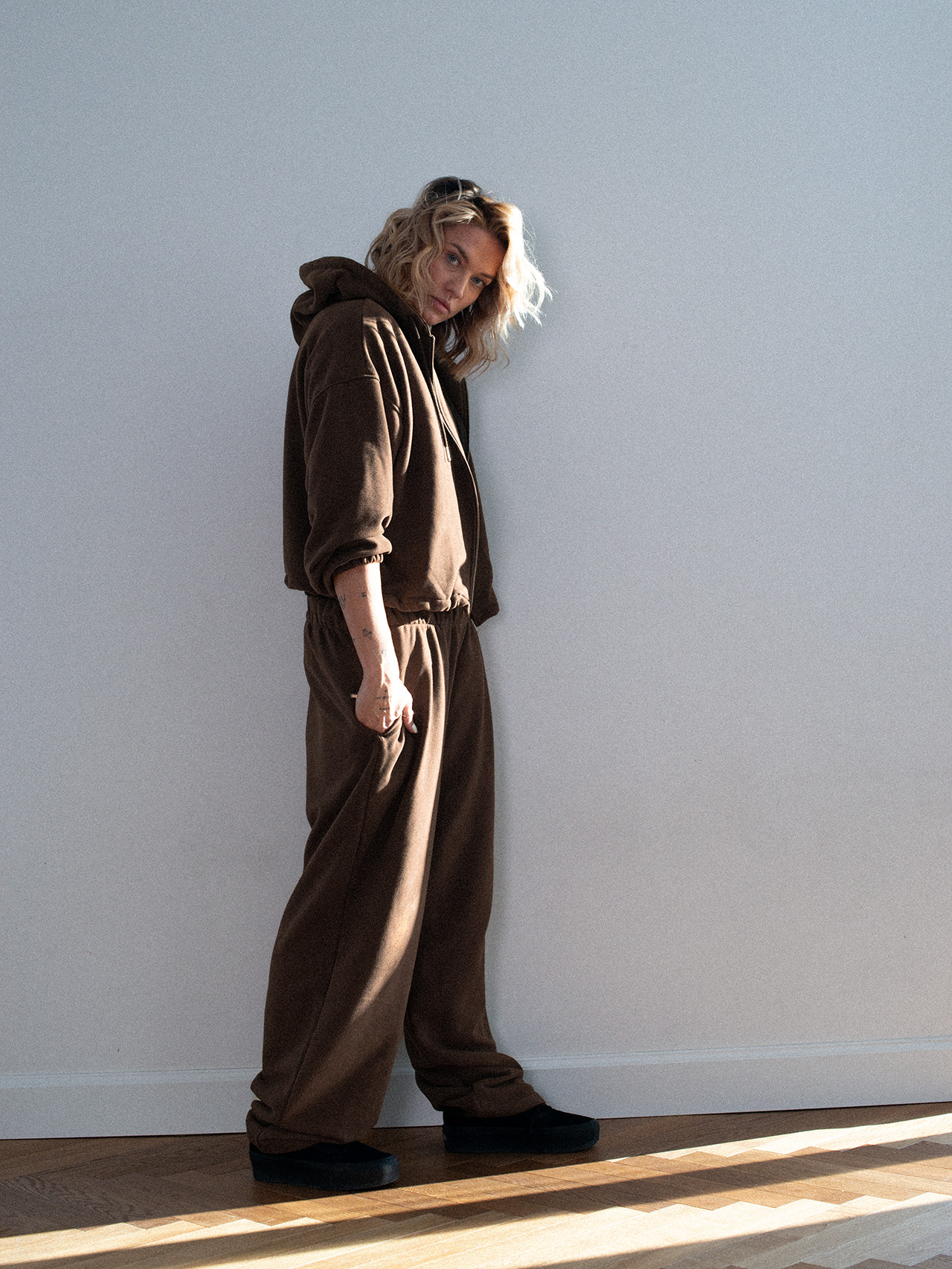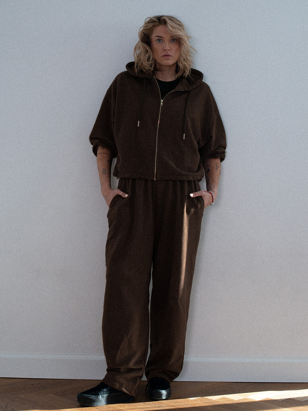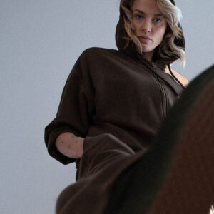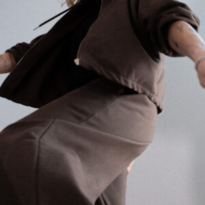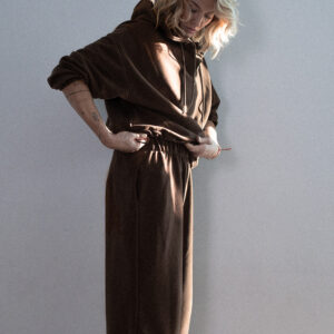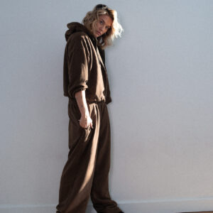 Spodnie dresowe o luźniejszym kroju z wysokim stanem i zaczepnie przydługimi nogawkami. Charakterystyczna dla tego modelu jest szeroka guma w pasie oraz proste nogawki swobodnie opadające na stopy. Model posiada funkcjonalne kieszenie po bokach. Razem z oversize’ową bluzą z kapturem LE PUMP stanowią zestaw doskonały.
