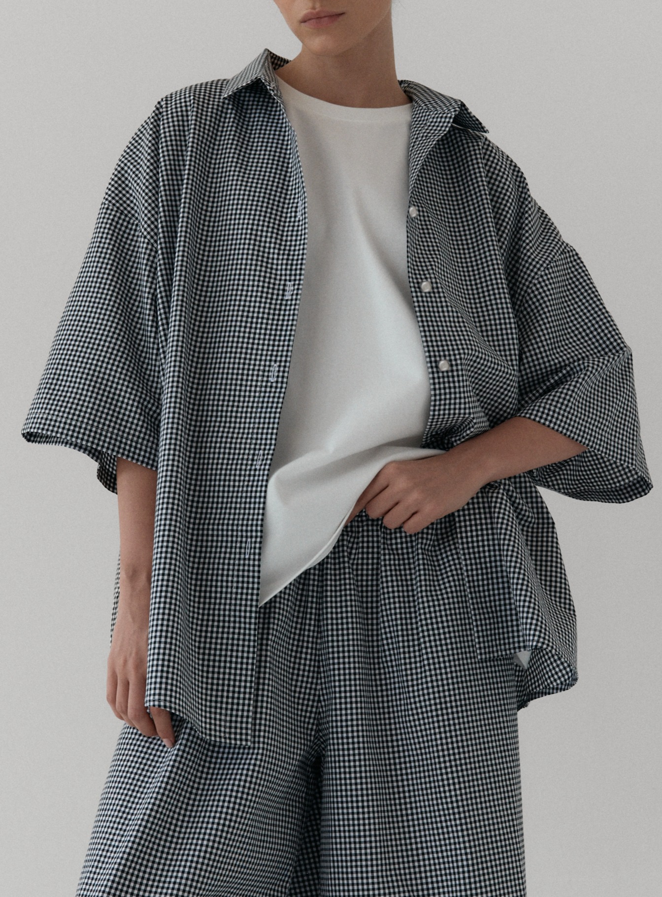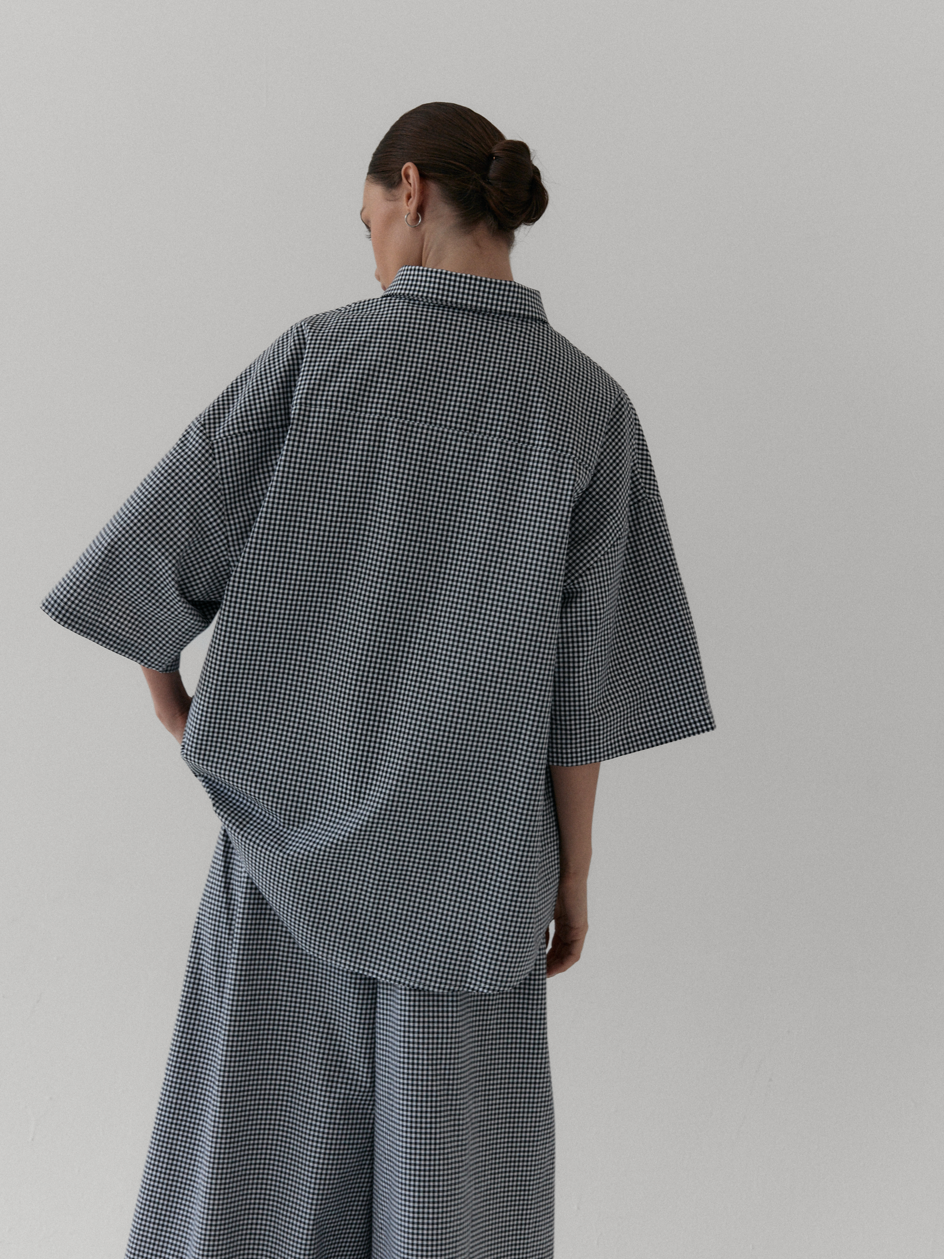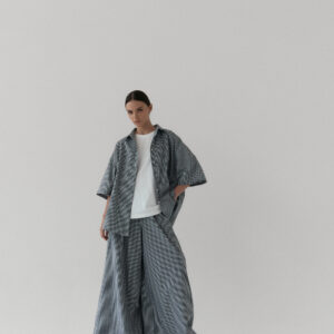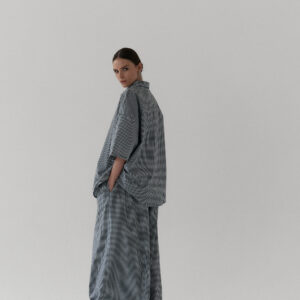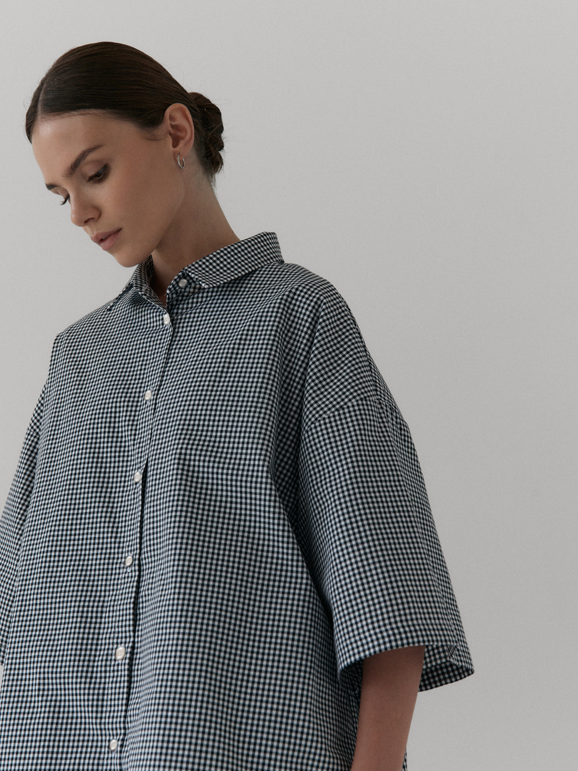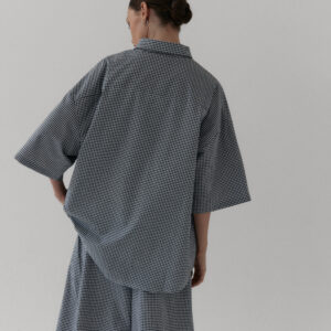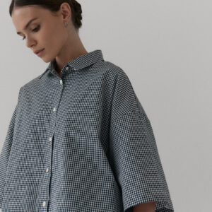 Koszula o luźnym, ultra oversize’owym, męskim kroju z krótkim rękawem. Klasyczna, nieco wydłużona forma, o pudełkowym kształcie. Prosty, duży kołnierzyk oraz szerokie rękawy dopełniają całości. Model zapinany na guziki. Solidna baza pod każdy look. Świetnie wygląda w zestawie z naszymi spodniami MAU.