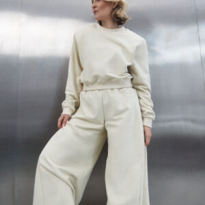 Lekko oversize’owa bluza LE PUMP w wyjątkowym kolorze buttermilk o skróconym kroju. Poduszki przy ramionach i wydłużone rękawy nadają jej swobodny, nowoczesny charakter. Wykonana z wysokogatunkowej, lekko lejącej bawełny z dodatkiem recyklingowanego poliestru. Dzianina została poddana procesowi szmerglowania od zewnętrznej strony, co nadaje jej przyjemny w dotyku meszek, który otula miękkością. W połączeniu ze spodniami dresowymi wide leg LE PUMP w tym samym odcieniu tworzy spójny, dopracowany zestaw.