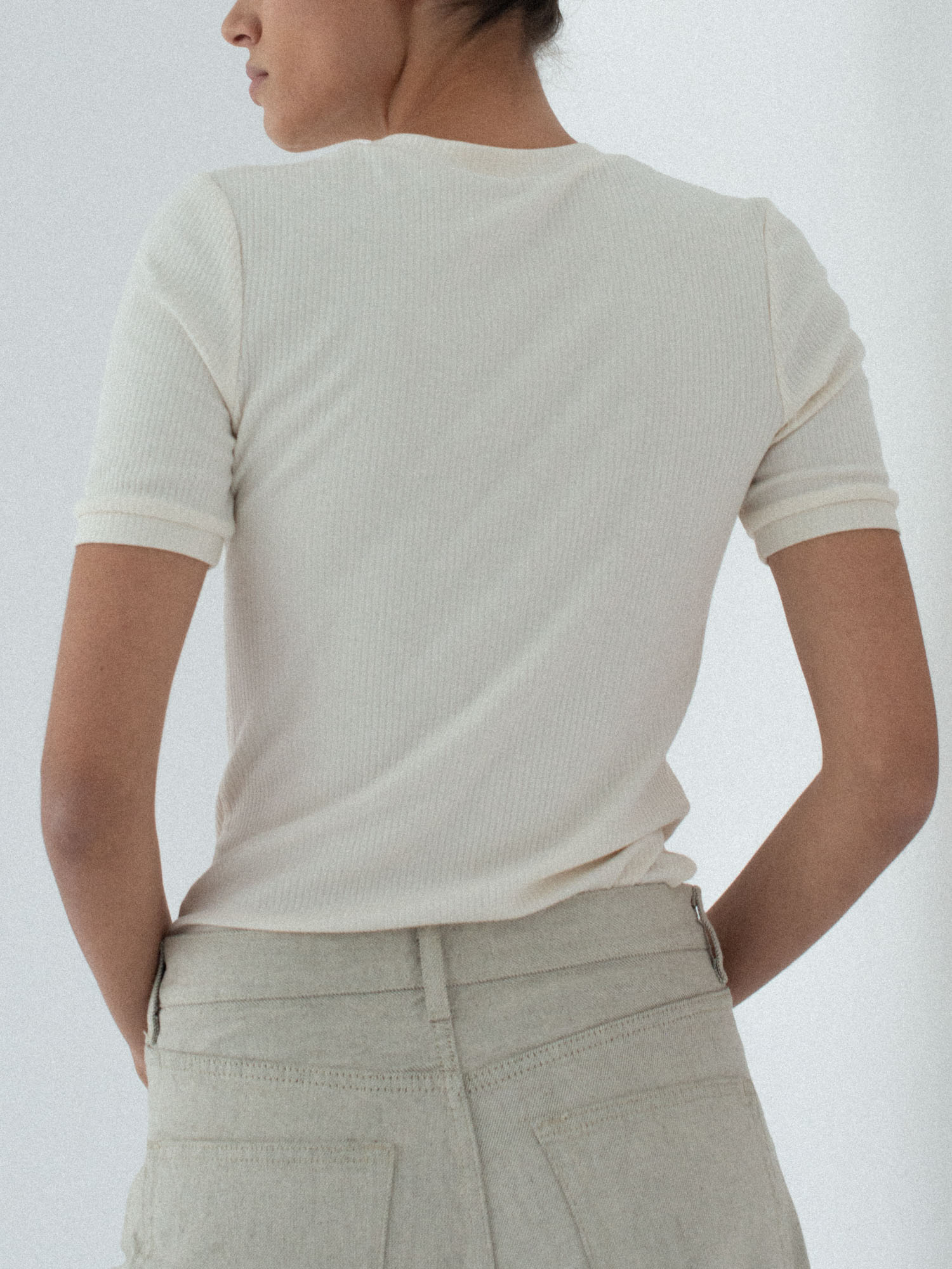 Bluzka z dopasowanym rękawem RIBE uszyta jest z mieszanki bawełny i modalu z niewielką domieszką elastanu. Materiał jest niezwykle przyjemny dla ciała i lejący, z delikatną strukturą prążka. Miękka i elastyczna dzianina sprawia, że bluzka naturalnie układa się na sylwetce, nie krępuje ruchów i zapewnia maksymalny komfort noszenia.