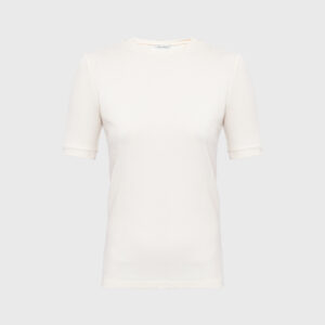 Bluzka z dopasowanym, krótkim rękawem. Idealny basic o klasycznym kroju z lekko zabudowanym dekoltem. Bluzka doskonale sprawdzi się zarówno do eleganckich spodni, jak i jeansów. Może być też noszona jako warstwa pod sweter, koszulę czy marynarkę.