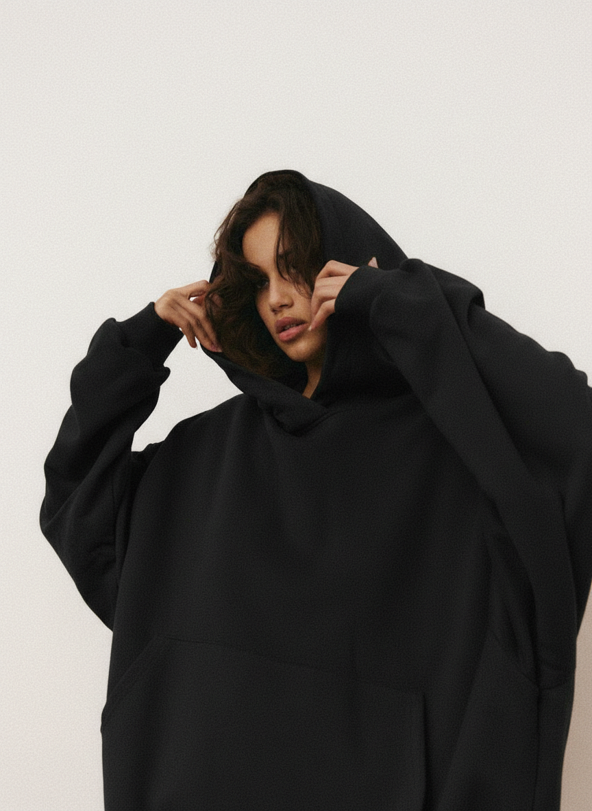 Oversize’owa bluza z kapturem o dłuższym kroju. Zaczepnie przydługie rękawy i obniżona linia ramion dopełniają całości. Długość bluzy jest odpowiednia do jeansów, leginsów i spodni dresowych z wysokim stanem. Kieszeń kangurka jest funkcjonalnym i wygodnym urozmaiceniem, a także dodaje jej przytulnego charakteru. Razem ze spodniami dresowymi z wysokim stanem LE PUMP stanowią zestaw doskonały.