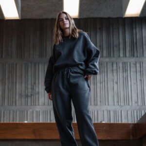 Dół bluzy, rękawy i dekolt wykończone są ściągaczem typu ribb w kolorze materiału. Długość bluzy jest odpowiednia do jeansów i spodni dresowych z wysokim stanem SMOOTH COTTON. Model wykończony jest beżową wszywką z eko skóry na karku.