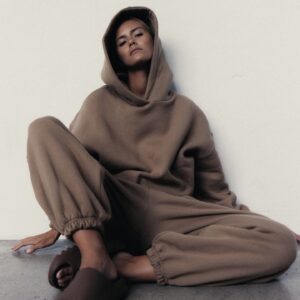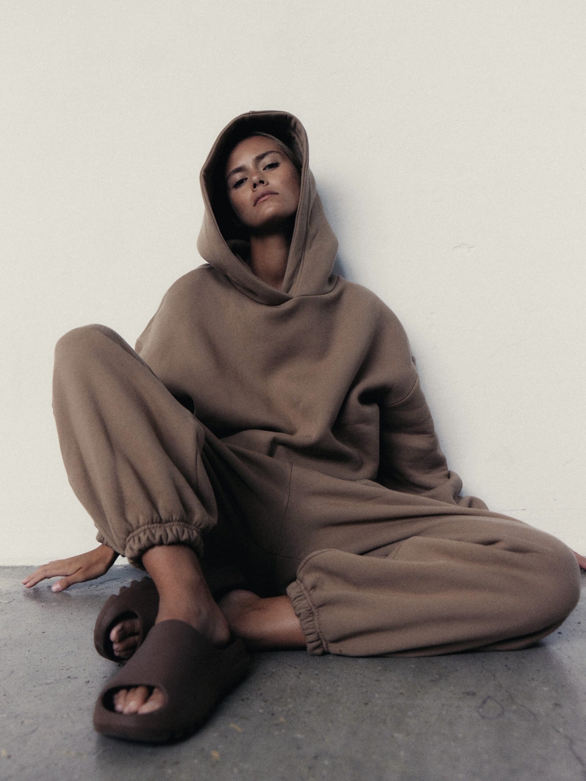 Oversize’owa bluza z kapturem typu crop top. Zaczepnie przydługie rękawy, obniżona linia ramion i skrócony fason dopełniają całości. Długość bluzy jest odpowiednia do jeansów, leginsów i spodni dresowych z wysokim stanem. Razem ze spodniami dresowymi z wysokim stanem SMOOTH COTTON peanut butter stanowią zestaw doskonały.
