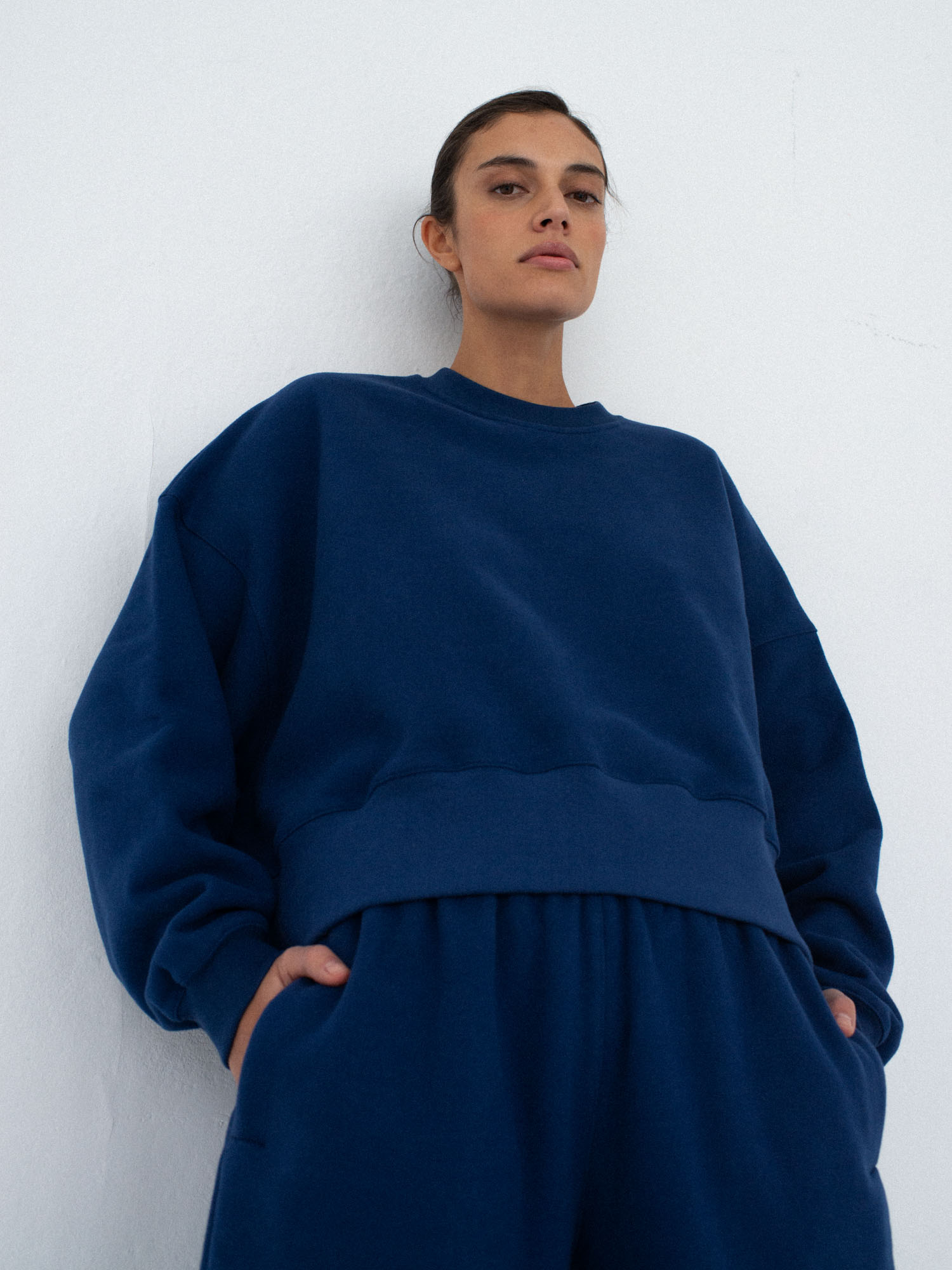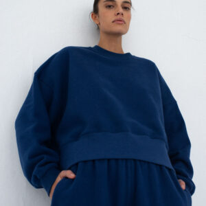 Bluza typu oversize z obniżoną linią ramion i delikatnie skróconym fasonem, który kończy się tuż nad linią bioder. Długość bluzy jest odpowiednia do jeansów i spodni dresowych z wysokim stanem. Razem ze spodniami dresowymi SMOOTH COTTON Oosford navy stanowią zestaw doskonały.