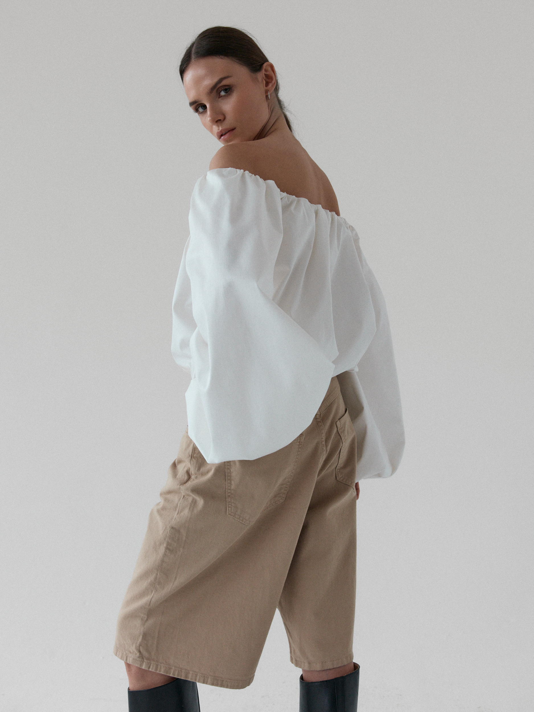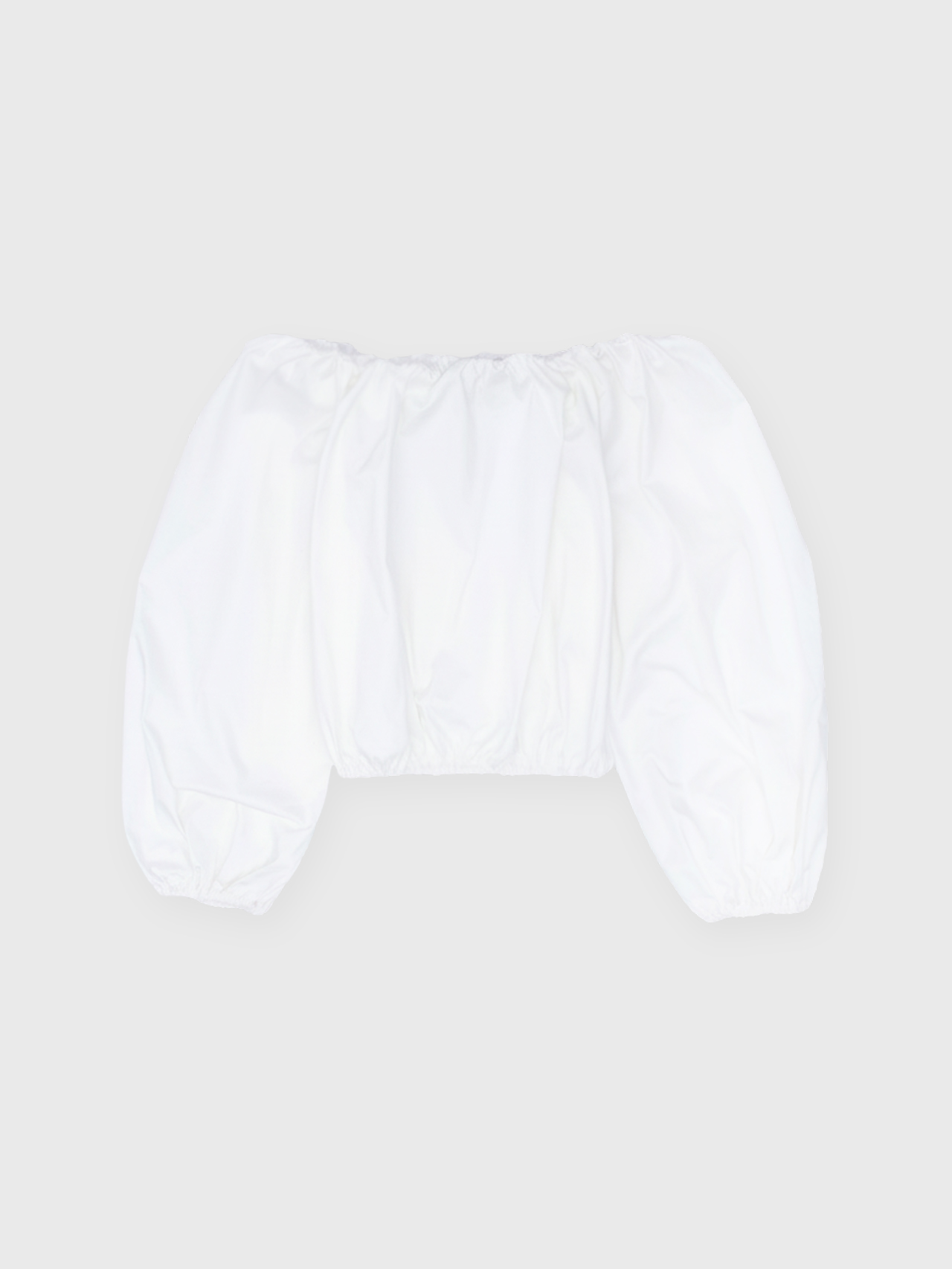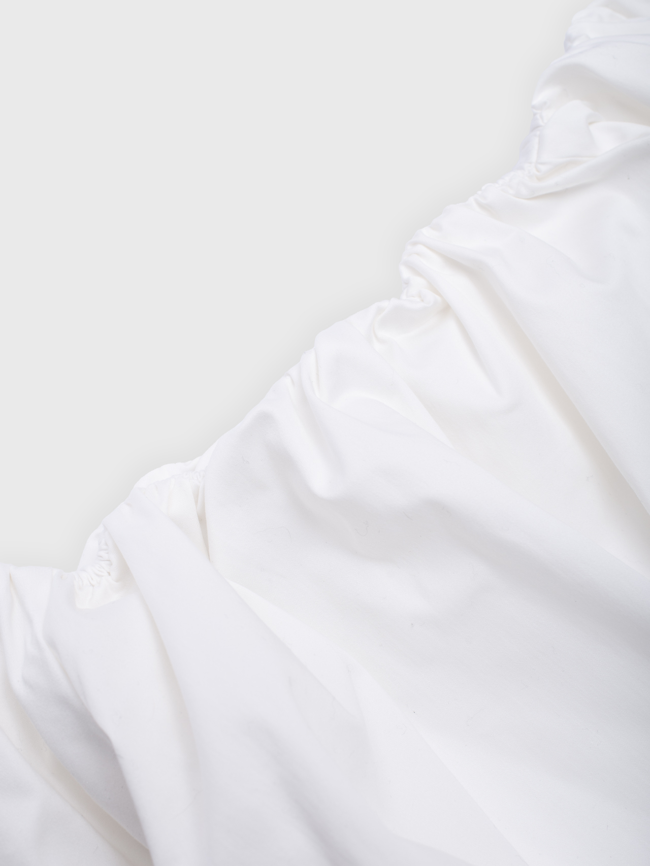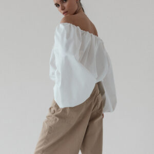 Minimalistyczna koszula typu off-shoulder. Model wyróżnia się dekoltem odkrywającym ramiona oraz efektownymi, balonowymi rękawami zakończonymi gumką. Luźny fason z elastycznym wykończeniem góry oraz w talii zapewnia komfort i swobodę ruchów, jednocześnie świetnie układając się na sylwetce. Doskonale komponuje się zarówno z jeansami na co dzień, jak i bardziej eleganckimi elementami garderoby.