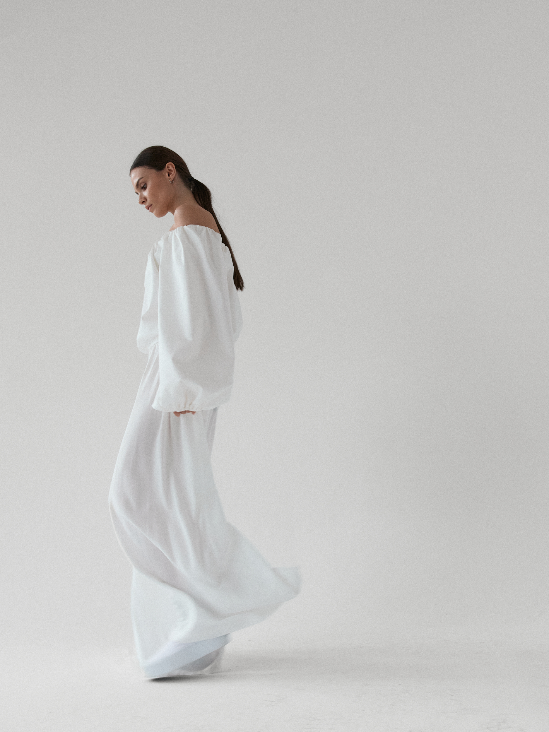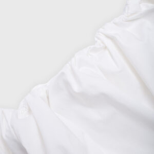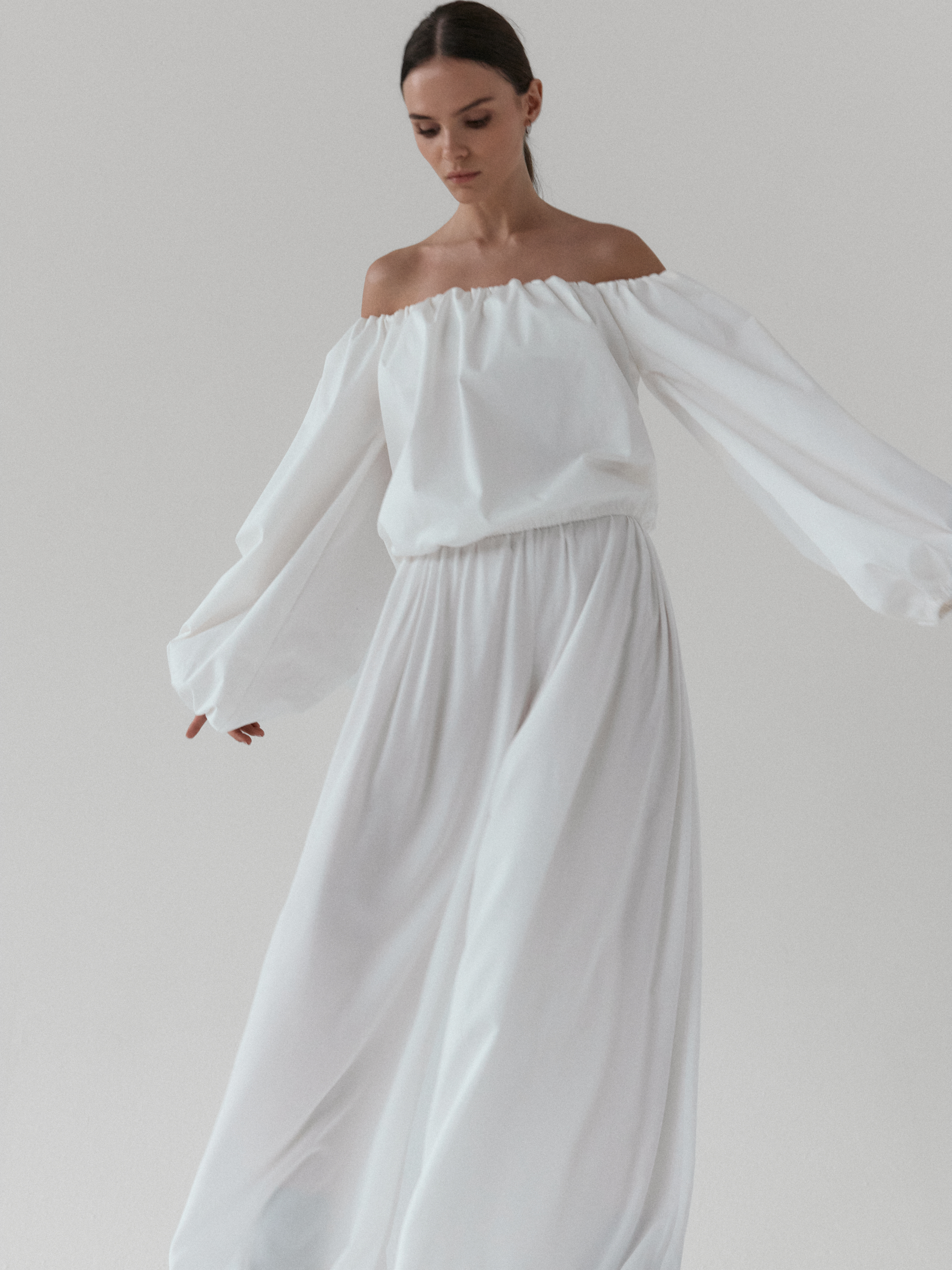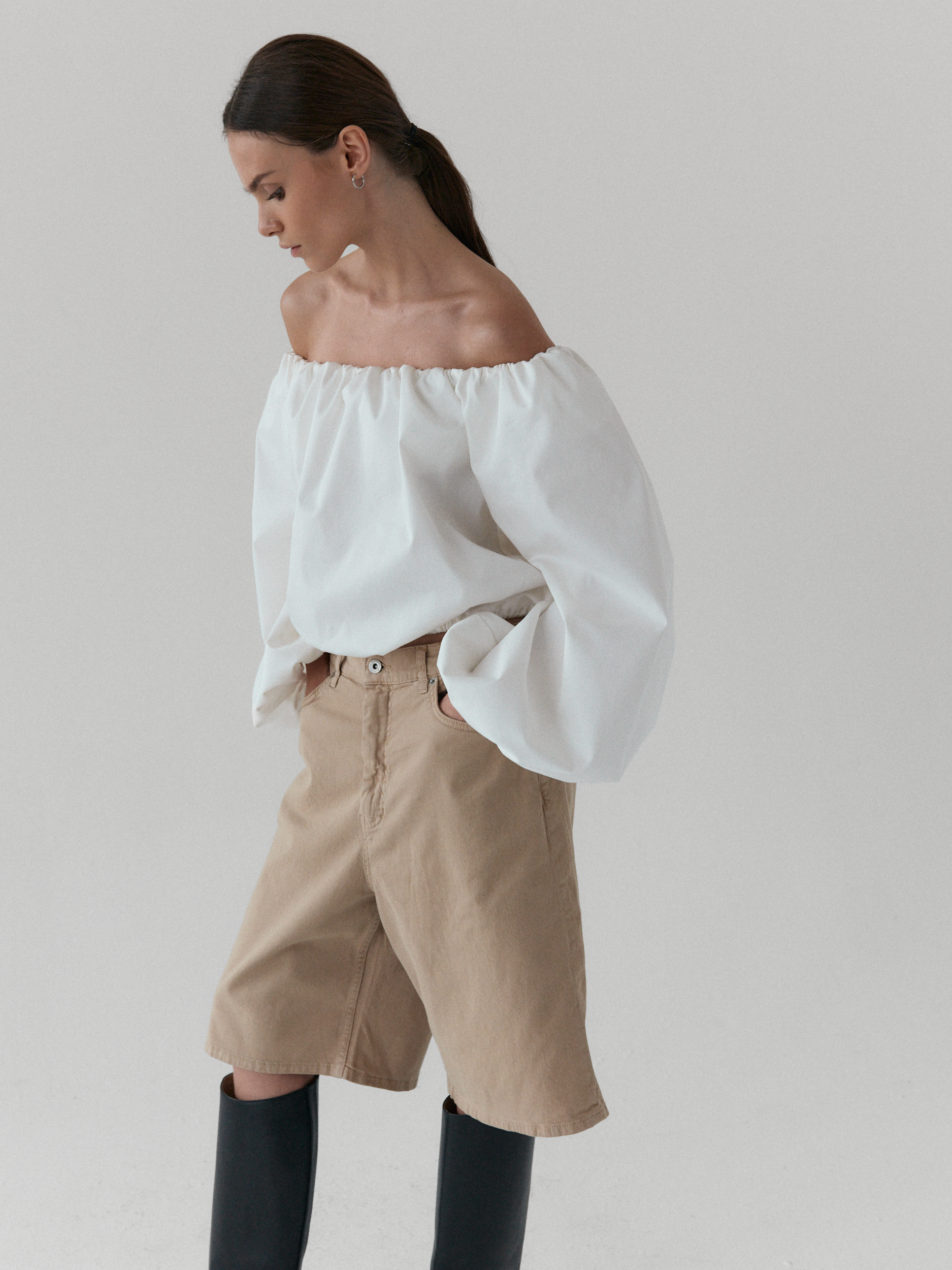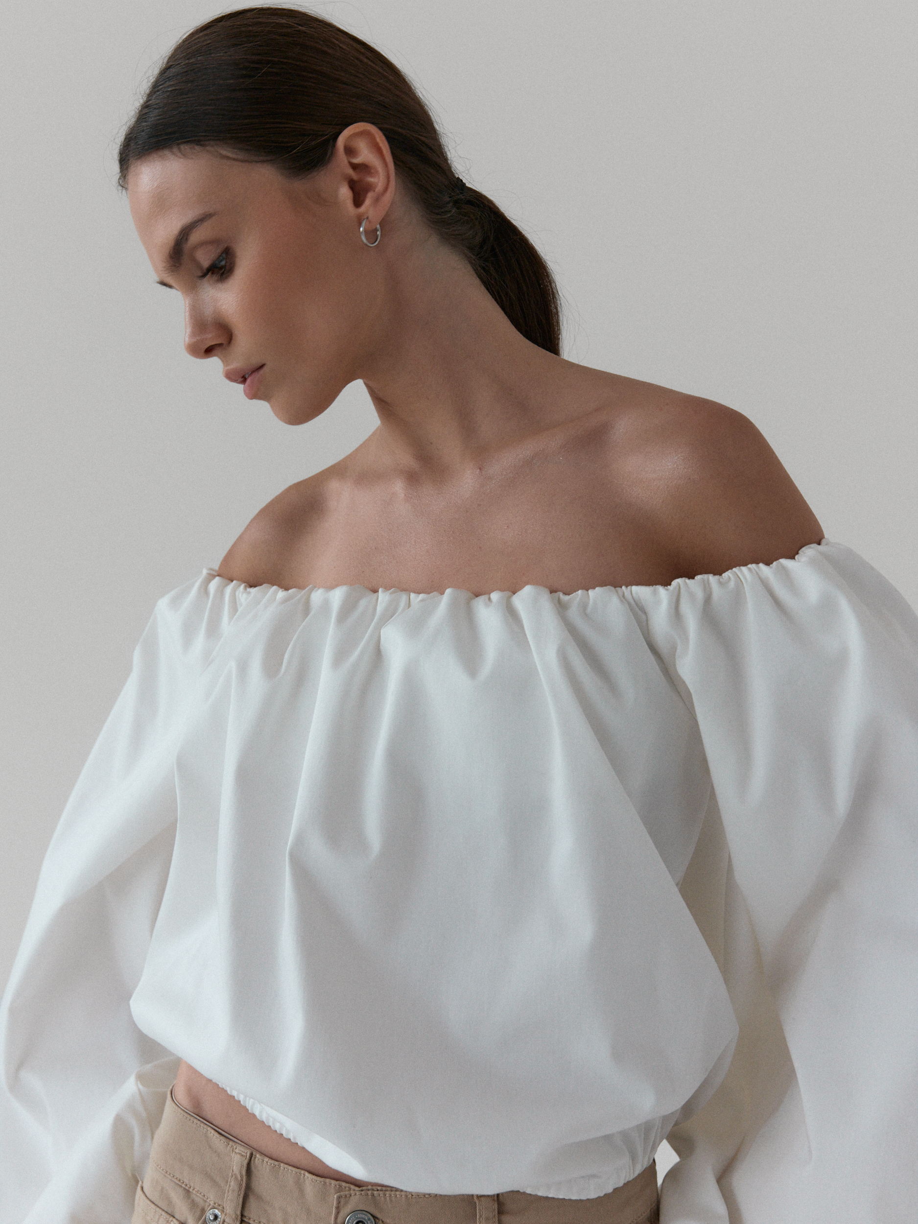 Minimalistyczna koszula typu off-shoulder. Model wyróżnia się dekoltem odkrywającym ramiona oraz efektownymi, balonowymi rękawami zakończonymi gumką. Luźny fason z elastycznym wykończeniem góry oraz w talii zapewnia komfort i swobodę ruchów, jednocześnie świetnie układając się na sylwetce. Doskonale komponuje się zarówno z jeansami na co dzień, jak i bardziej eleganckimi elementami garderoby.