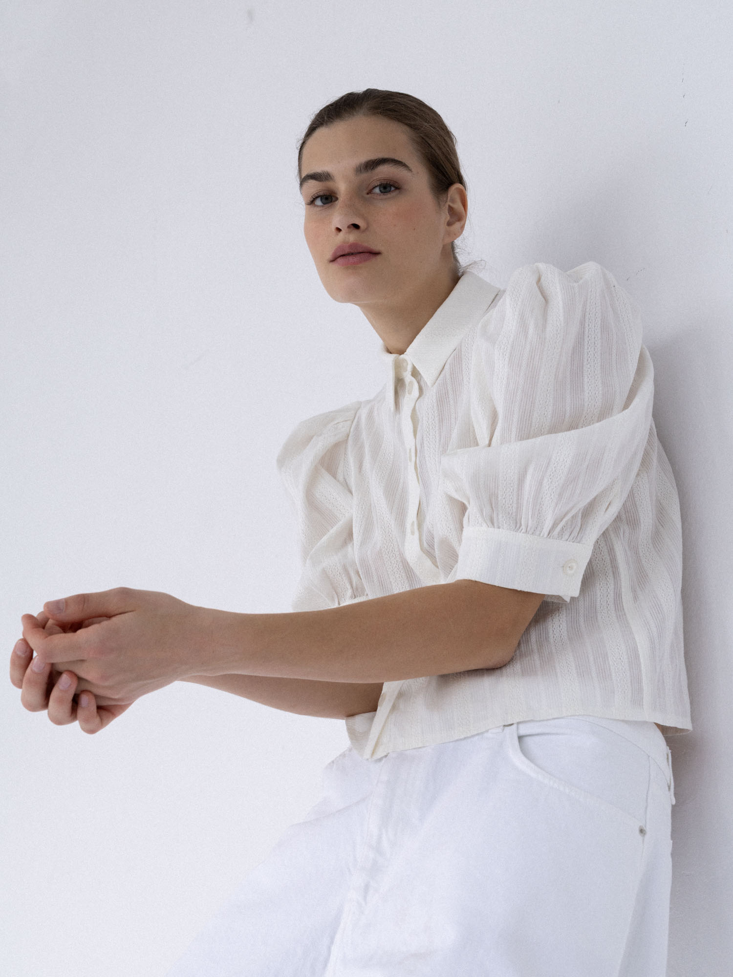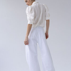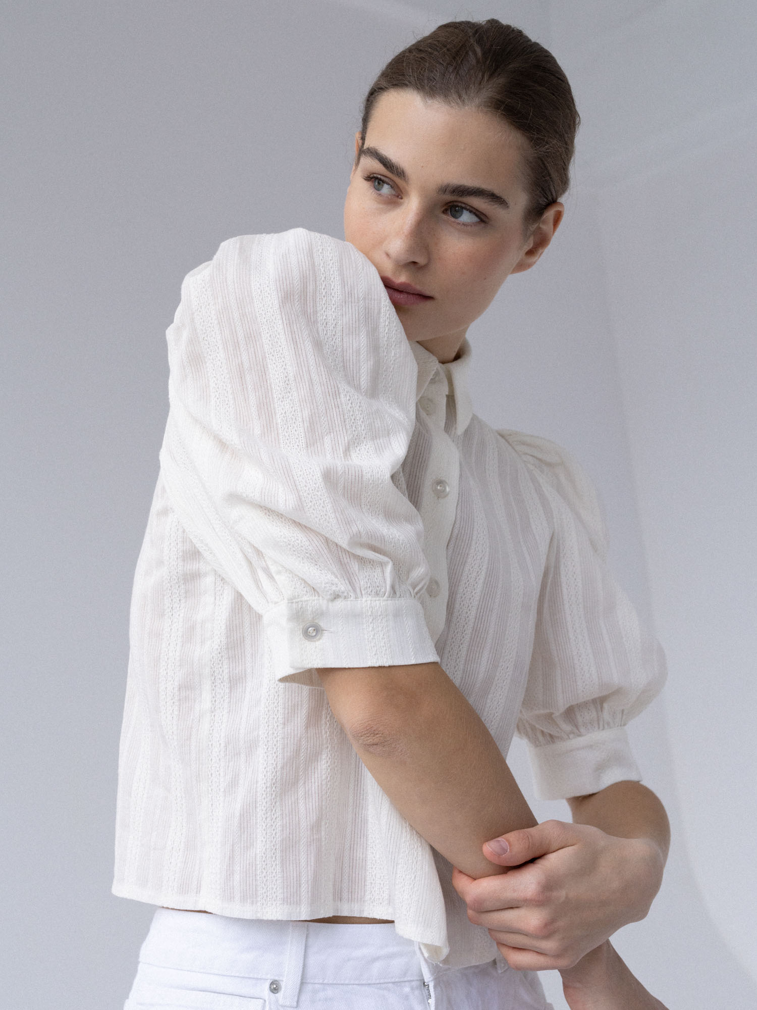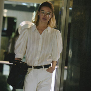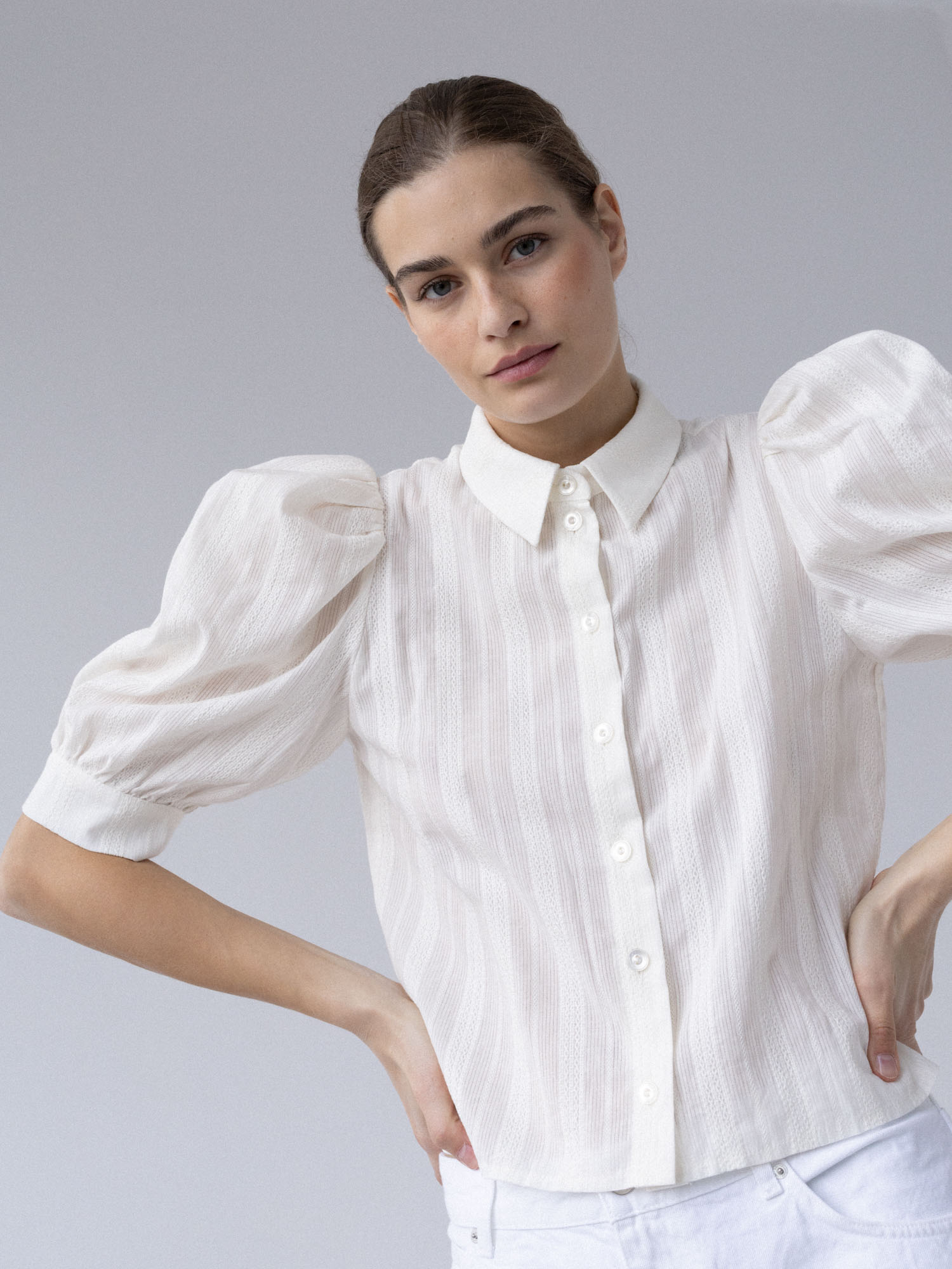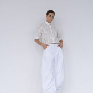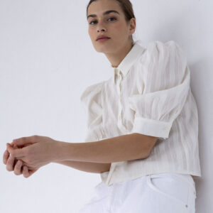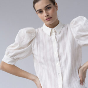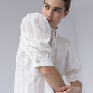 Koszula o lekko pudełkowym, skróconym kroju w nowoczesnej formie. Krótkie, bufiaste rękawy zakończone szerokimi mankietami nadają jej subtelną objętość. Klasyczny kołnierzyk oraz drobne, starannie dobrane guziki podkreślają minimalistyczny, dopracowany charakter. Tkanina jest lekka i wyjątkowo przyjemna w dotyku – wyróżnia się delikatną fakturą oraz subtelnymi, półtransparentnymi paseczkami, które nadają jej lekkości.