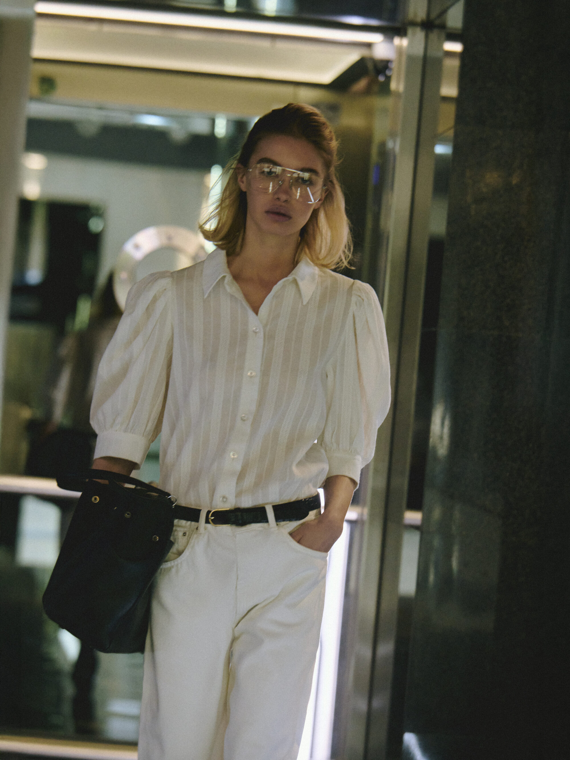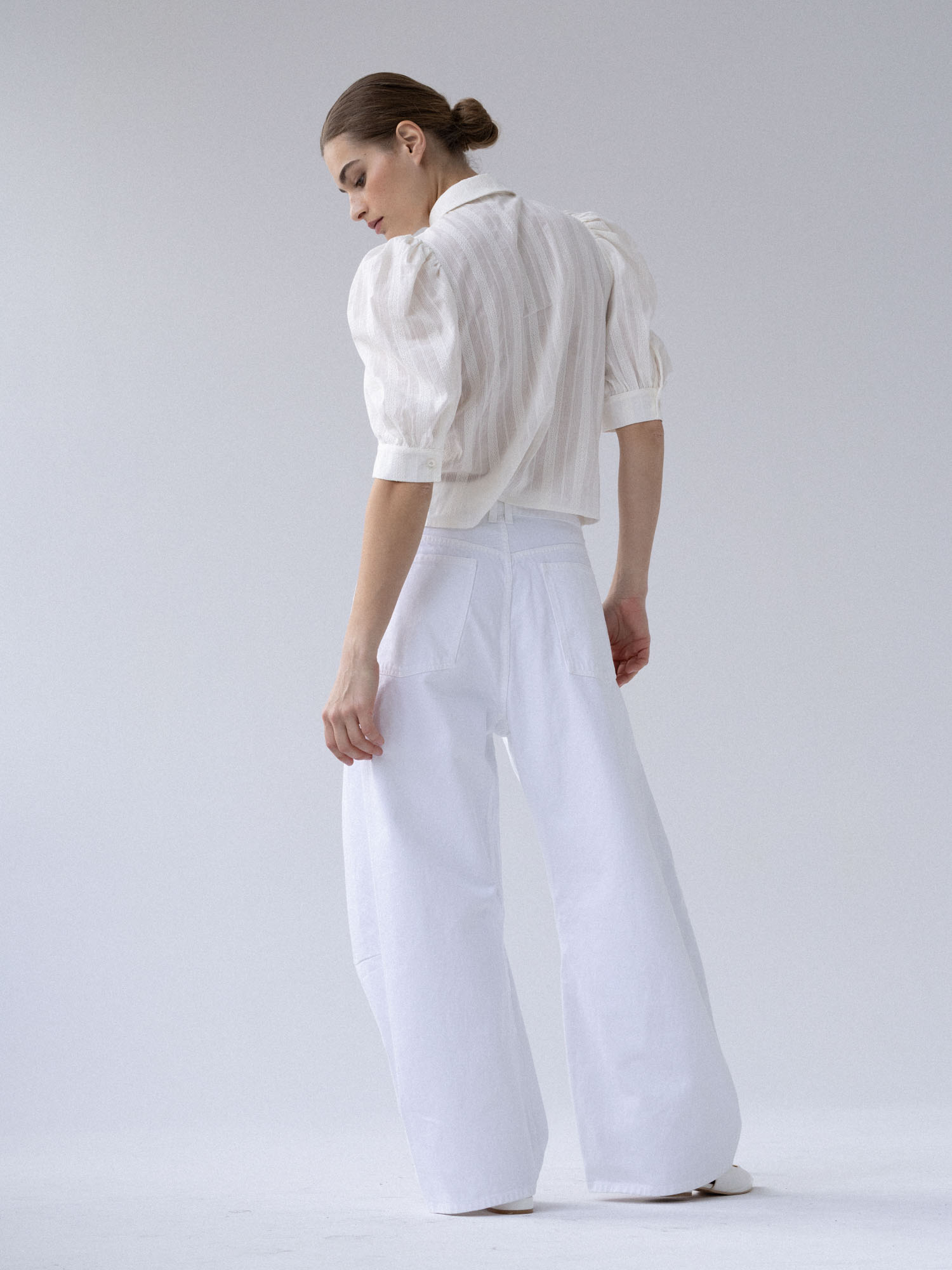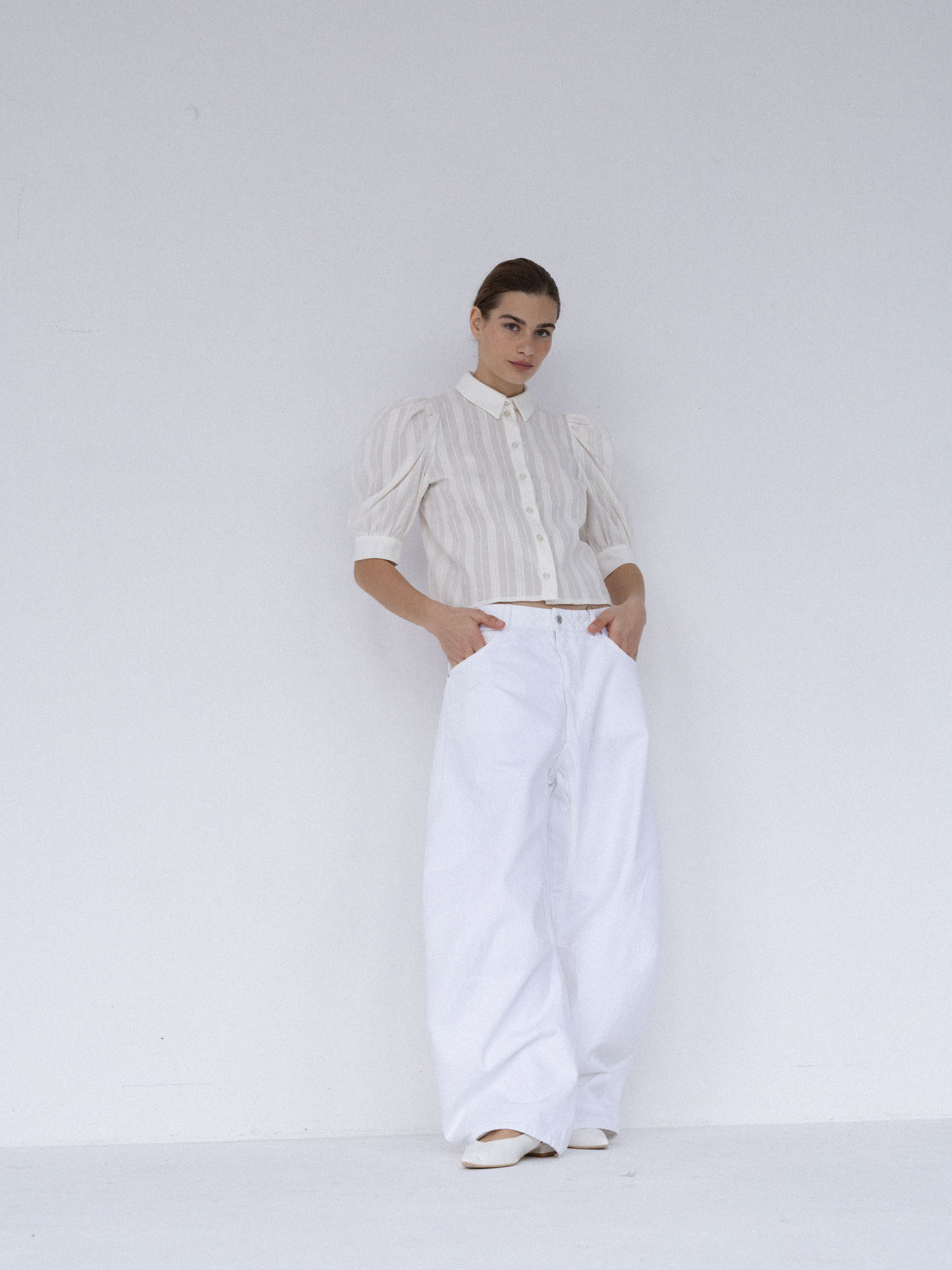 Koszula o lekko pudełkowym, skróconym kroju w nowoczesnej formie. Krótkie, bufiaste rękawy zakończone szerokimi mankietami nadają jej subtelną objętość. Klasyczny kołnierzyk oraz drobne, starannie dobrane guziki podkreślają minimalistyczny, dopracowany charakter. Tkanina jest lekka i wyjątkowo przyjemna w dotyku – wyróżnia się delikatną fakturą oraz subtelnymi, półtransparentnymi paseczkami, które nadają jej lekkości.