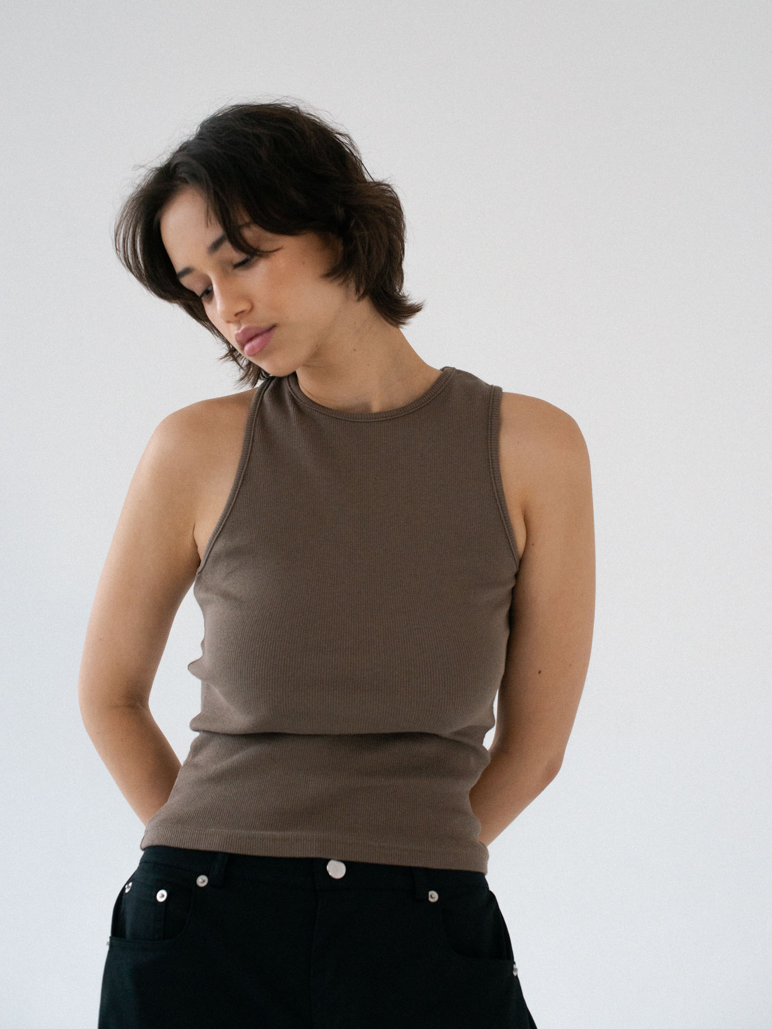 Tanktop uszyty z bawełnianego dżerseju w prążki z asymetrycznym wycięciem na plecach. Prosty krój idealnie dopasowuje się do sylwetki. Świetnie sprawdzi się z każdym rodzajem dołu.