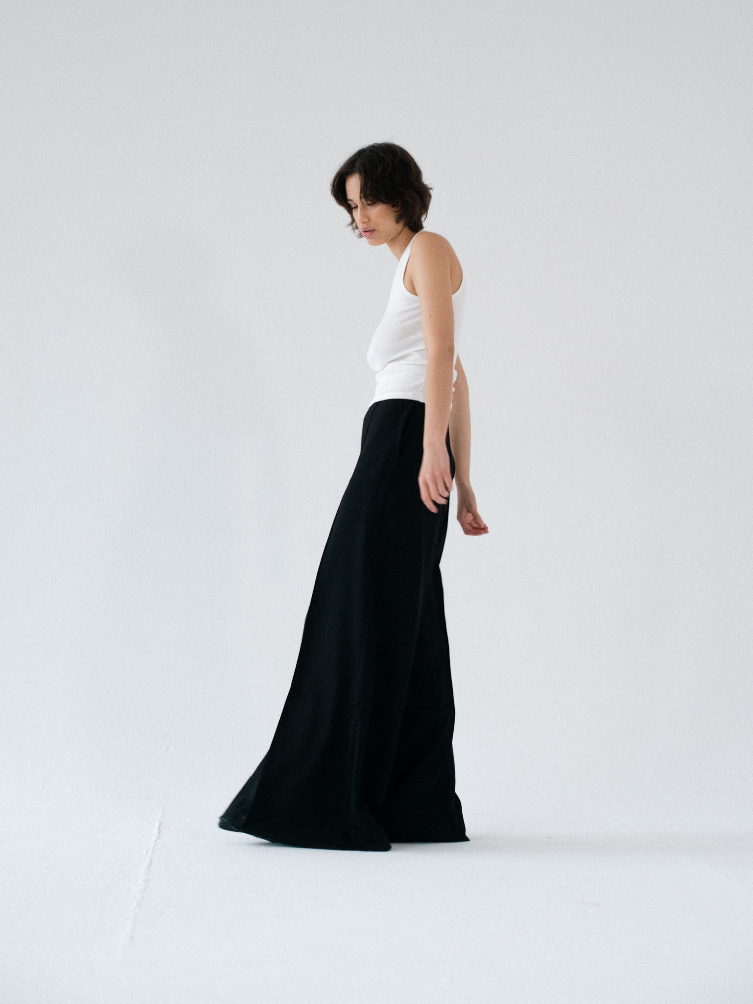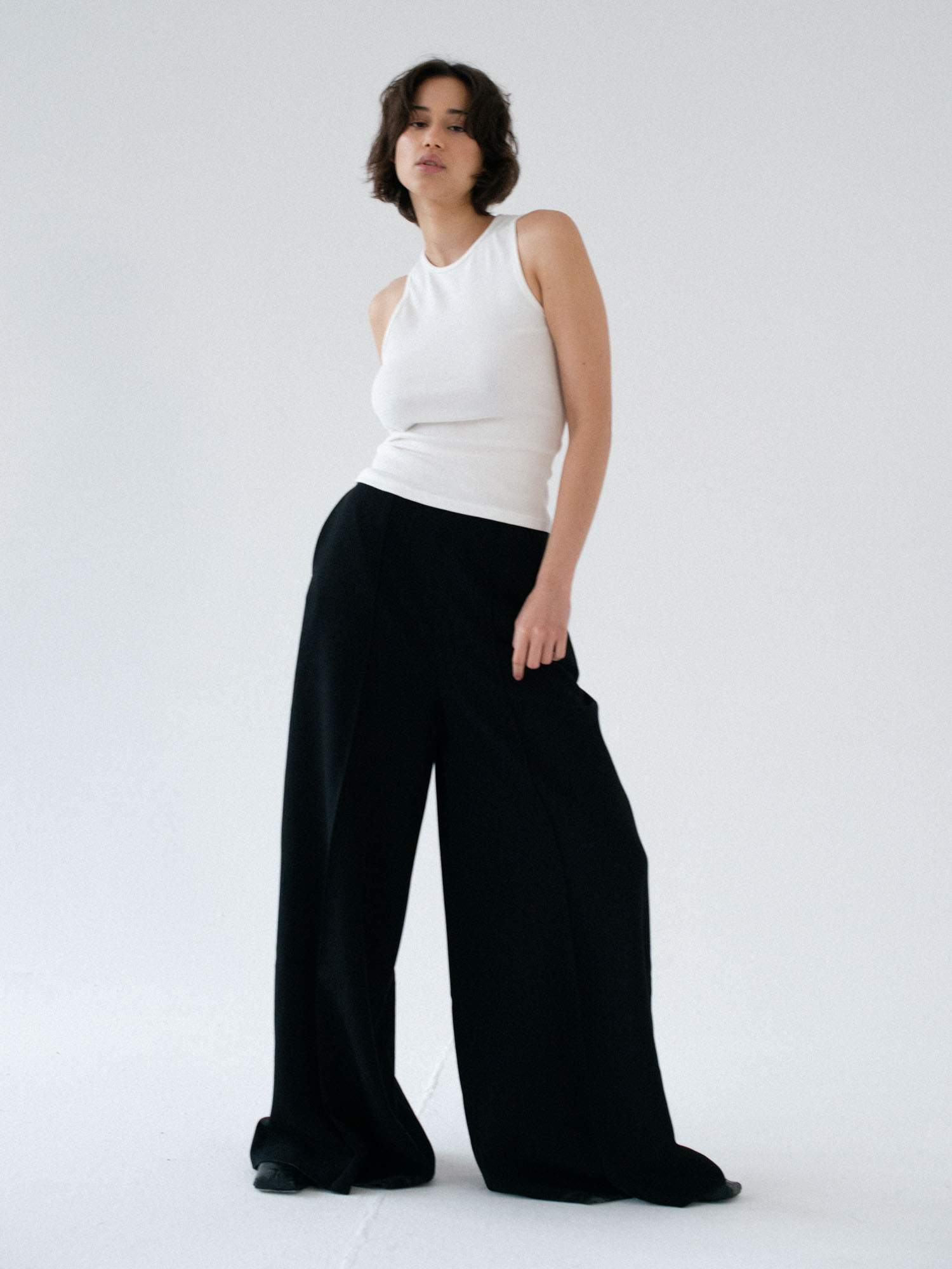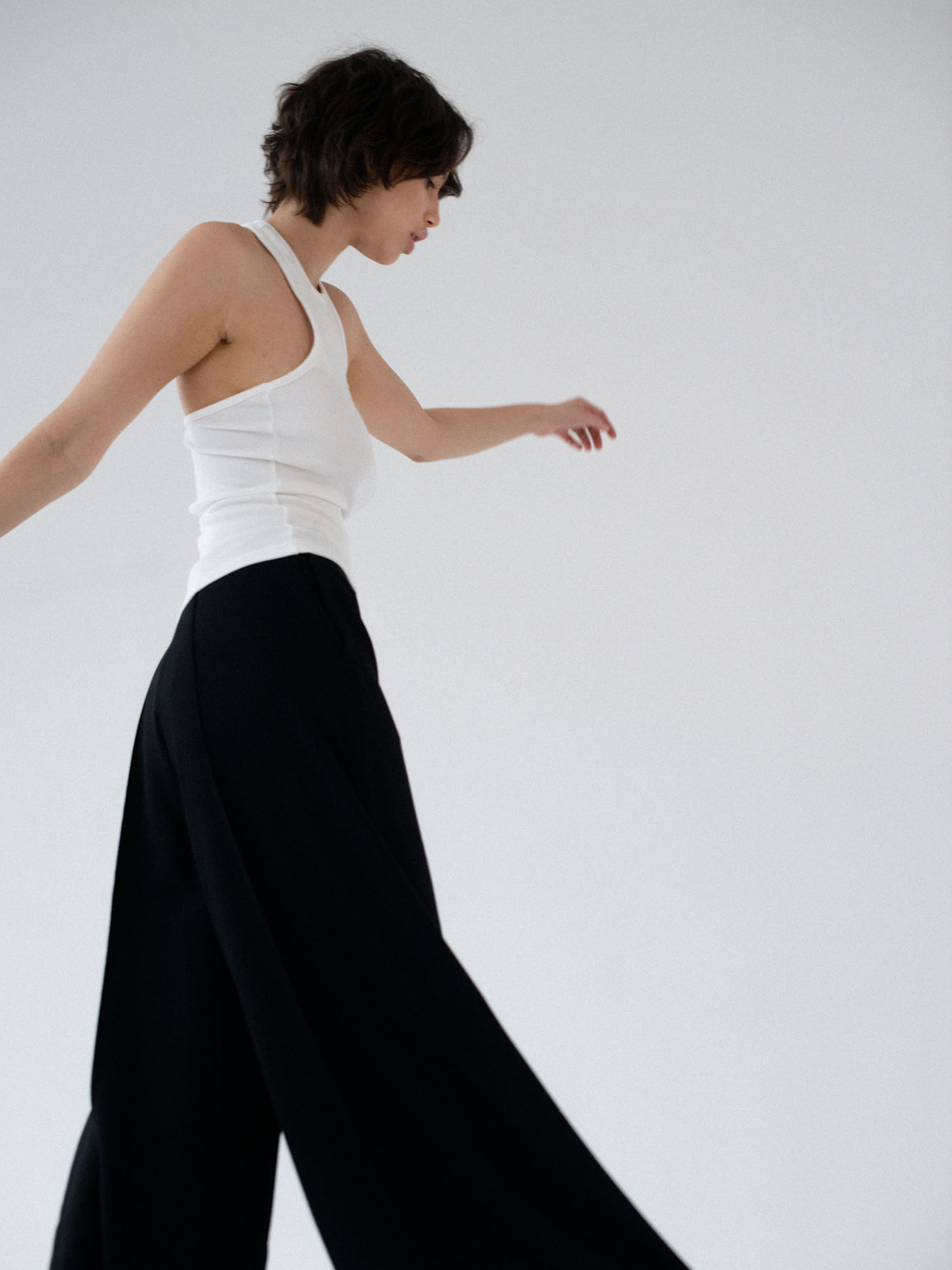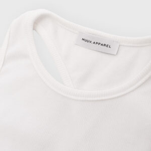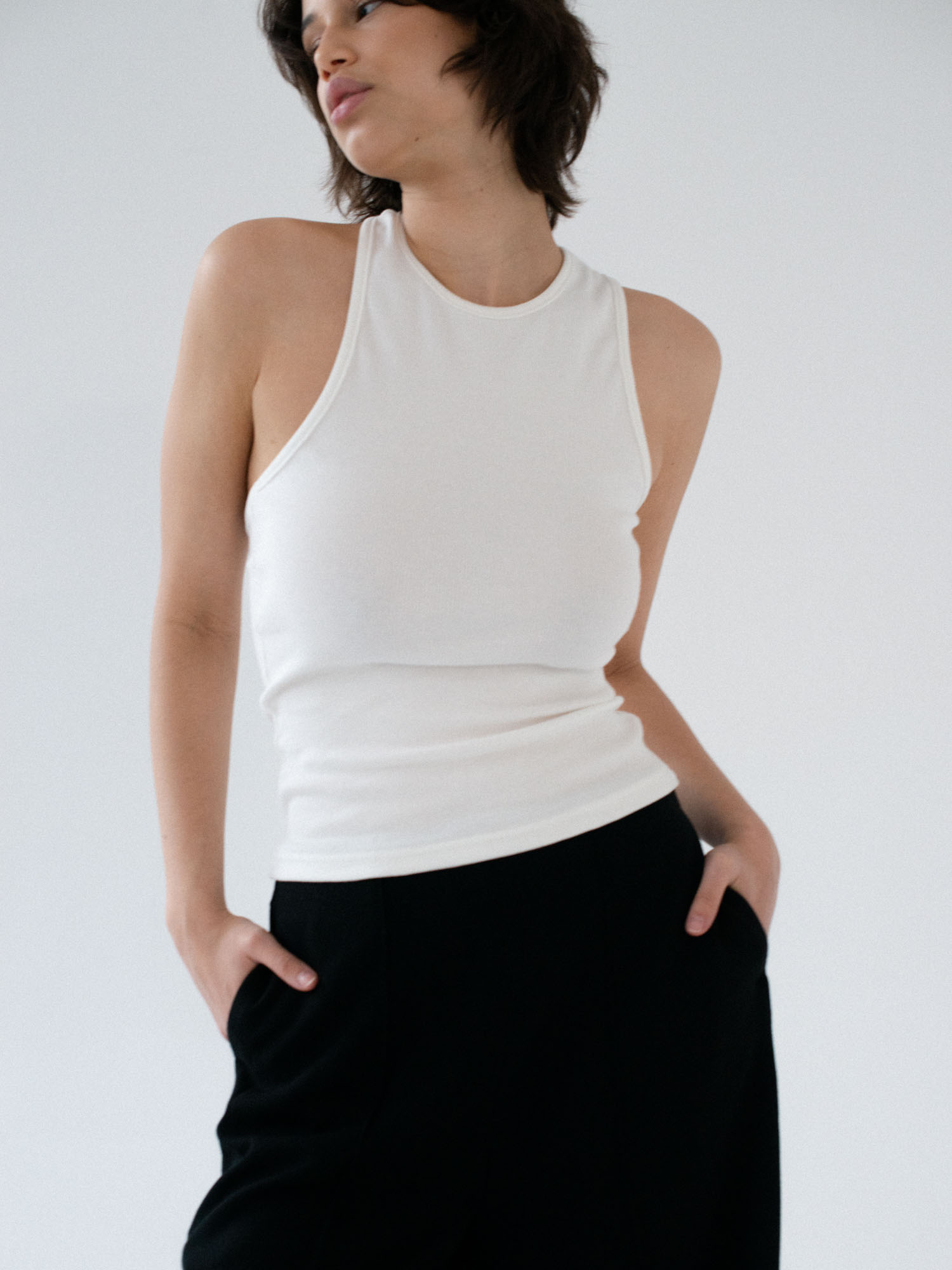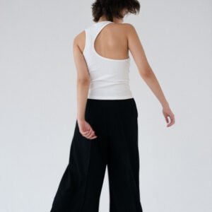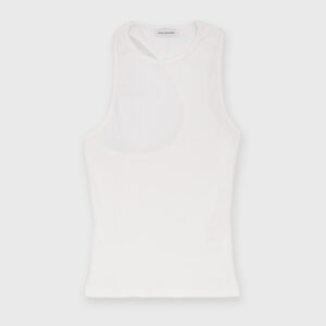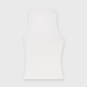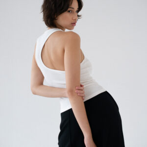 Tanktop uszyty z bawełnianego dżerseju w prążki z asymetrycznym wycięciem na plecach. Prosty krój idealnie dopasowuje się do sylwetki. Świetnie sprawdzi się z każdym rodzajem dołu.