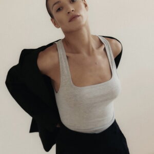 Dopasowana koszulka, na cienkich ramiączkach. Idealny basic o klasycznym kroju, z głęboko wyciętym dekoltem, który pięknie podkreśla biust. Koszulka doskonale sprawdzi się zarówno do spodni dresowych jak i jeansów. Może być też noszona jako dodatek pod sweter czy elegancką marynarkę.